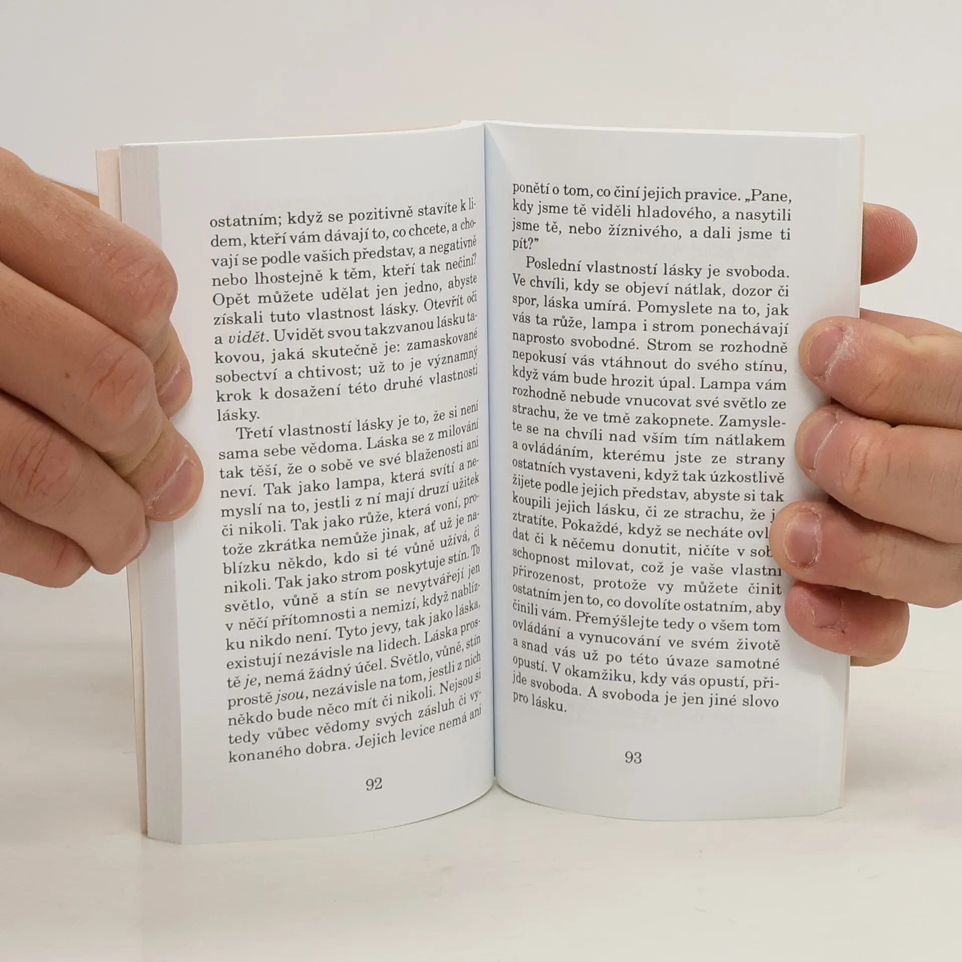 Poslední meditace Anthonyho de Mella. Kniha krátkých úvah nad vybranými texty Nového zákona. „Láska pramení z Vědomí,“ připomíná Mello. K jeho dosažení je však potřeba naučit se vidět. „A naučit se vidět, je v životě člověka nejbolestivější. Bez schopnosti vidět se láska nezrodí.“ Pouze tehdy, vidíme-li ostatní takové, jací skutečně jsou, začneme být schopni skutečně milovat. Cesta k lásce pojednává o svobodě, kterou člověk získá odproštěním se od některých nesprávných forem lásky, a tak pozná lásku skutečnou. Kniha obsahuje příběhy o něco delší než Modlitba žáby, ale i tak by se každý asi vešel na formát A4. Jednotlivé kapitoly jsou uvozeny úryvkem z evangelia, ovšem v příbězích jde o pochopení vnitřních pocitů čtenáře, o rozeznání skutečných pocitů od naučených a vnucených, případné náboženské úvahy či poznámky vyplývají nenuceně na povrch a nejsou nijak závazné. Příběhy již nejsou anekdotické, ale vyžadují aktivní spolupráci čtenáře, který je během čtení dotazován na různé pocity, analyzuje je a vyvozuje závěry, kniha ho spíše vede tokem jeho myšlenek a inspiruje neobvyklými úhly pohledu do vlastního nitra.