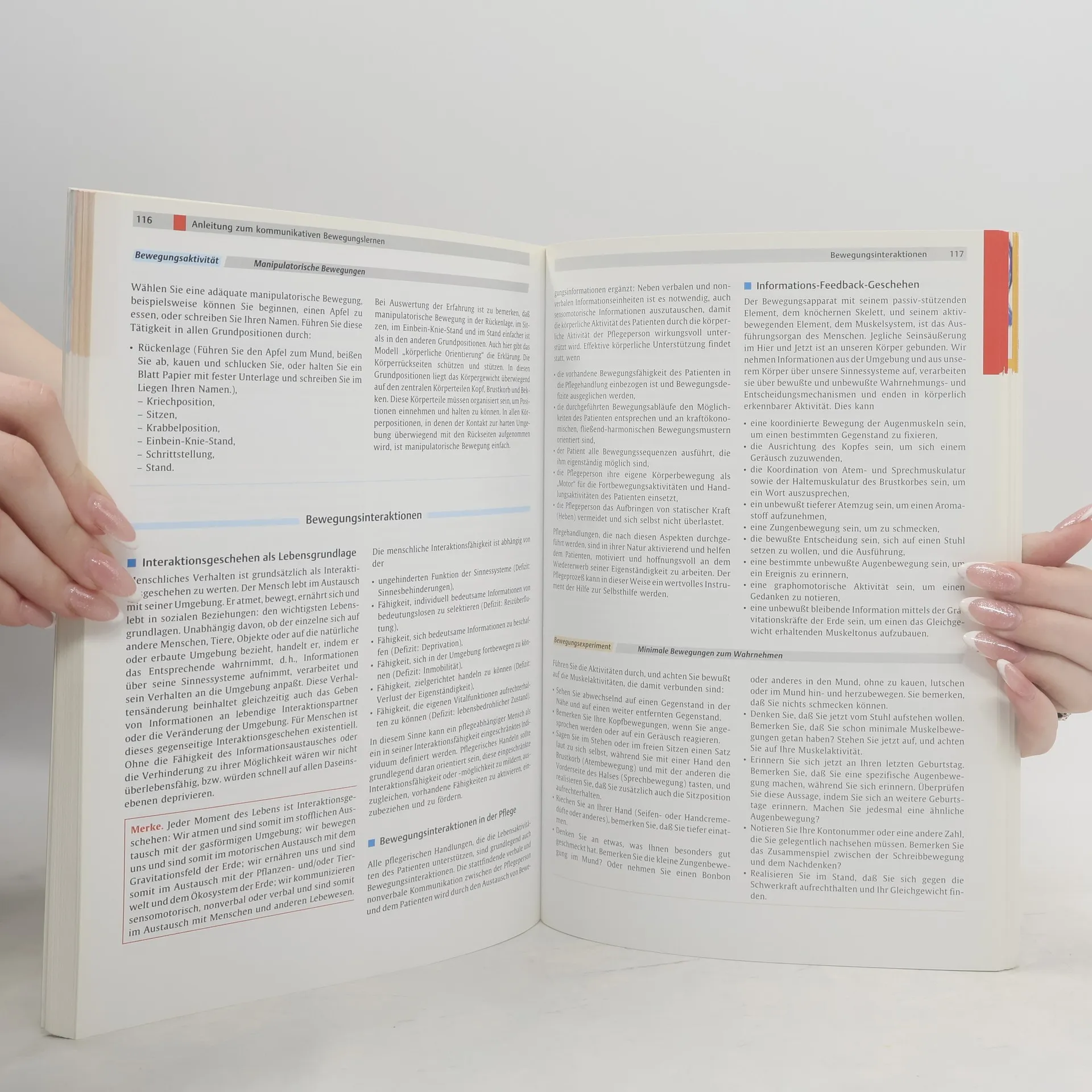 Im Beruf bewegungsökonomisch arbeiten - Kinästhetik erleben!Grundlagen von Kinästhetik und Gesundheit, Anleitung zum Bewegungslernen, Kinästhetik in der Pflege...verstehen...- den Zusammenhang von Gesundheit und Bewegung erkennen- sich rund um das Bewegungslernen informieren- die Kinästhetik in der Pflege erleben... und Bewegungsaktivität unterstützen- mit Idealtypischen Bewegungsabläufen- mit Umgebungsveränderung- mit der Entwicklung von Bewegungsmöglichkeiten zusammen mit dem Patienten