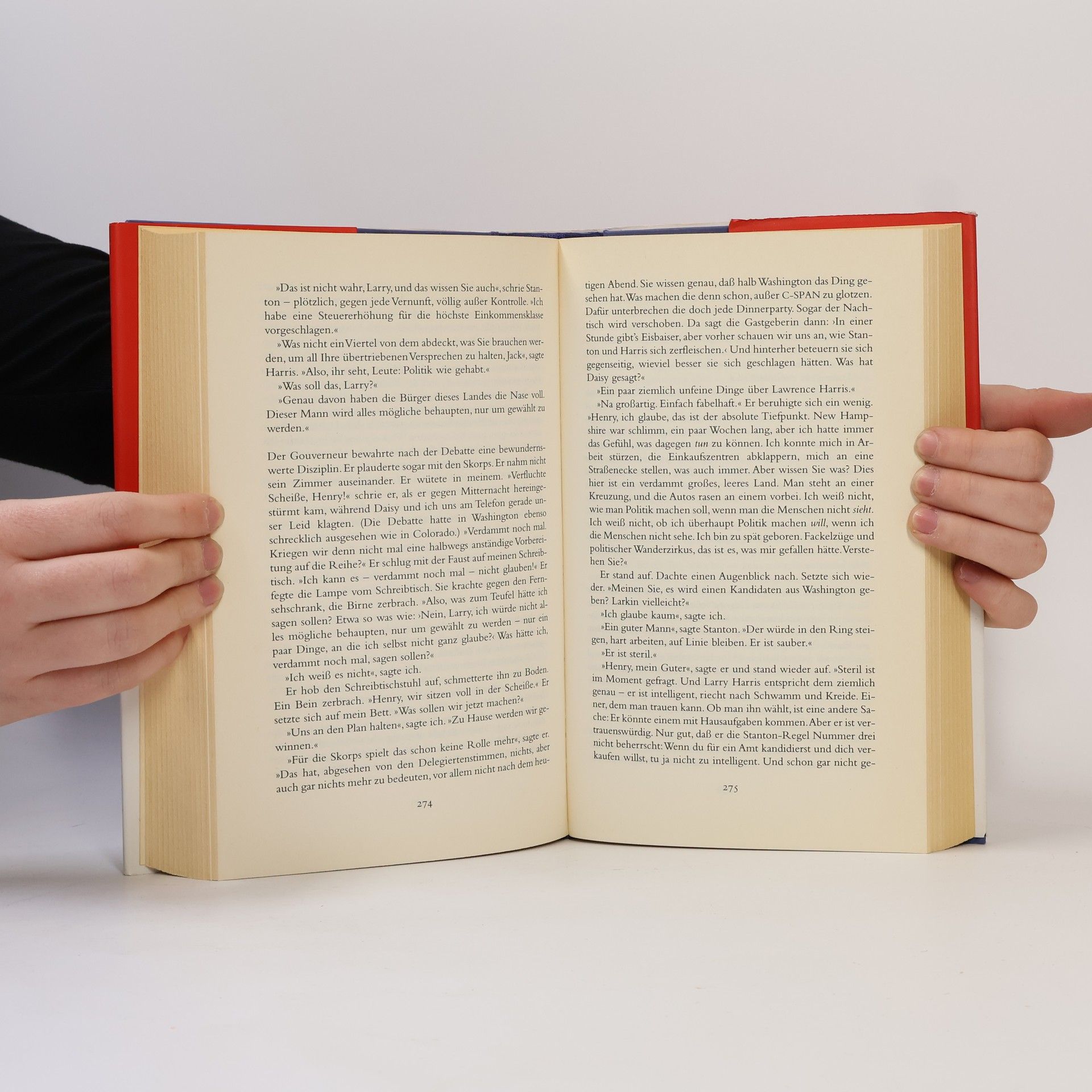 „Was hat dich bloß dazu getrieben, so nen blöden Termin anzusetzen? Wenn wir ihn dieses Wochenende rausziehen, ist er Montag in Los Angeles und vor Dienstag nicht zurück. Wir haben noch zwölf Tage, und du willst ein Drittel davon opfern?« »Vermutlich bleibt uns nichts anderes übrig«, sagte ich. »Kannst du dafür sorgen, dass ein Arzt da ist, wenn wir kommen?« »Wie lange braucht ihr?« »Halbe Stunde.« »Hey«, rief er ins Wahlkampfbüro, »haben wir hier vertrauenswürdige Ärzte?« Der Arzt, Myron Milburn, stellte bei Governor Stanton eine schwere Bronchitis fest und verordnete strikte Bettruhe. »Ich habe dem Gouverneur klar gesagt, dass er eine Lungenentzündung riskiert, wenn er sich nicht hinlegt und ein paar Tage ausruht. Sie hätten ohnehin nicht viel von ihm.« Er sprach zu mir, Richard, Brad Lieberman und Lucille, als würden wir Jack Stanton zu etwas zwingen. »Seine Stimme ist weg. Er darf die nächsten achtundvierzig Stunden nicht sprechen. Das ist ärztliche Anordnung.« Susan beschloss, dass wir abreisen würden. Am nächsten Morgen brachen wir früh auf. Das Team zerstreute sich: Howard und Lucille kehrten nach New York zurück, Richard, Arlen und Daisy nach Washington. Brad Lieberman blieb in Manchester und schickte Wahlkampfhelfer aus, die Stanton-Videos verteilten. Ich kehrte mit den Stantons und Onkel Charlie nach Mammoth Falls zurück. Es war wie in alten Zeiten – die Erinnerungen an die Anfänge und die Aufbruchsstimmung waren zut