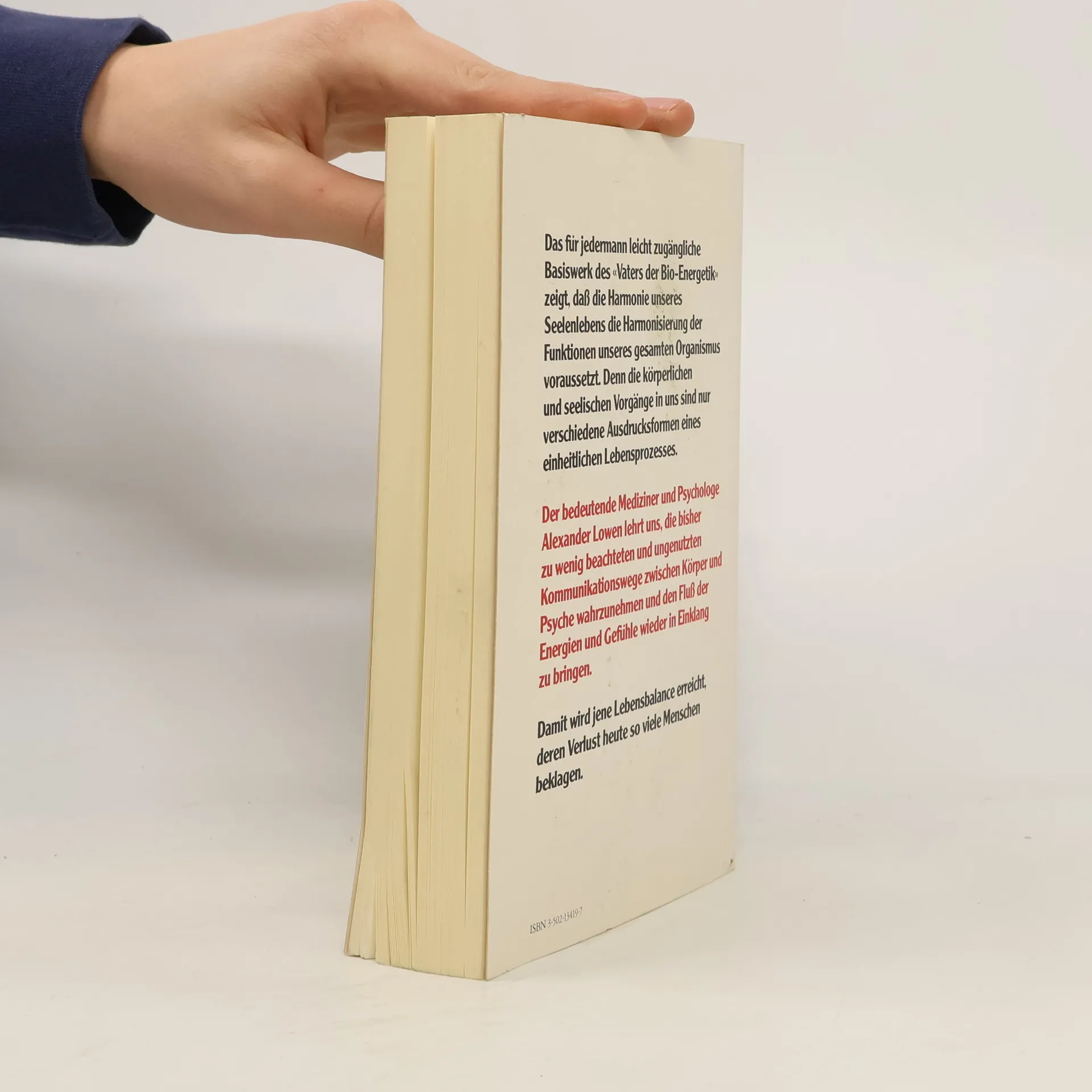 Alexander Lowen geht davon aus, dass alle körperlichen und seelischen Vorgänge nur verschiedene Ausdrucksformen eines einzigen, einheitlichen Lebensprozesses sind. Sobald sich der Mensch seines Körpers wirklich bewusst wird, mit ihm «arbeitet», ihn «erlebt», gewinnt er ein völlig neues Verhältnis zu sich selbst und wird auch Angstzustände und Stresssituationen überwinden. Dieses Buch ist das Basiswerk des «Vaters der Bioenergetik». Es hat vielen Menschen Mut gemacht, sich mit ihrem eigenen Körpergefühl auseinanderzusetzen und die Abhängigkeit des seelischen Gleichgewichts vom körperlichen Wohlbefinden zu akzeptieren.