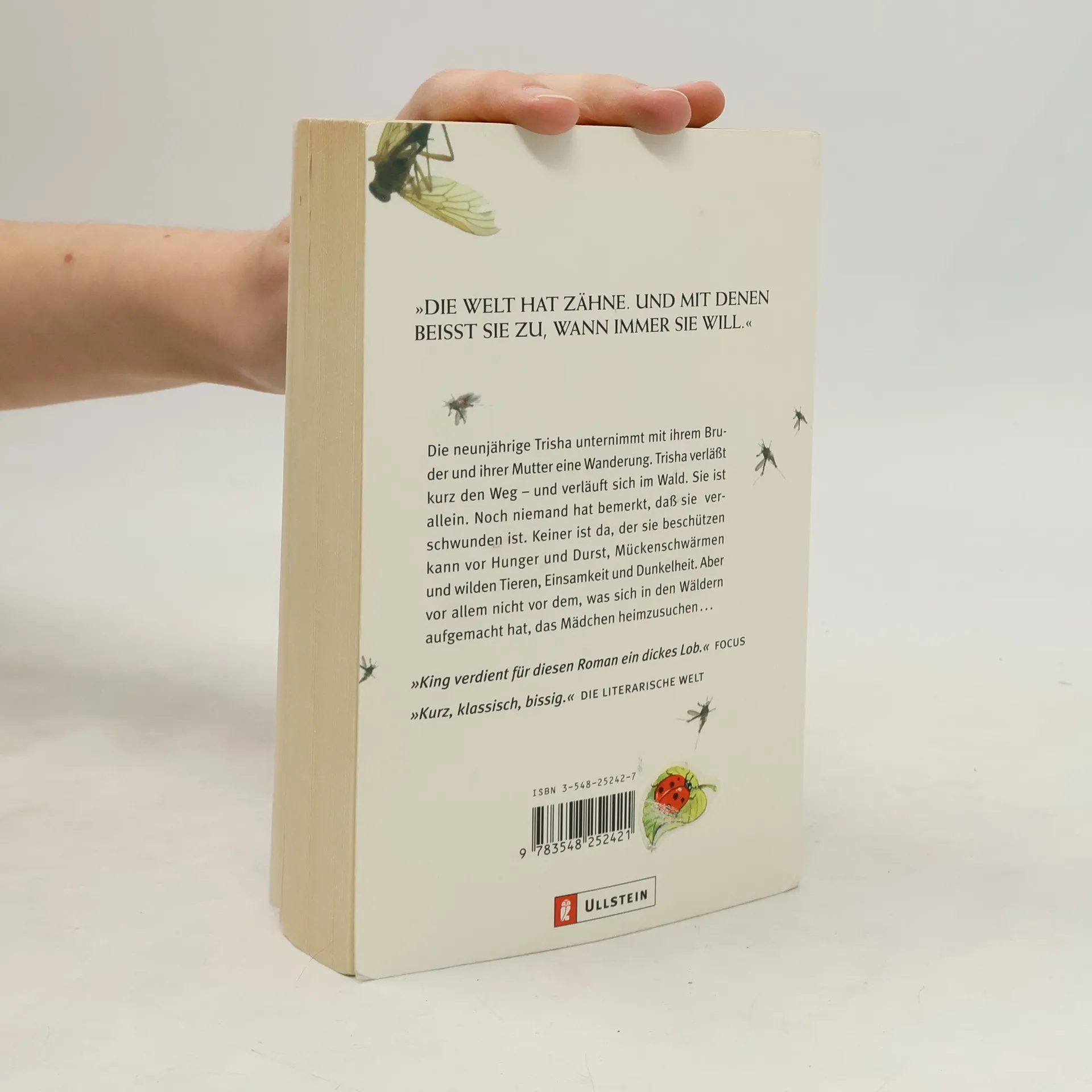»Die Welt hat Zähne. Und mit denen beißt sie zu, wann immer sie will.« Die neunjährige Trisha unternimmt mit ihrem Bruder und ihrer Mutter eine Wanderung. Trisha verlässt kurz den Weg - und verläuft sich im Wald. Sie ist allein. Noch niemand hat bemerkt, dass sie verschwunden ist. Keiner ist da, der sie beschützen kann - vor Hunger und Durst, Mückenschwärmen und wilden Tieren, Einsamkeit und Dunkelheit. Aber vor allem nicht vor dem, was sich in den Wäldern aufgemacht hat, die Neunjährige heimzusuchen...