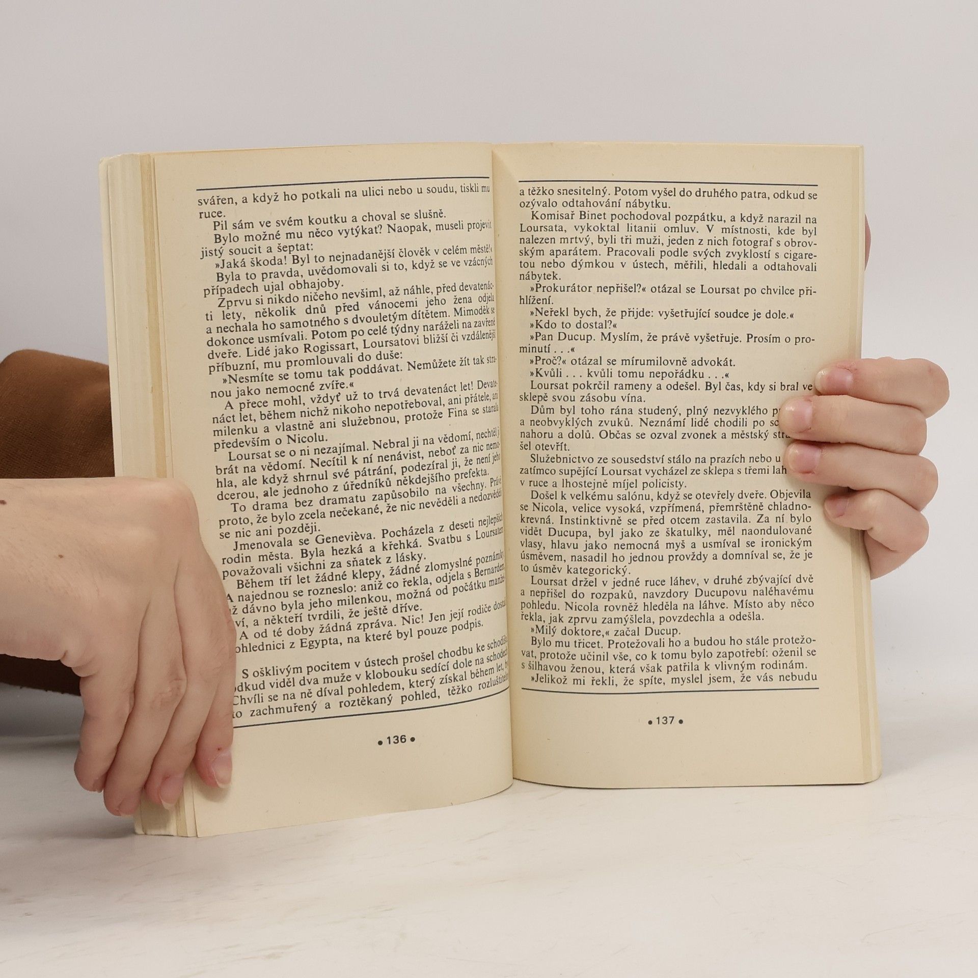 Skvělou psychologickou studii dvou starých lidí vytvořil G. Simenon v novele Kočka, jejíž děj se odvíjí v chátrajícím domě na okraji Paříže. Muž a žena spolu žijí v manželství uzavřeném ze strachu před osamělostí. Jejich soužití se však záhy stalo utrpením; nebyli ze stejné společenské vrstvy, každý měl své zafixované celoživotní návyky. Jejich neshody vyústí v roztržku, když žena otráví manželova milovaného kocoura a on se jí pomstí na jejím papouškovi. Druhý příběh začíná dramaticky: advokát Loursat, který žije podivínským životem sám se svou dcerou, uslyší v noci výstřel a objeví ve druhém patře svého domu mrtvolu neznámého muže. Brzy se ukáže, že Loursatova dcera se již několik měsíců scházela – bez otcova vědomí – s partou přátel v otcově domě, kde pořádala večírky a pitky. Zatrpklý bručoun Loursat se ujímá vyšetřování případu a zvolna znovu navazuje kontakt se světem.