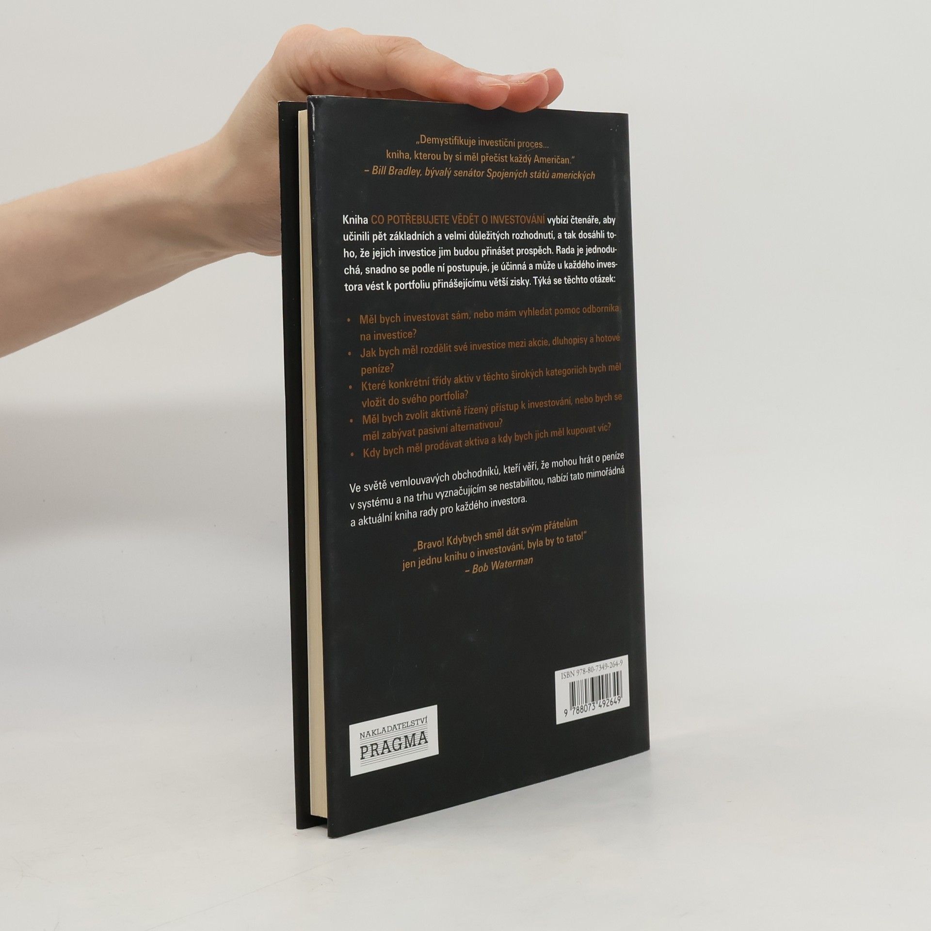 Autoři chtějí změnit způsob, jakým uvažujete o investování. Je jasné, že tradiční oblast finančních služeb selhává ve správné službě investorům. Tato jejich kniha tak ovlivní způsob, jakým se vybíráte finanční poradce, investujete své peníze a hodnotíte své výsledky. Kniha vybízí čtenáře, aby učinili pět základních a velmi důležitých rozhodnutí, a tak dosáhli toho, že jejich investice budou nést zisk. Ve světě vemlouvavých obchodníků, kteří věří, že mohou hrát o peníze v systému a na trhu vyznačujícím se nestabilitou, nabízí tato mimořádná a aktuální kniha srozumitelně formulované rady pro všechny investory – od začátečníků po ty zkušené.
