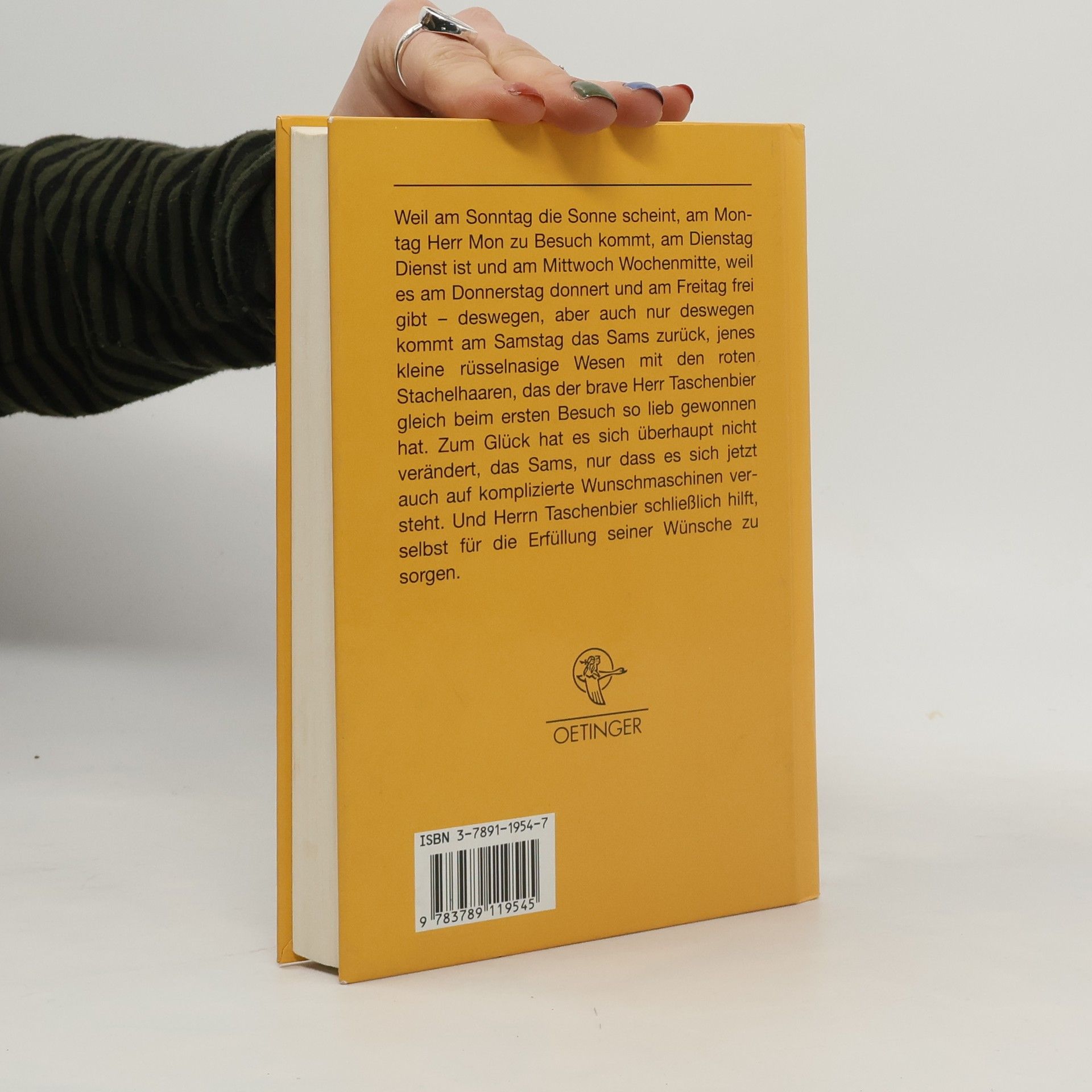 Am Sonntag scheint die Sonne, am Montag kommt Herr Mon zu Besuch, am Dienstag ist Dienst, und am Mittwoch ist Wochenmitte. Am Donnerstag donnert es, und am Freitag gibt es frei. Nur deshalb kehrt am Samstag das Sams zurück, das kleine rüsselnasige Wesen mit den roten Stachelhaaren, das der brave Herr Taschenbier beim ersten Besuch sofort ins Herz geschlossen hat. Glücklicherweise hat das Sams sich nicht verändert, es versteht sich jetzt jedoch auch auf komplizierte Wunschmaschinen und hilft Herrn Taschenbier, seine eigenen Wünsche zu erfüllen. Die humorvollen Kinderbücher rund um das liebenswerte Sams sind Klassiker der deutschen Kinderliteratur, ideal zum Vorlesen und Selbstlesen für Kinder ab 7 Jahren. Das freche Wesen lehrt Herrn Taschenbier, sein Leben selbstbewusst und unabhängig zu leben, egal was andere denken. Der zweite Band der Reihe wird bis heute fortgeschrieben. Die Sams-Reihe ist sowohl mit den Original-Illustrationen von Paul Maar als auch modern interpretiert von Nina Dulleck erhältlich. Die Bände umfassen: Eine Woche voller Samstage, Am Samstag kam das Sams zurück, Neue Punkte für das Sams, Ein Sams für Martin Taschenbier, Sams in Gefahr, Onkel Alwin und das Sams, Sams im Glück, Ein Sams zu viel, Das Sams feiert Weihnachten, Das Sams und der blaue Drache sowie Das Sams und die große Weihnachtssuche.