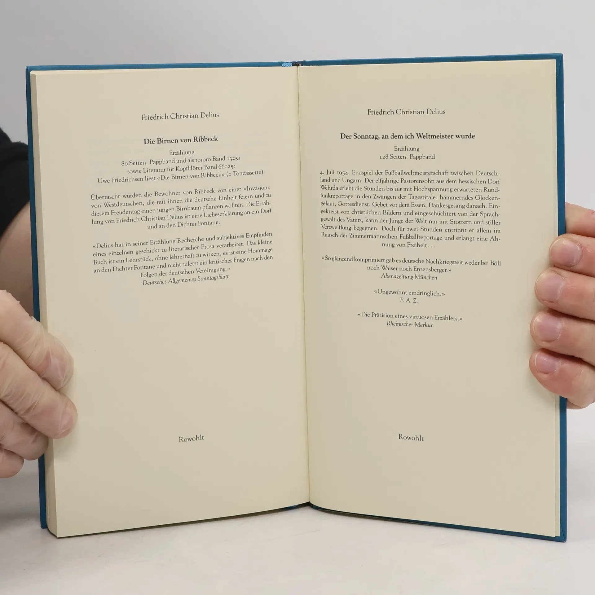 Friedrich Christian Delius, geboren 1943 in Rom, gestorben 2022 in Berlin, wuchs in Hessen auf und lebte seit 1963 in Berlin. Zuletzt erschienen der Roman „Wenn die Chinesen Rügen kaufen, dann denkt an mich“ (2019) und der Erzählungsband „Die sieben Sprachen des Schweigens“ (2021). Delius wurde unter anderem mit dem Fontane-Preis, dem Joseph-Breitbach-Preis und dem Georg-Büchner-Preis geehrt. Seine Werkausgabe im Rowohlt Taschenbuch Verlag umfasst derzeit neunzehn Bände.