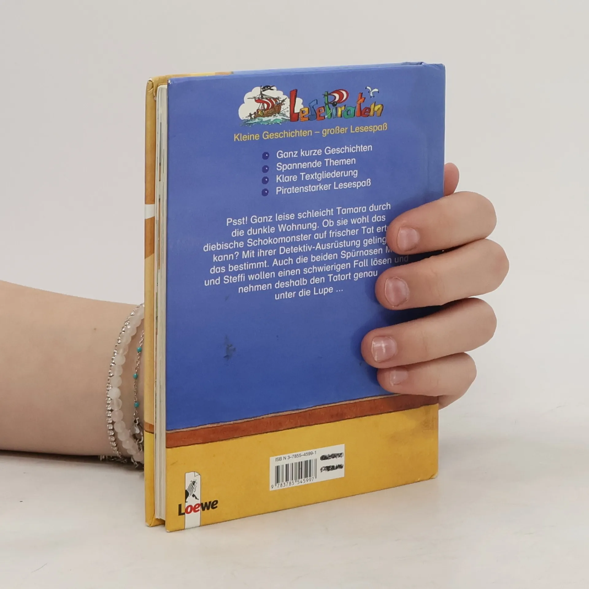 Lesealter ab 7 3. Stufe der Loewe-Leseleiter Ganz kurze Geschichten Einfache Textgliederung Psst! Ganz leise schleicht Tamara durch die dunkle Wohnung. Ob sie wohl das diebische Schokomonster auf frischer Tat ertappen kann? Mit ihrer Detektiv-Ausrüstung gelingt ihr das bestimmt. Auch die beiden Spürnasen Moni und Steffi wollen einen schwierigen Fall lösen und nehmen deshalb den Tatort genau unter die Lupe.