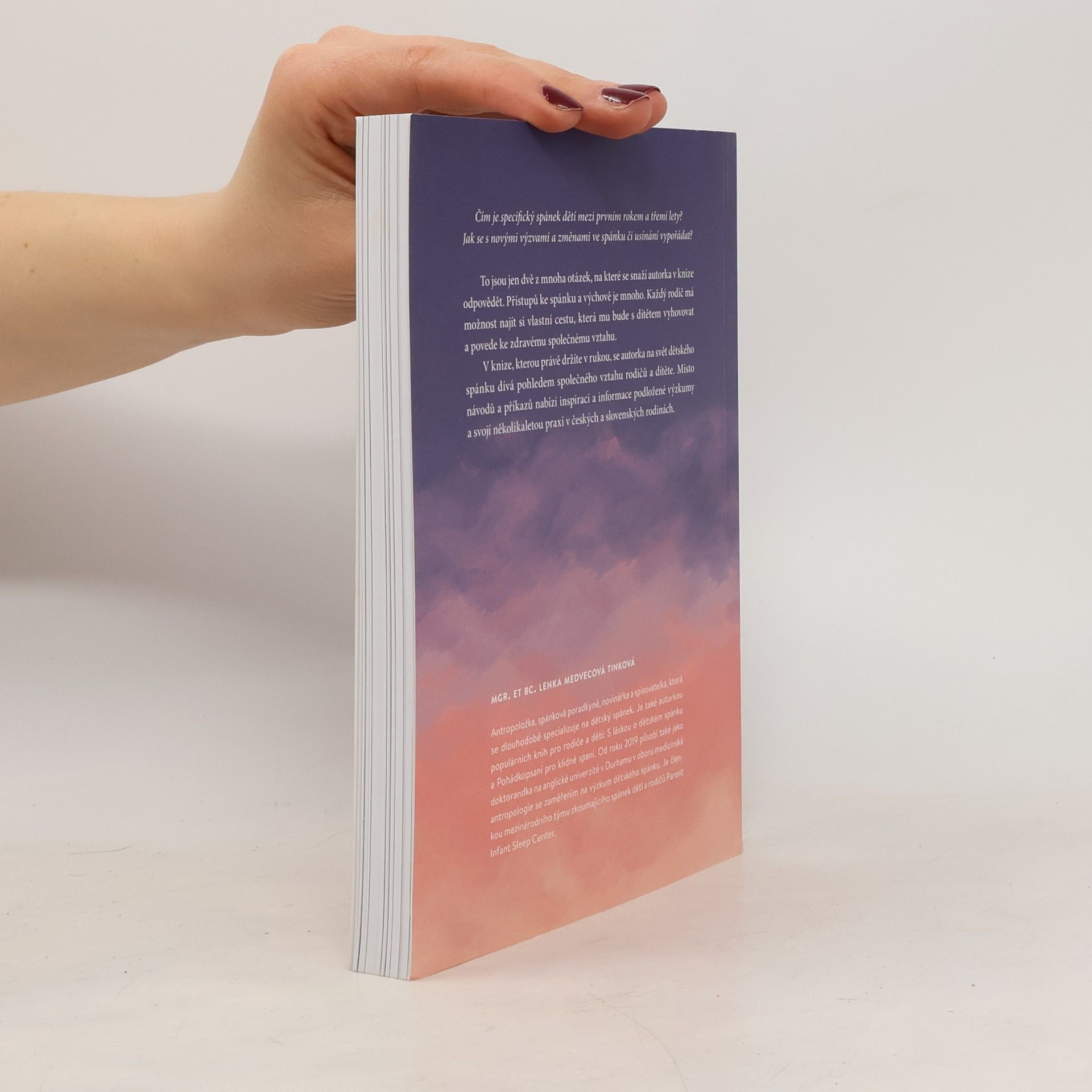 Praktický průvodce spánkem a usínáním dětí od 1 - 3 let. Nejdramatičtějším ve vývoji člověka je prý přechod od miminka k dítěti. Právě batolecí období mezi 1-3 rokem je proto plný nových výzev také ve spánku a usínání. Už to nejsou úplně malá miminka, ale přesto ještě nejsou samostatnými dětmi. Čeká je spousta změn.Někdy mám pocit, jakoby v celém tom laskavém přístupu k miminkům chybělo další pokračování. Je nám jasné, že miminko nepláče bez příčiny, že potřebuje naši péči, i naši reakci na jeho pláč. Víme, jak důležité je dotýkat se ho, mazlit, nosit, mít ho u sebe na blízku. Jenže jak je to se staršími dětmi?Proč se tak brání usínání, když na něm je zjevně vidět únava?Dá se vůbec posunout velmi pozdní usínání?Jak ukončit - změnit styl usínání, kojením či nošením, citlivě nebo to přijde samo?Jak změnit styl usínání, které sice dítěti vyhovuje, ale nás už ničí a potřebujeme akutní změnu? Kdy už dítě nepotřebuje přes den spát?Proč se vlastně ještě některé děti mezi 1-3 rokem budí nebo se právě v tomto období budit začnou?Jak uspávat dvě děti najednou – jde to vůbec?Dá se sladit spánek sourozenců?Takové dotazy dostávám denně. Proto teď čtete tyto řádky. Odpovědi se nevejdou do jednoho článku. Sepsala jsem vám vše do knihy, propletla příběhy z praxe a doplnila praktickými tipy, terapeutickými pohádkami, večerním uvolňujícím cvičením nebo také třeba akčním plánem pro maminky.