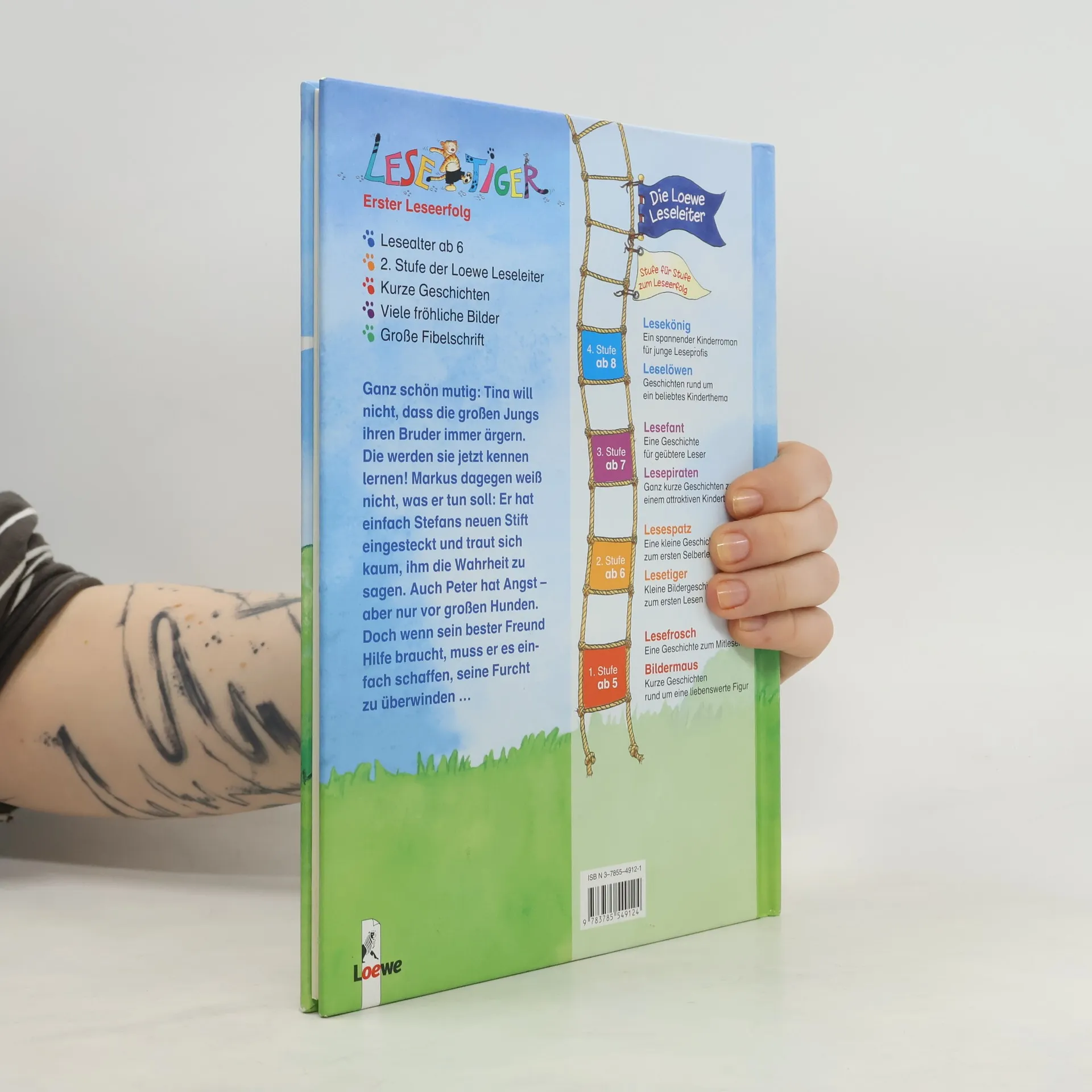 Lesealter ab 6 2. Stufe der Loewe-Leseleiter Kurze Geschichte Viele fröhliche Bilder Große Fibelschrift Ganz schön mutig: Tina will nicht, dass die großen Jungs ihren Bruder noch länger ärgern. Die werden sie jetzt kennen lernen! Markus dagegen weiß nicht, was er tun soll: Er hat einfach Stefans neuen Stift eingesteckt und traut sich kaum, ihm die Wahrheit zu sagen. Auch Peter hat Angst - aber nur vor großen Hunden. Doch wenn sein bester Freund Hilfe braucht, muss er es einfach schaffen, seine Furcht zu überwinden.