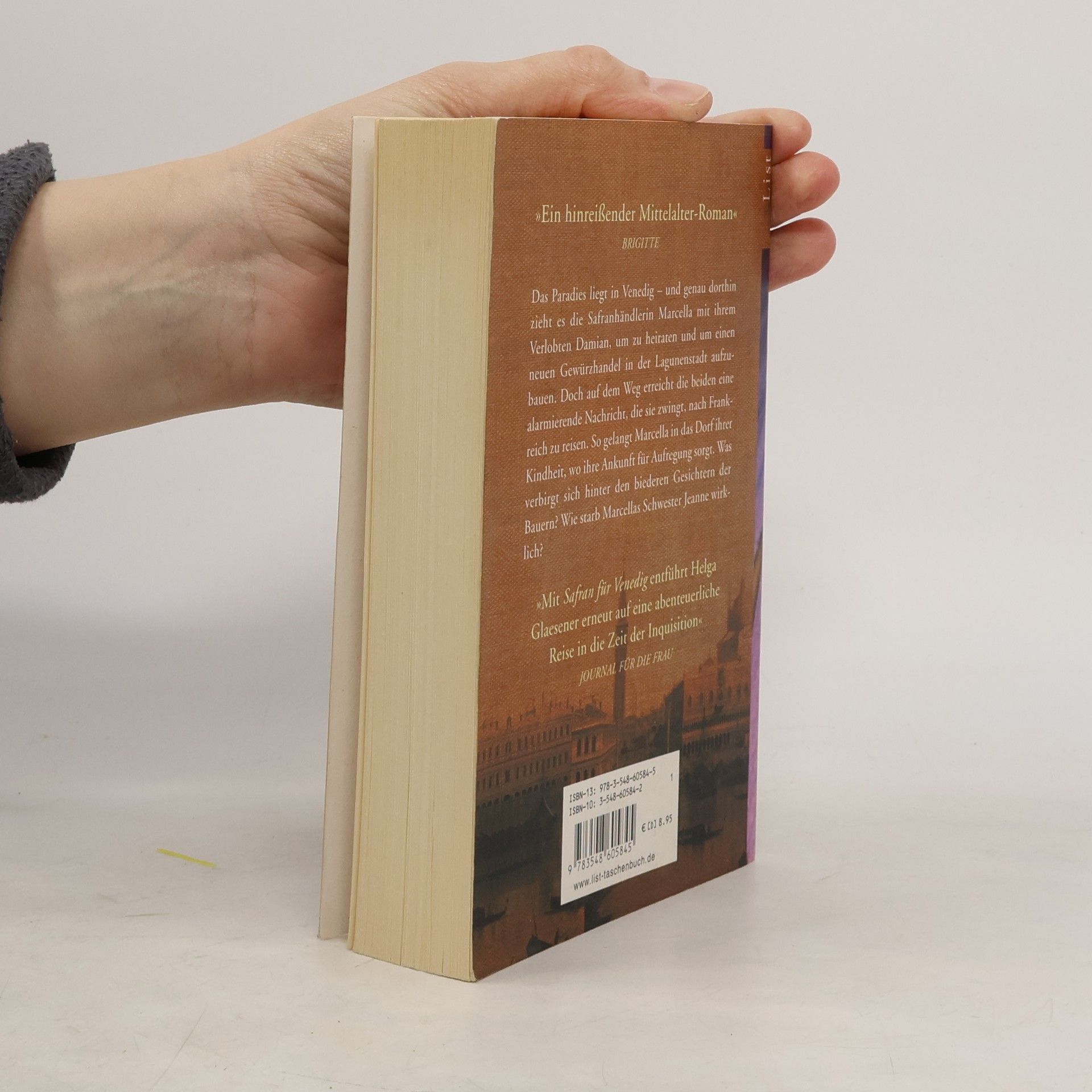 Das Paradies liegt in Venedig, und die Safranhändlerin Marcella zieht mit ihrem Verlobten Damian dorthin, um zu heiraten und einen neuen Gewürzhandel aufzubauen. Doch eine alarmierende Nachricht zwingt sie, nach Frankreich zu reisen. In ihrem Heimatdorf, wo ihre Ankunft für Aufregung sorgt, stellt sich die Frage, was hinter den biederen Gesichtern der Bauern steckt und wie Marcellas Schwester Jeanne wirklich starb. Im Herbst 1327 sind Marcella und Damian auf dem Weg nach Venedig, als Damian erfährt, dass sein Handelskontor in Narbonne massive Verluste erleidet. Er überredet Marcella, ihn nach Frankreich zu begleiten, um die Situation zu klären. Bald wird klar, dass er keinem seiner Mitarbeiter trauen kann. Ein frommer Bürger stirbt unerwartet, und die Suche nach dem Betrüger und Mörder führt das Paar in Marcellas Heimatdorf, das sie einst hastig verlassen musste. Bei ihren Nachforschungen über Jeanne stoßen sie auf eine Mauer des Schweigens. Als ihre alte Amme, die möglicherweise wichtige Informationen hat, im Badehaus ermordet wird, gerät auch Damian in Lebensgefahr. In ihrem ehemaligen Elternhaus erkennt Marcella schließlich, wer die Fäden zog – jemand, der vor nichts zurückschreckt.