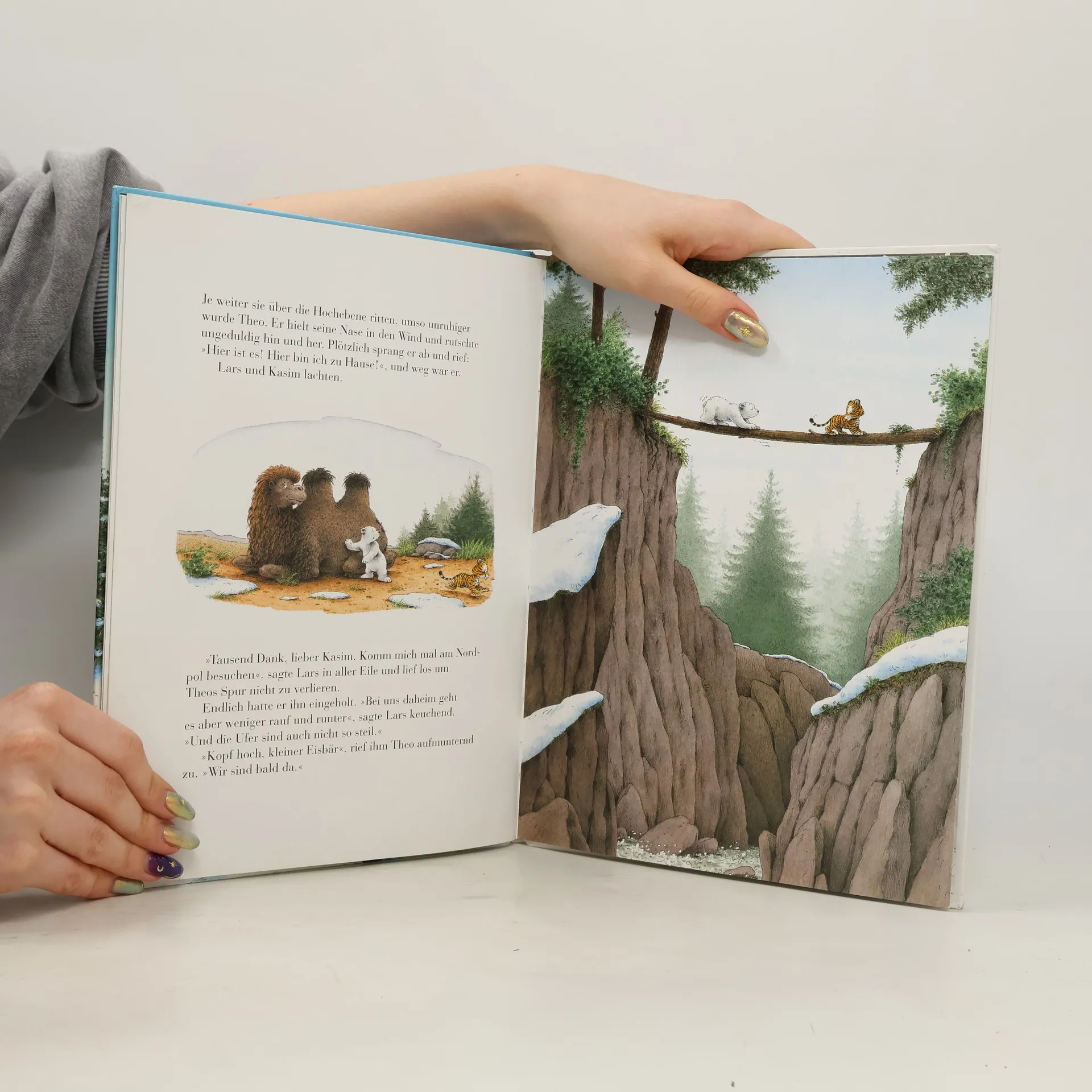 Lars, der kleine Eisbär, trifft unerwartet auf Theo, den kleinen Sibirischen Tiger. Der ist – weit weg von seinen Eltern – völlig verzweifelt. Lars tröstet ihn und hilft ihm den Heimweg zu finden, denn Lars weiß, wie das geht: Er hat sich ja selbst schon oft verlaufen und immer wieder nach Hause gefunden. Zuerst reisen sie versteckt in einem Güterwagen, später irren sie zu Fuß in einem Schneesturm durch große Wälder. Sie überqueren Flüsse und Schluchten, sind froh, dass ihnen eine Schnee-Eule weiterhilft, und reiten gerne auch ein Stück Weg mit Kasim, dem Kamel. Und auf einmal, als Theo die Nase in den Wind hält und schnuppert, riecht es ganz gewaltig nach Zuhause. Theos Eltern sind sehr glücklich, Theo und seinen weißen Bärenfreund zu sehen, und als der Tigervater Lars dann wieder nach Hause bringt, freut sich auch der kleine Eisbär sehr auf das heimatliche Meer.