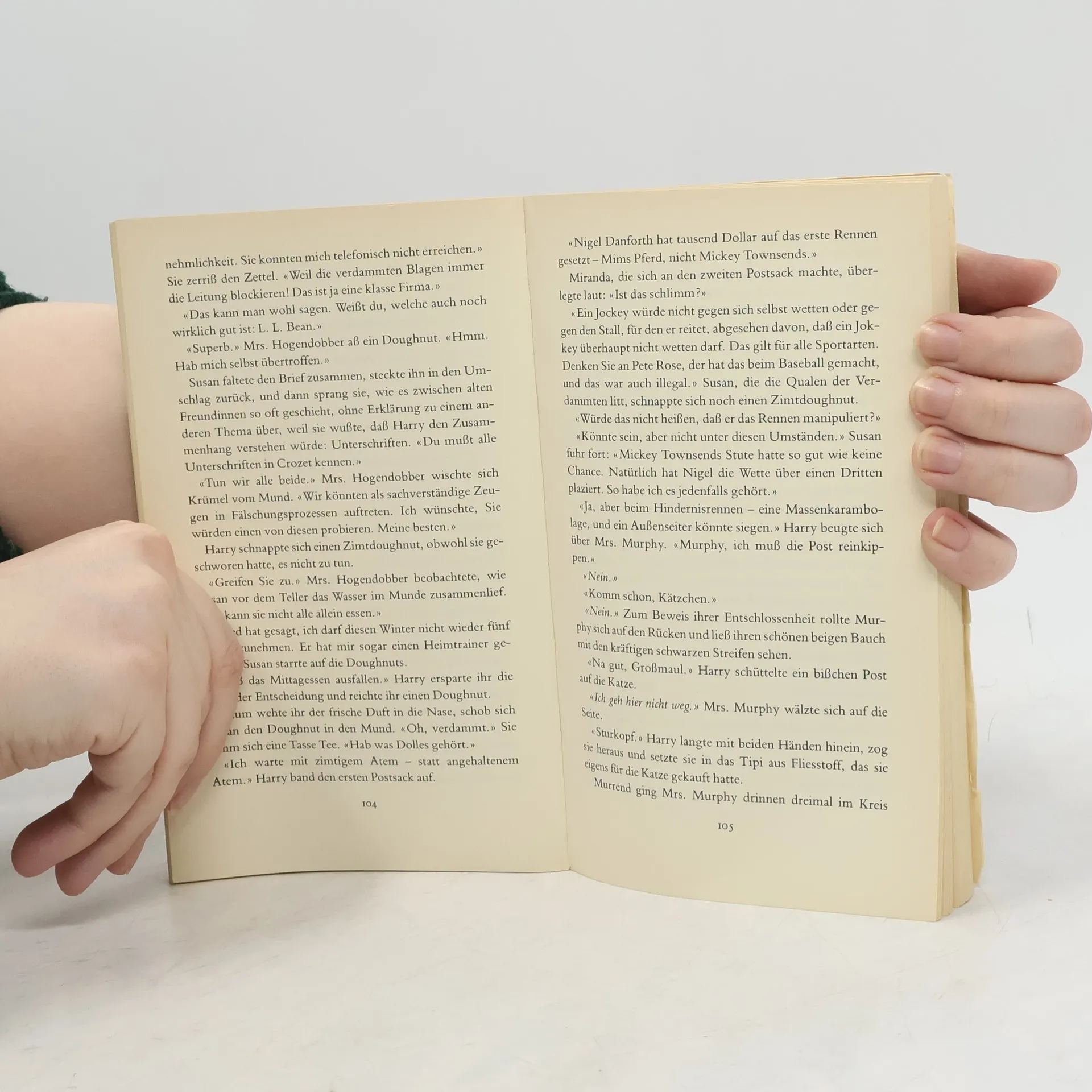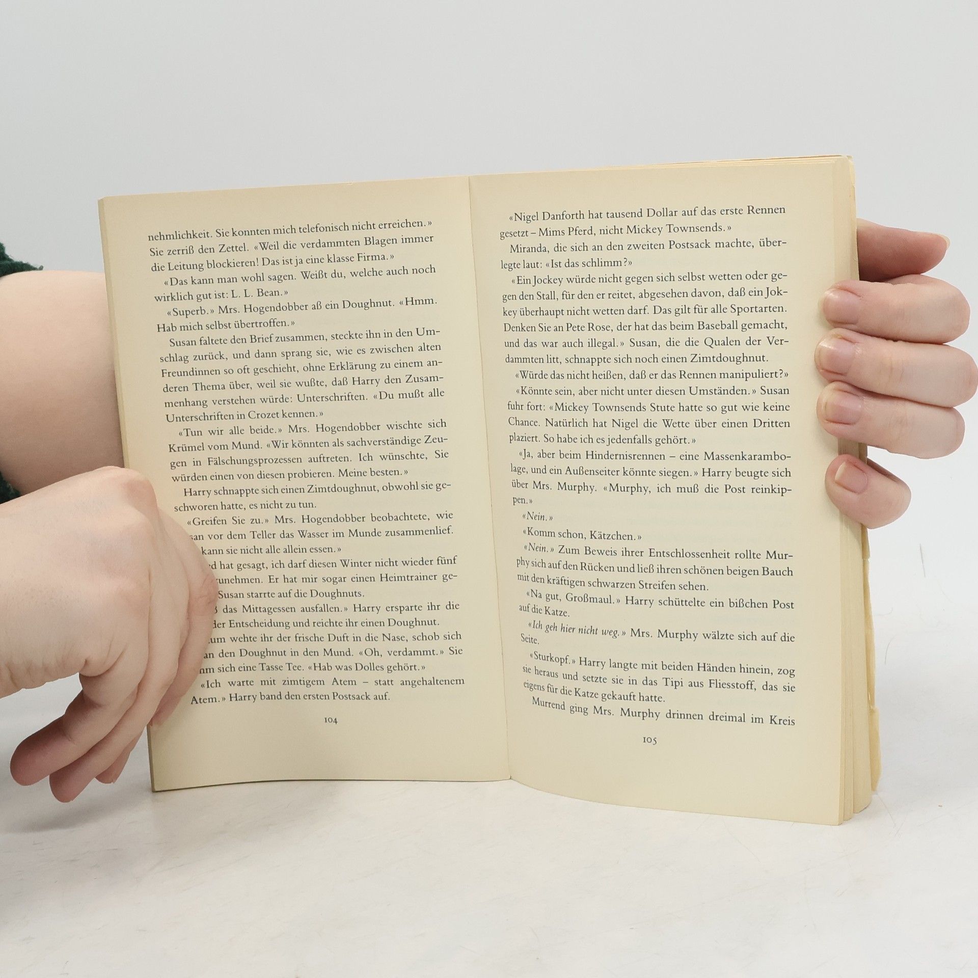 'Zwei Jockeys ermordet im Rennstall ist die Hölle los! Um die grausige Wahrheit ans Licht zu bringen, schnüffelt Mrs. Murphy herum, die Tigerkatze mit dem tollen Riecher, samtpfötige Serienheldin der US-Starautorin. Neuer Fall, neues Katzenkrimiglück.' (Hörzu)