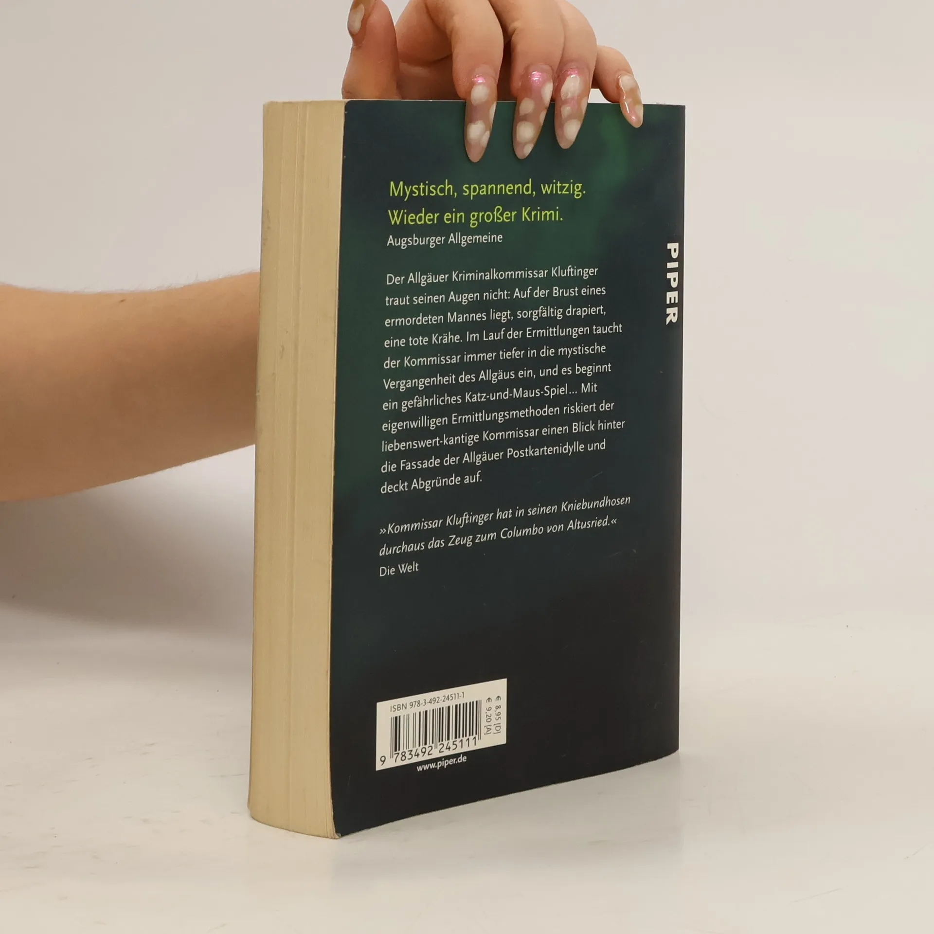 Der Allgäuer Kriminalkommissar Kluftinger traut seinen Augen nicht: Auf der Brust eines toten Mannes in einem Wald bei Kempten liegt, sorgfältig drapiert, eine tote Krähe. Im Lauf der Ermittlungen taucht der Kommissar immer tiefer in die mystische Vergangenheit des Allgäus ein, und es beginnt ein Katz-und-Maus-Spiel mit dem Mörder, bei dem die Zeit gegen ihn arbeitet. Denn alle Zeichen sprechen dafür, dass das Morden weitergeht … Mit eigenwilligen Ermittlungsmethoden riskiert der liebenswert-kantige Kommissar einen Blick hinter die Fassade der Allgäuer Postkartenidylle und deckt Abgründe auf.