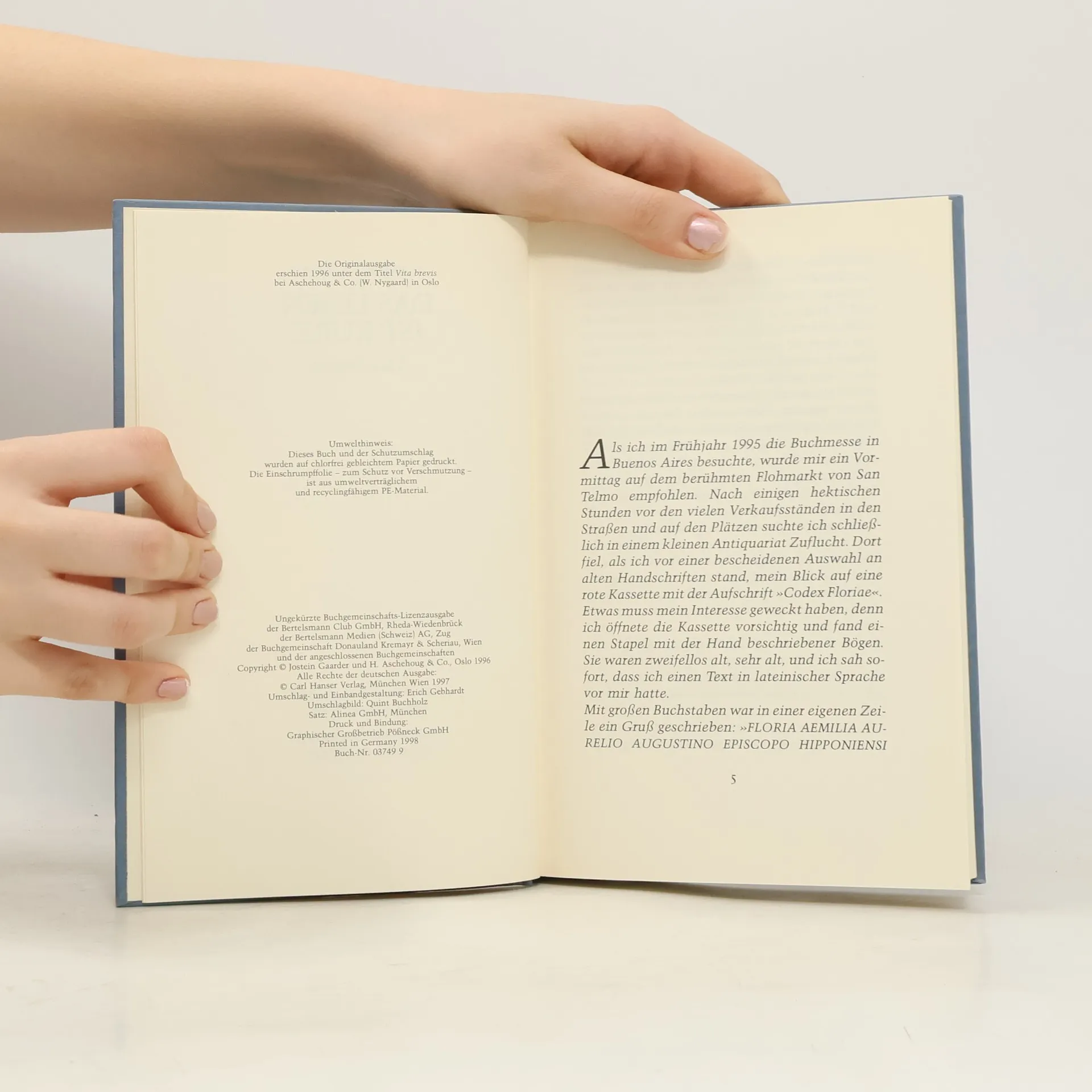Jostein Gaarders Buch ist der Brief einer Frau namens Floria an den heiligen Augustinus, der sich nach einem zunächst weltlichen Leben ganz und gar dem christlichen Glauben zugewandt hatte und später zum Bischof ernannt wurde. Floria war eine der Geliebten des Augustinus, der vor seiner Bekehrung ein lebenshungriger, junger Mann war und mit Floria sogar ein Kind hatte. Ihre drängenden Fragen, warum das, was zwischen ihnen war, plötzlich Sünde sei oder warum die Liebe zu Gott die Liebe zu einer Frau ausschließe, geben uns heute Stoff für heftige Diskussionen.
