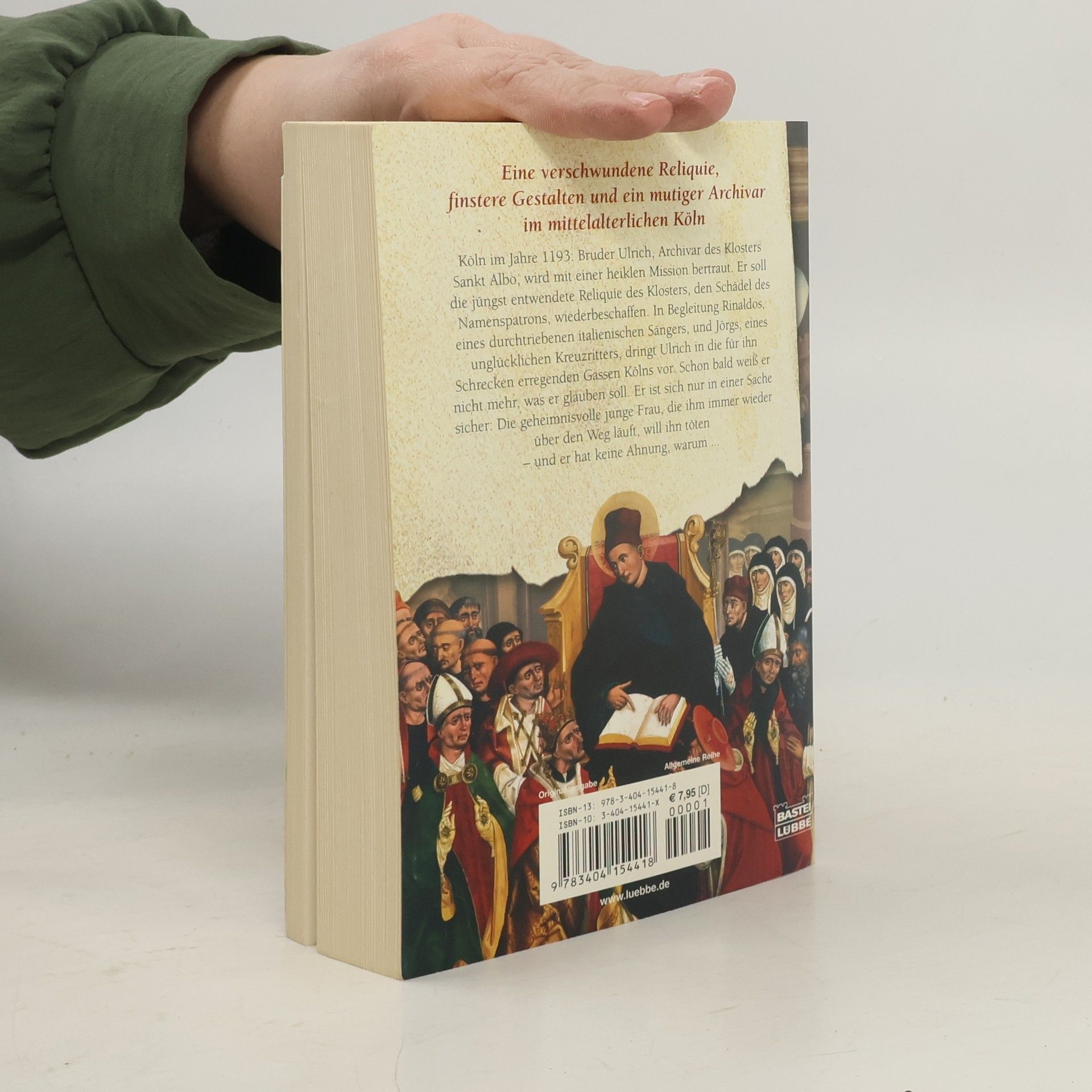 Köln im Jahre 1193: Bruder Ulrich, Archivar des Klosters Sankt Albo, wird mit einer heiklen Mission bertraut. Er soll die jüngst entwendete Reliquie des Klosters, den Schädel des Namenspatrons, wiederbeschaffen. In Begleitung Rinaldos, eines durchtriebenen italienischen Sängers, und Jörgs, eines unglücklichen Kreuzritters, dringt Ulrich in die für ihn Schrecken erregenden Gassen Kölns vor. Schon bald weiß er nicht mehr, was er glauben soll. Er ist sich nur in einer Sache sicher: Die geheimnisvolle junge Frau, die ihm immer wieder über den Weg läuft, will ihn töten - und er hat keine Ahnung, warum ...