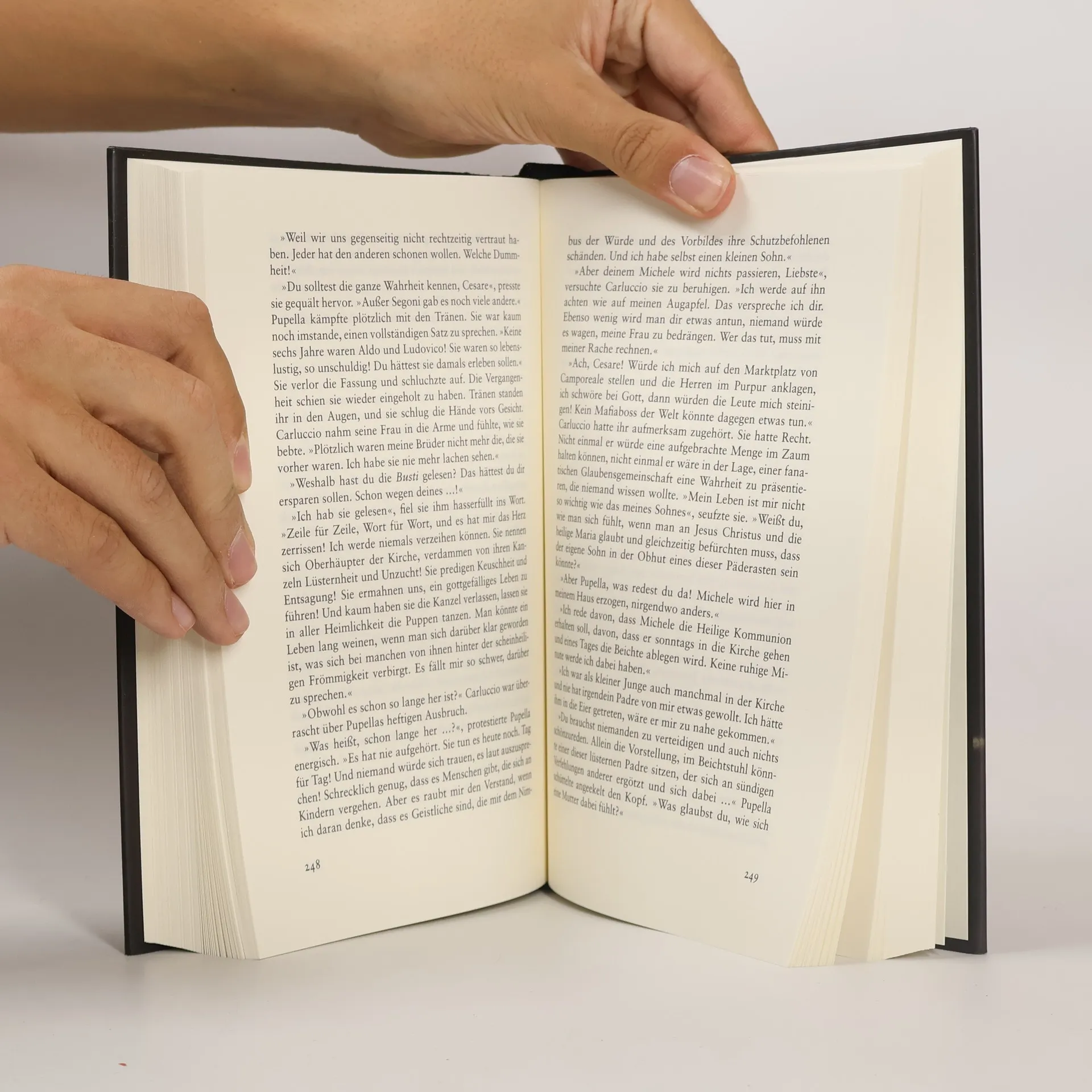 Eigentlich kann Don Cesare Carluccio, ein Mann im besten Alter, jede haben. Die Frauen liegen dem Oberhaupt einer einflussreichen sizilianischen Mafia-Familie reihenweise zu Füßen. Aber der „Capo dei tutte le Capi“ hat für die Damen mit ihren grell geschminkten Mündern und den schlechten Zähnen, die sich ihm willig ergeben, nur Verachtung übrig. Er hat es auf die schöne und wesentlich jüngere Witwe Maria-Lucia alias Pupella abgesehen, die im Gegensatz zu den anderen Frauen Siziliens über ein erhöhtes Maß an Selbstbewusstsein verfügt. Trotzdem ist Pupella hellauf begeistert, als Carluccio ihr unterbreitet, dass er sie in drei Wochen in der Kathedrale von Palermo heiraten will -- ein Anruf bei einem Jugendfreund im Vatikan, der jetzt Kardinal ist, hat anscheinend genügt. Es gibt nur ein paar Probleme. Denn Pupellas Mann ist vor einigen Jahren hingerichtet und mit einem Singvogel im Mund versehen worden, weil er die Mafia verlassen wollte. Und Pupella hat am Grab geschworen, den Mord wegen dieser Infamità durch Blutrache zu sühnen. Zudem soll sie im Besitz geheimer Dokumente sein, die den Vatikan belasten. Und ohne diese Busti secreti, sagt der Kardinal, wird es wohl doch keine Hochzeit mit dem Segen der Kirche geben können.