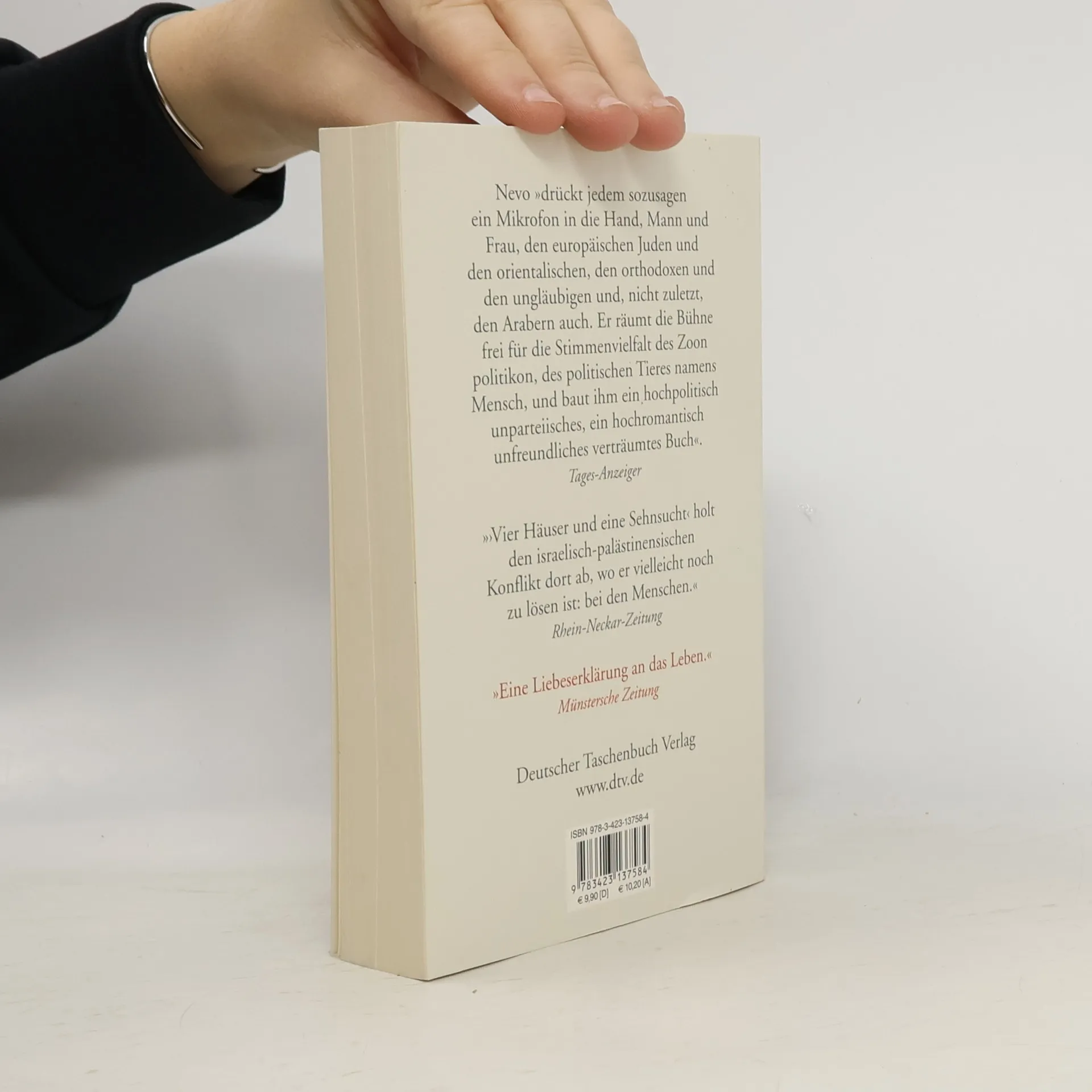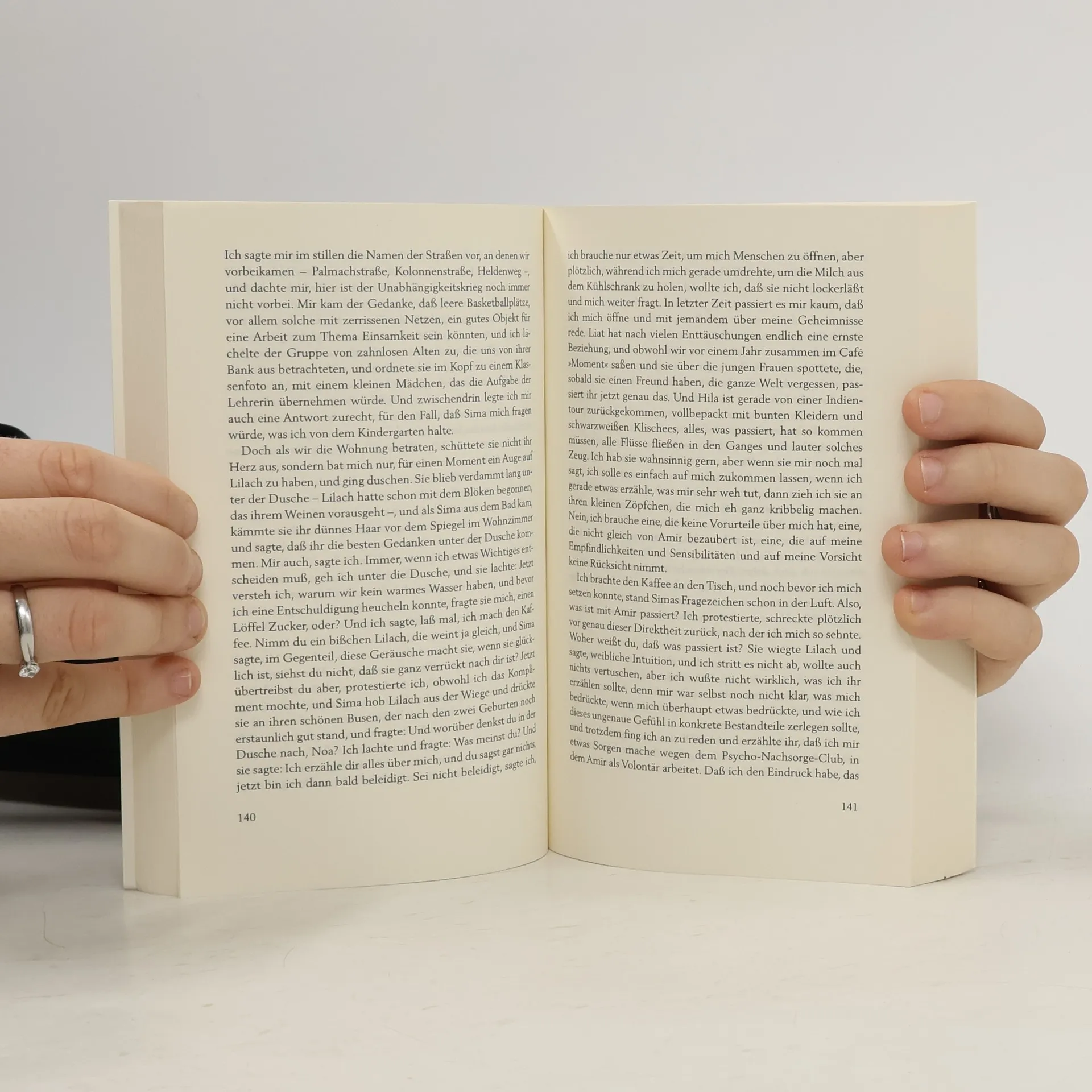 Das ganze Land - in eine kleine, pulsierende Blase gepresst. In der Wand zwischen den beiden Wohnungen ist ein Loch, damit man von beiden Seiten an den Schalter fürs warme Wasser kommt. Auf der einen Seite wohnen Noa, angehende Photographin, und Amir, Psychologiestudent, auf der anderen Seite ihre Vermieter, Moshe und Sima. Im Haus gegenüber eine Familie, deren Sohn Gidi gerade im Libanon gefallen ist. Dessen kleiner Bruder Yotam gehört zu den Erzählstimmen, die Nevo seinen Protagonisten leiht: unterschiedliche Perspektiven, Tonfälle, Seelenlagen. Noa betrachtet die Welt durch eine Linse, Amir kennt sich besser mit Abschiednehmen aus, Moshe wird immer religiöser, sehr zum Missfallen von Sima, die sich ihrer Versäumnisse bewusst wird, wenn sie Noa und Amir lieben hört. Schließlich Ssadeq, der arabische Bauarbeiter, dessen Mutter von Rückkehr träumt und den Schlüssel zu ihrem 1948 verlassenen Haus besitzt, in dem jetzt Moshes Eltern wohnen. Der Ort: ein Vorort von Jerusalem, heute vor allem von Kurden bewohnt. Die Zeit: nach der Ermordung Jitzchak Rabins, als Terroranschläge das Land erschüttern und die Hoffnung auf Frieden zunichte machen. Im Zusammenspiel der Stimmen lässt Nevo das alltägliche Leben von Juden und Palästinensern mit all ihren Geschichten, Gefühlen, Nöten und Sehnsüchten erstehen.
