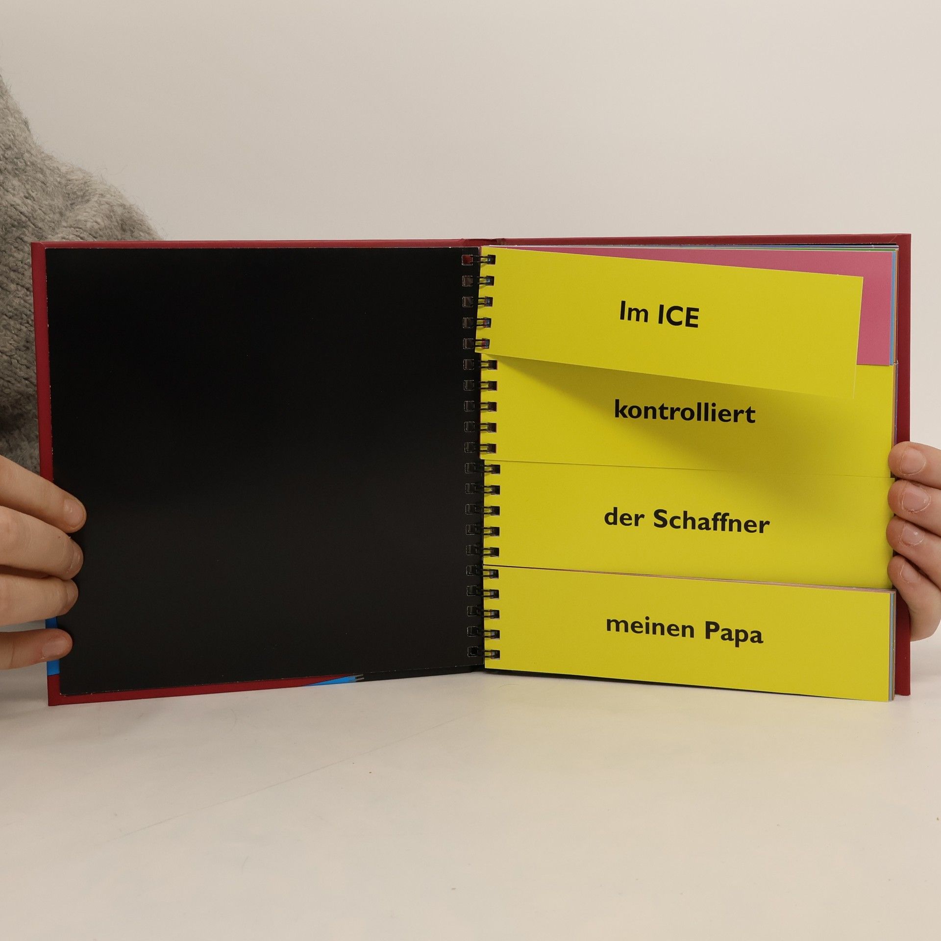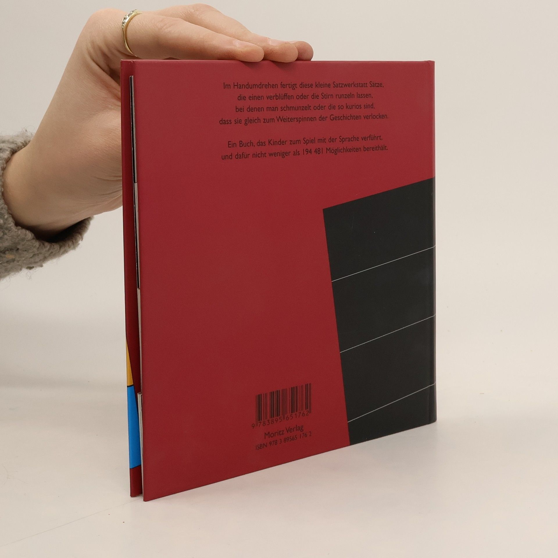 Diese kleine Satzwerkstatt lässt im Handumdrehen eine Fülle von Sätzen entstehen, die Lust und Laune auf Spiele mit der Sprache machen. Das Klappprinzip ist denkbar einfach, wurde bislang aber fast nur im Bildbereich angewandt: 4 X 21 Klappen lassen die beeindruckend hohe Zahl an witzigen und erstaunlichen Sätzen entstehen: nämlich 194.481! Zum Beispiel: Auf dem Weihnachsmarkt streichelt mein Zahnarzt vier fette Heringe. Auf dem Weihnachsmarkt findet keiner vier fette Heringe. Auf dem Weihnachsmarkt zeigt mir unser Hund vier fette Heringe. So erbibt sich eine um die andere Möglichkeit aufzuzeigen, wie vielfältig Spielereien mit Wörtern sein können.