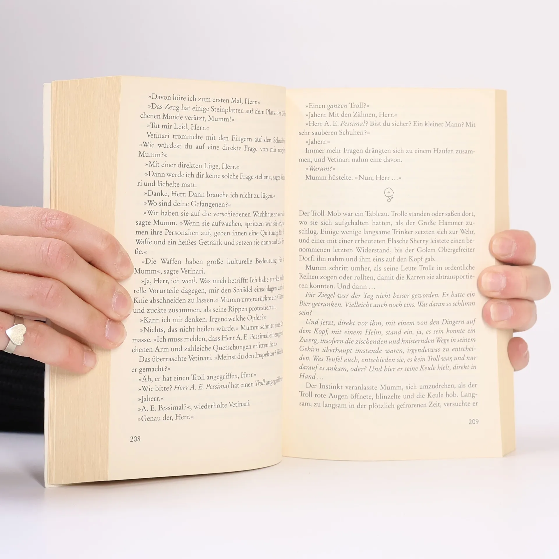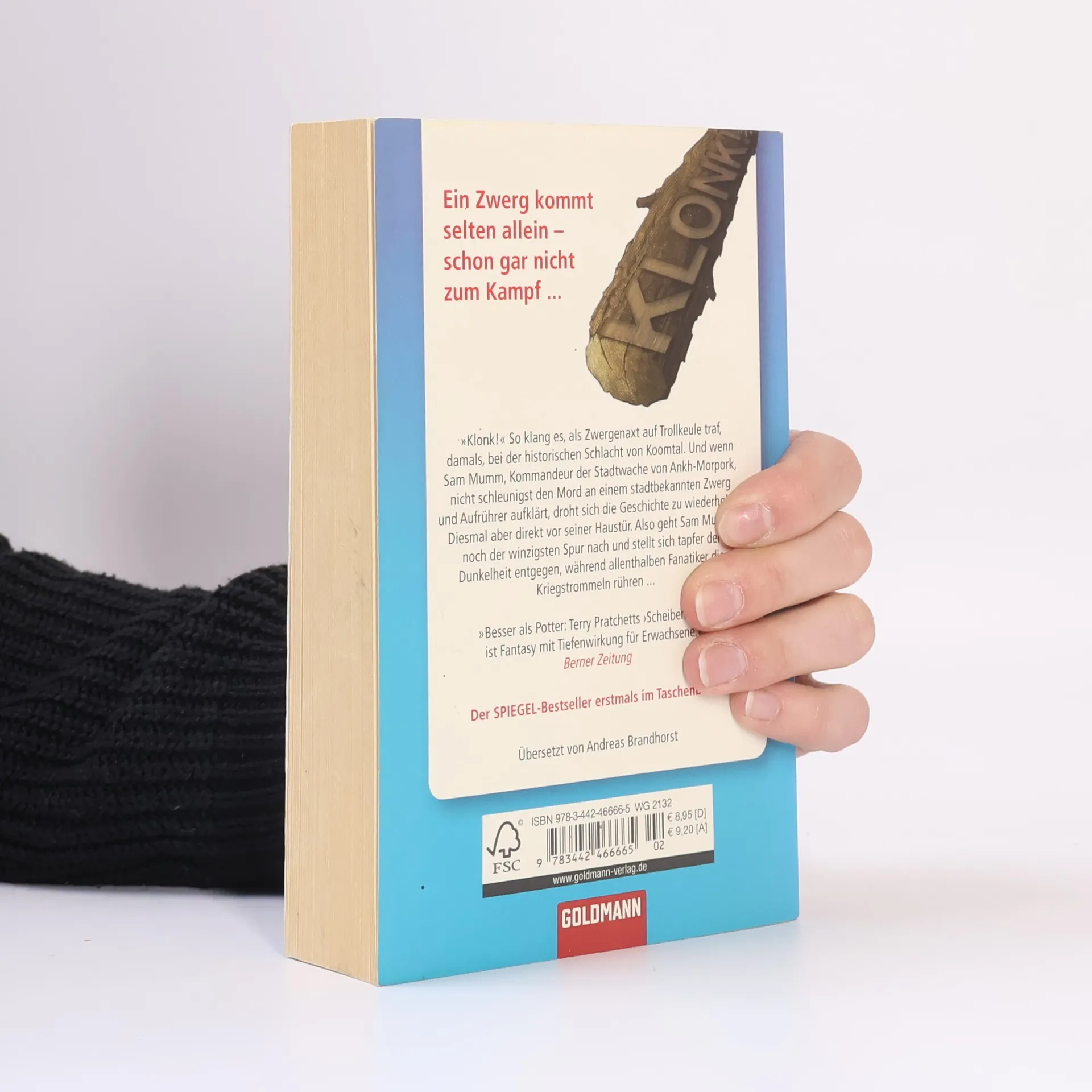 „Klonk!“ So klang es, als Zwergenaxt auf Trollkeule traf, damals, bei der historischen Schlacht von Koomtal. Und wenn Sam Mumm, Kommandeur der Stadtwache von Ankh-Morpork, nicht schleunigst den Mord an einem stadtbekannten Zwerg und Aufrührer aufklärt, droht sich die Geschichte zu wiederholen. Diesmal aber direkt vor seiner Haustür. Also geht Sam Mumm noch der winzigsten Spur nach und stellt sich tapfer der Dunkelheit entgegen, während allenthalben Fanatiker die Kriegstrommeln rühren …• 2008 feiert die Scheibenwelt ihr 25-jähriges Jubiläum und Terry Pratchett seinen 60. Geburtstag mit einer Tour durch Europa.