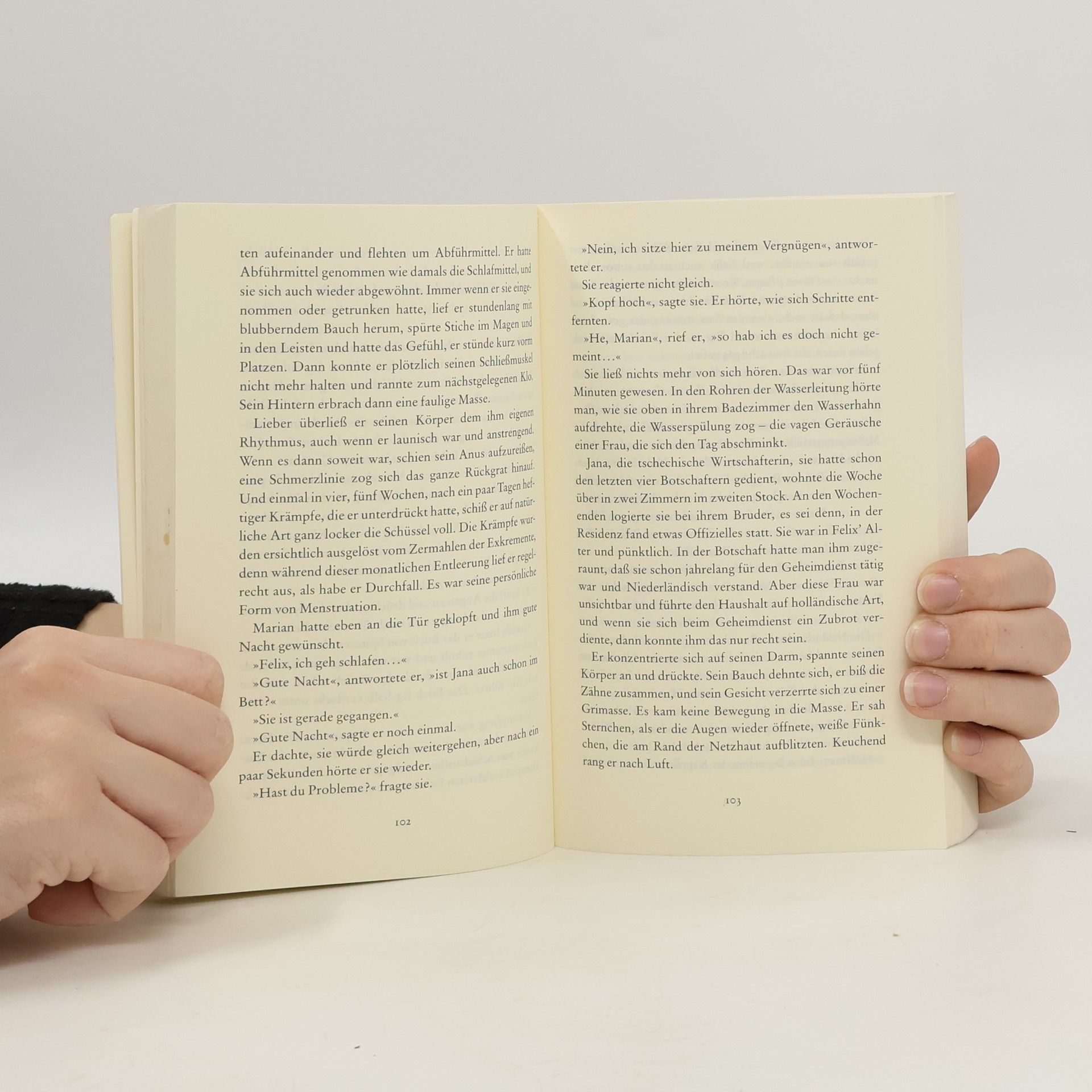 In einer spannenden Spionage-Geschichte kreuzen sich die Schicksale dreier Männer: Felix Hoffman, niederländischer Botschafter in Prag, der seinen leiblichen und metaphysischen Hunger mit Essen und Spinoza stillt, Freddy Mancini, Zeuge einer Entführung, John Marks, amerikanischer Ostblockspezialist. Zugleich die Geschichte von Europa 1989, das sich eint und berauscht im Konsum. Ein Rausch, der nur in einem Kater enden kann.