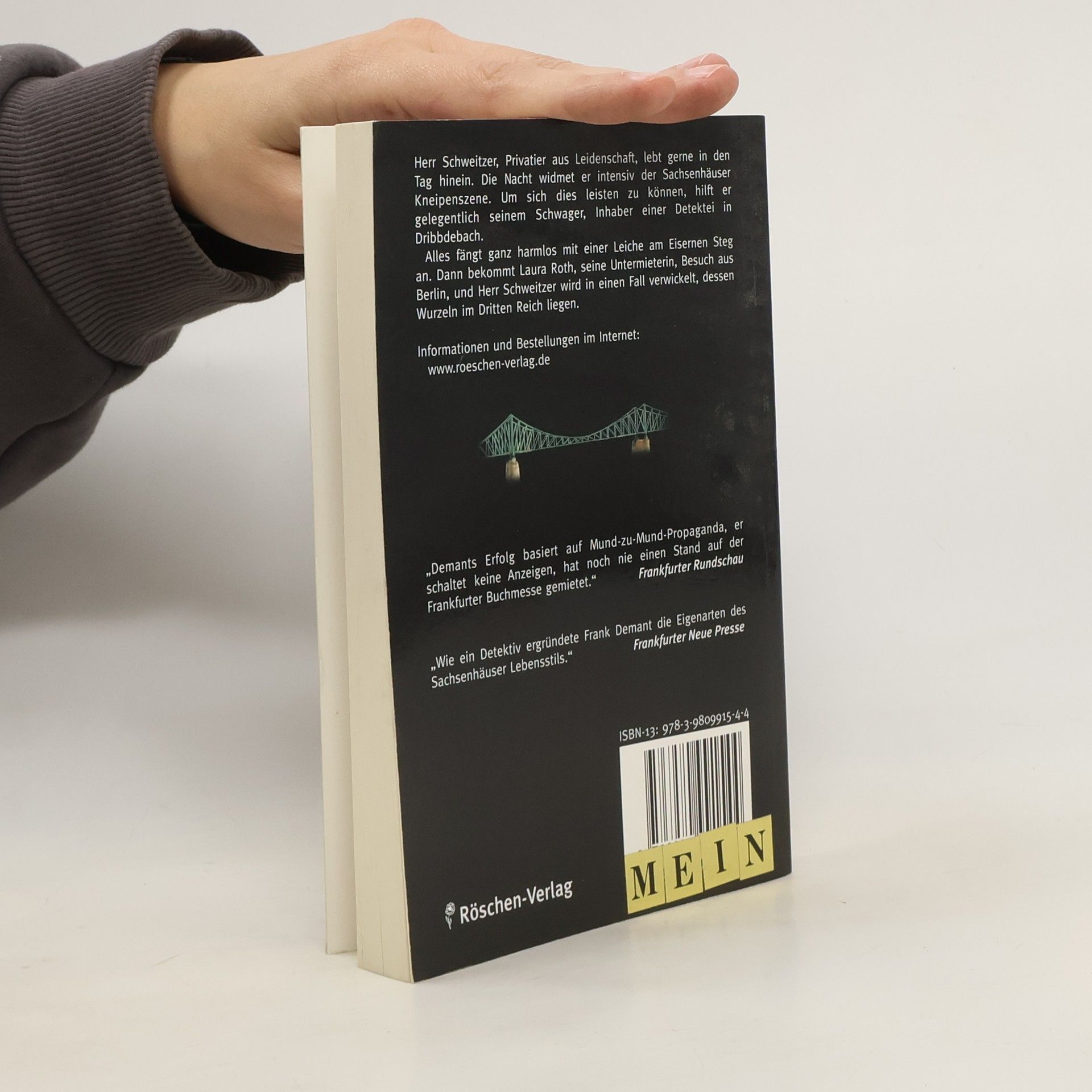 Alles fängt ganz harmlos mit einer Leiche am Eisernen Steg an. Dann bekommt Laura Roth, Simon Schweitzers Untermieterin, Besuch aus Berlin, und Herr Schweitzer wird in einen Fall verwickelt, dessen Wurzeln im Dritten Reich liegen. Frank Demant, geboren 1959 in Frankfurt/Main, aufgewachsen im Stadtteil Fechenheim. Besuchte das Helmholtz-Gymnasium in Bornheim. Von 1984 bis 2005 Taxifahrer in Frankfurt. Seit Mai 2005 ist Demant freier Schriftsteller. Lebt abwechselnd in Frankfurt und Costa Rica.