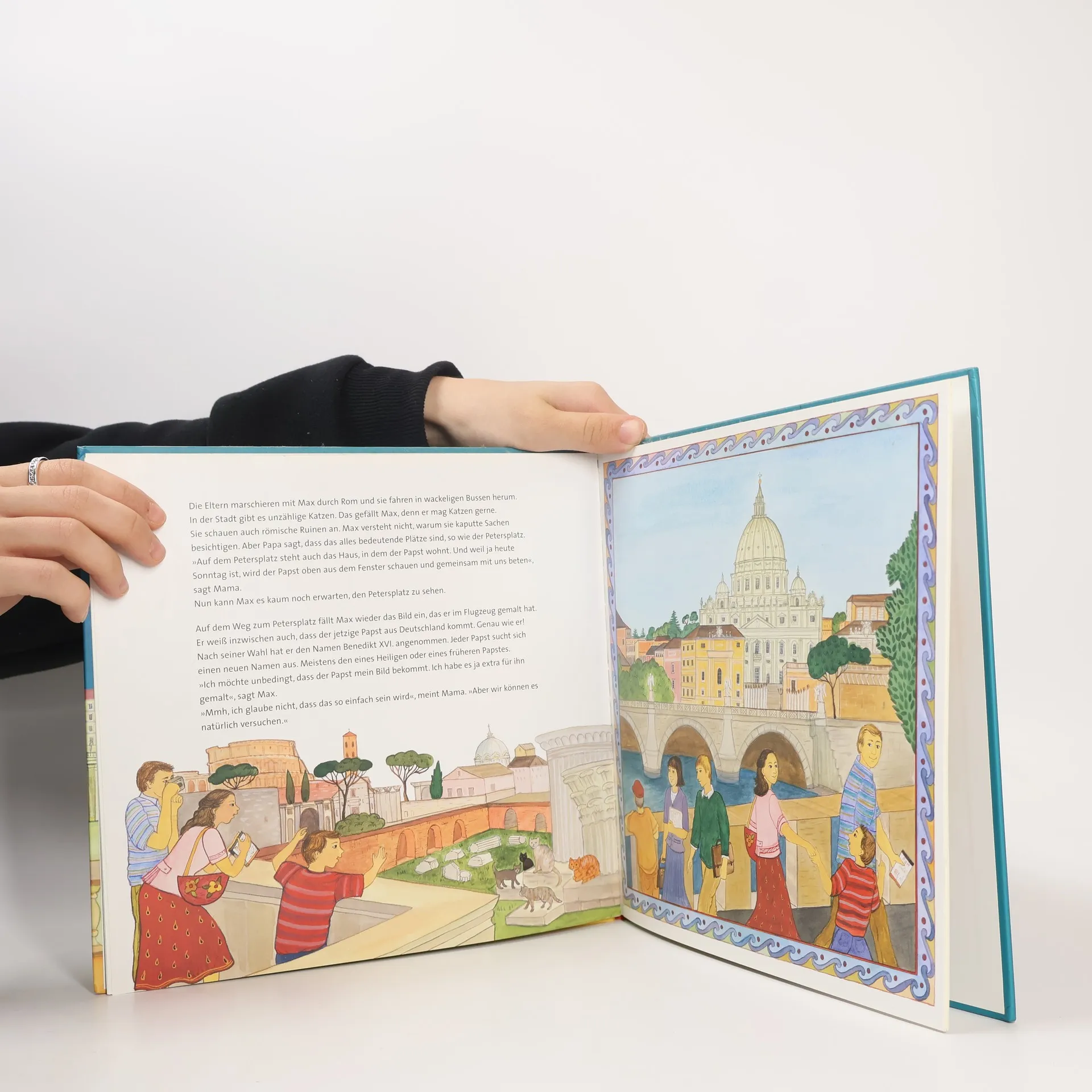 Max fliegt mit seinen Eltern nach Rom und ist beeindruckt von den prunkvollen Gebäuden und den vielen Menschen. Ganz besonders interessiert ihn aber der Papst und er malt ein Bild für ihn: Seine Eltern zeigen Max den Vatikan und beantworten seine vielen Fragen.