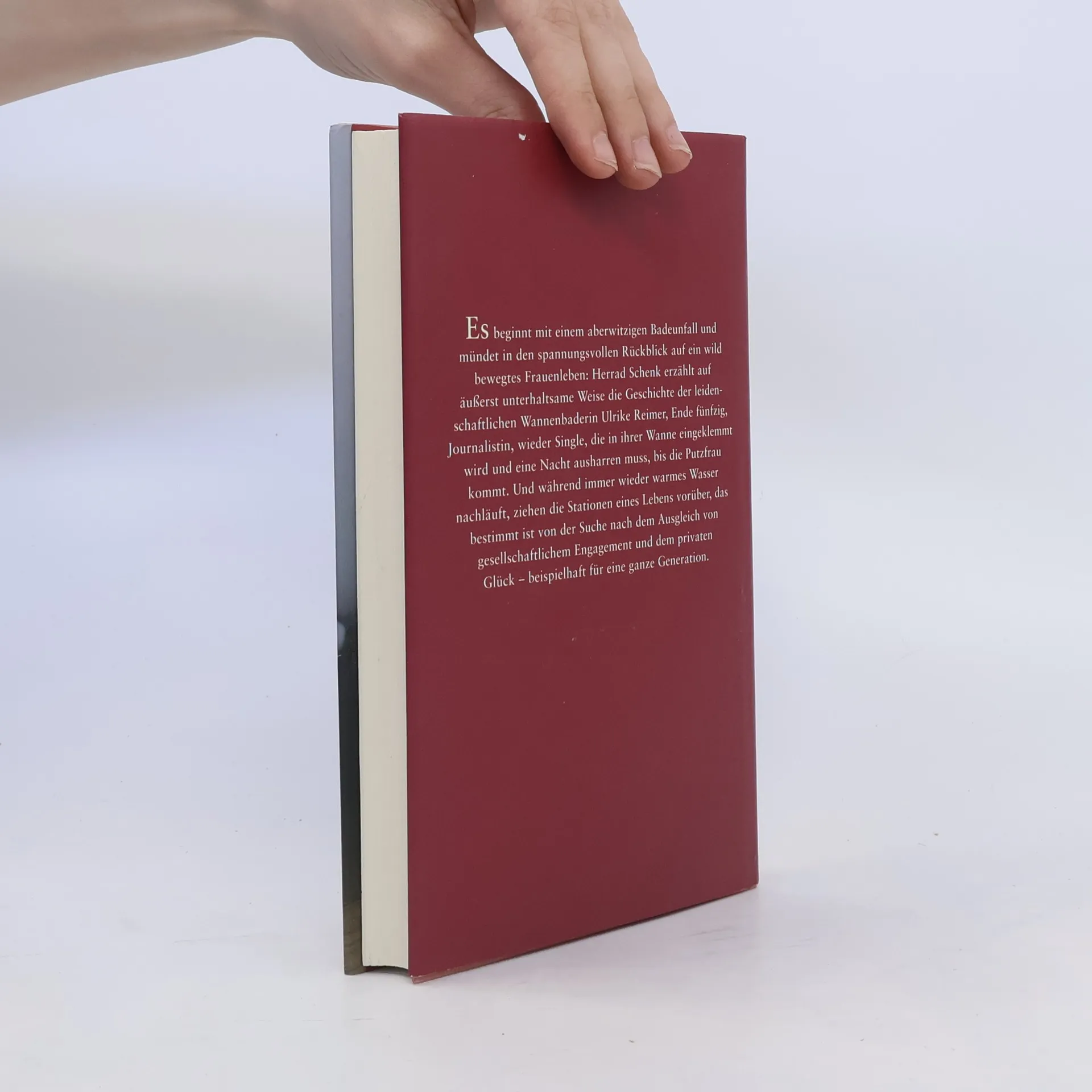 Ein Badeunfall und seine Folgen: Herrad Schenk erzählt von einer reifen Frau und ihrer charmanten Unreife. Die leidenschaftliche Wannenbaderin Ulrike Reimer, Ende Fünfzig, Journalistin und wieder Single, rutscht in der Badewanne aus und kann nicht mehr heraus. Während sie auf Rettung durch ihre Putzfrau wartet, zieht ihr Leben an ihr vorbei. Obwohl die Situation misslich ist, blickt Ulrike zurück auf ein bewegtes Frauenleben voller Wohngemeinschaften, Beziehungen und tiefen Enttäuschungen. Der Versuch, einen Blick auf ihren nackten Nachbarn zu erhaschen, führt dazu, dass sie das Badezimmerregal überlastet und ihre Lieblingsbücher in die Wanne fallen. Eingeklemmt und mit warmem Wasser, reflektiert sie über verschiedene Badewannen, die ihr Leben geprägt haben – von der gusseisernen im Elternhaus bis zur gemeinsamen mit ihrer großen Liebe. Während sich die Lage zuspitzt und die Putzfrau nicht kommt, zeigt Schenk auf unterhaltsame Weise, wie eine Frau von heute gelernt hat, sich im Leben einzurichten, ohne ihre Träume aufzugeben. Die Rückschau offenbart Illusionen und Lebenslügen und beleuchtet die Widersprüche einer Generation: Gesellschaftliche Utopie versus privates Glück, Unabhängigkeit und Sehnsucht nach Zweisamkeit.