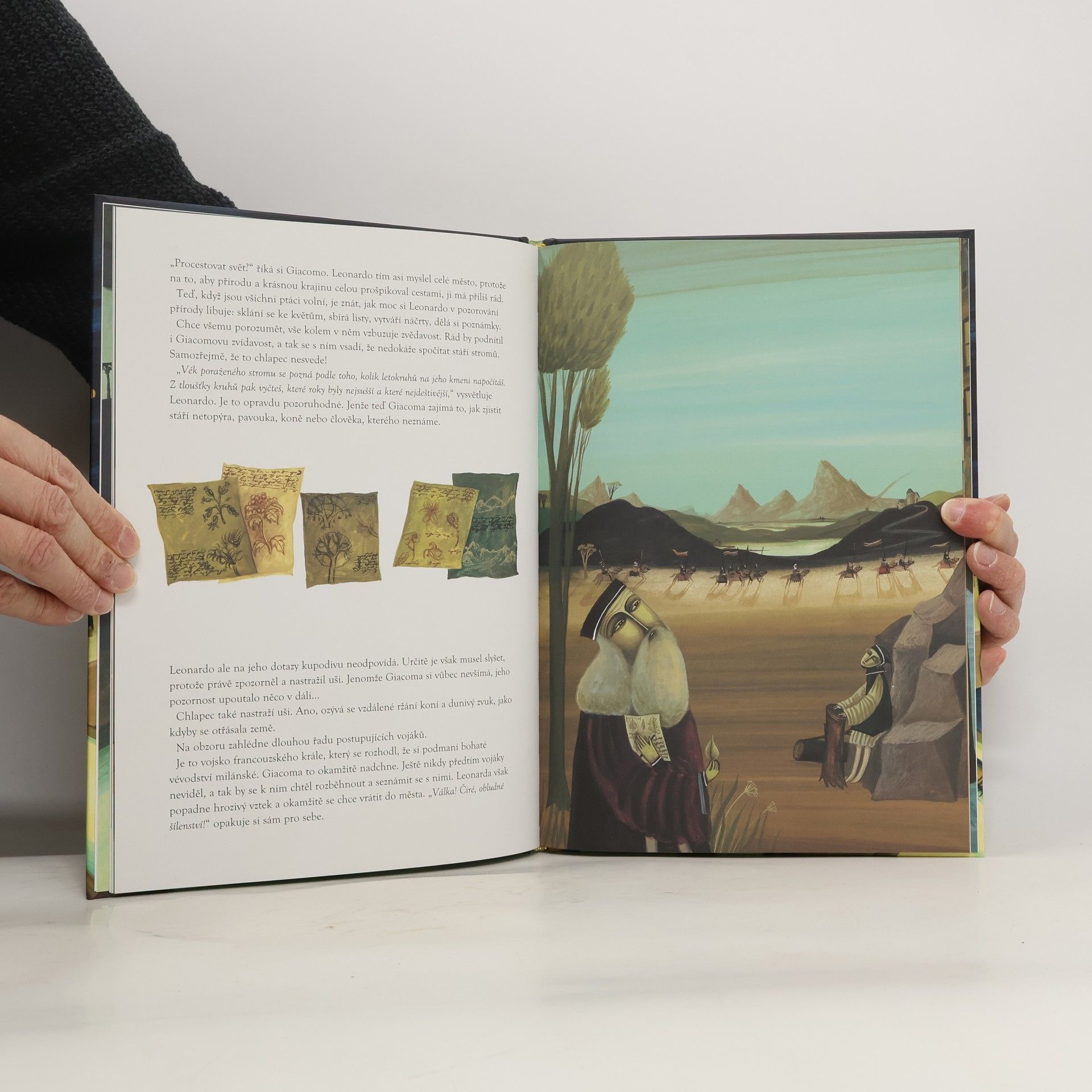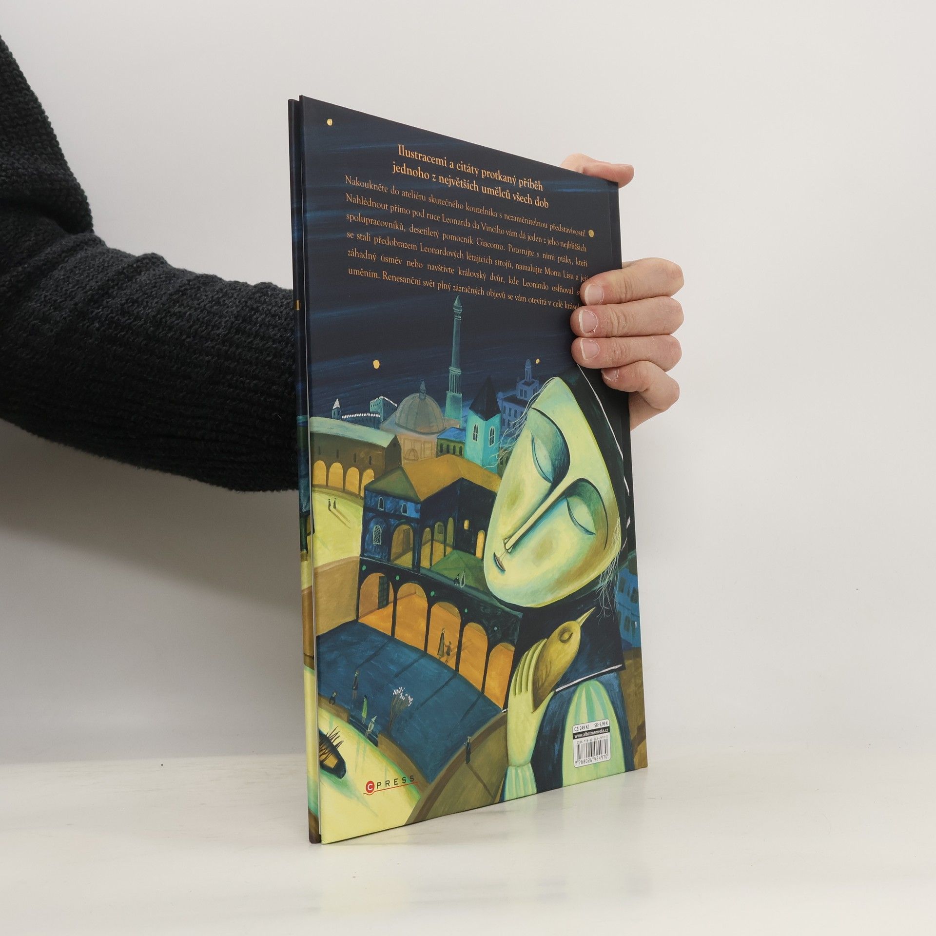 Nakoukněte do ateliéru skutečného kouzelníka s nezaměnitelnou představivostí! Nahlédnout přímo pod ruce Leonarda da Vinciho vám dá jeden z jeho nejbližších spolupracovníků, desetiletý pomocník Giacomo. Pozorujte s nimi ptáky, kteří se stali předobrazem Leonardových létajících strojů, namalujte Monu Lisu a její záhadný úsměv nebo navštivte královský dvůr, kde Leonardo oslňoval svým uměním. Renesanční svět plný zázračných objevů se vám otevírá v celé kráse! Knihu ilustrovala významná italská ilustrátorka Bimba Landmann, která získala prestižní ocenění v Německu a Francii.
