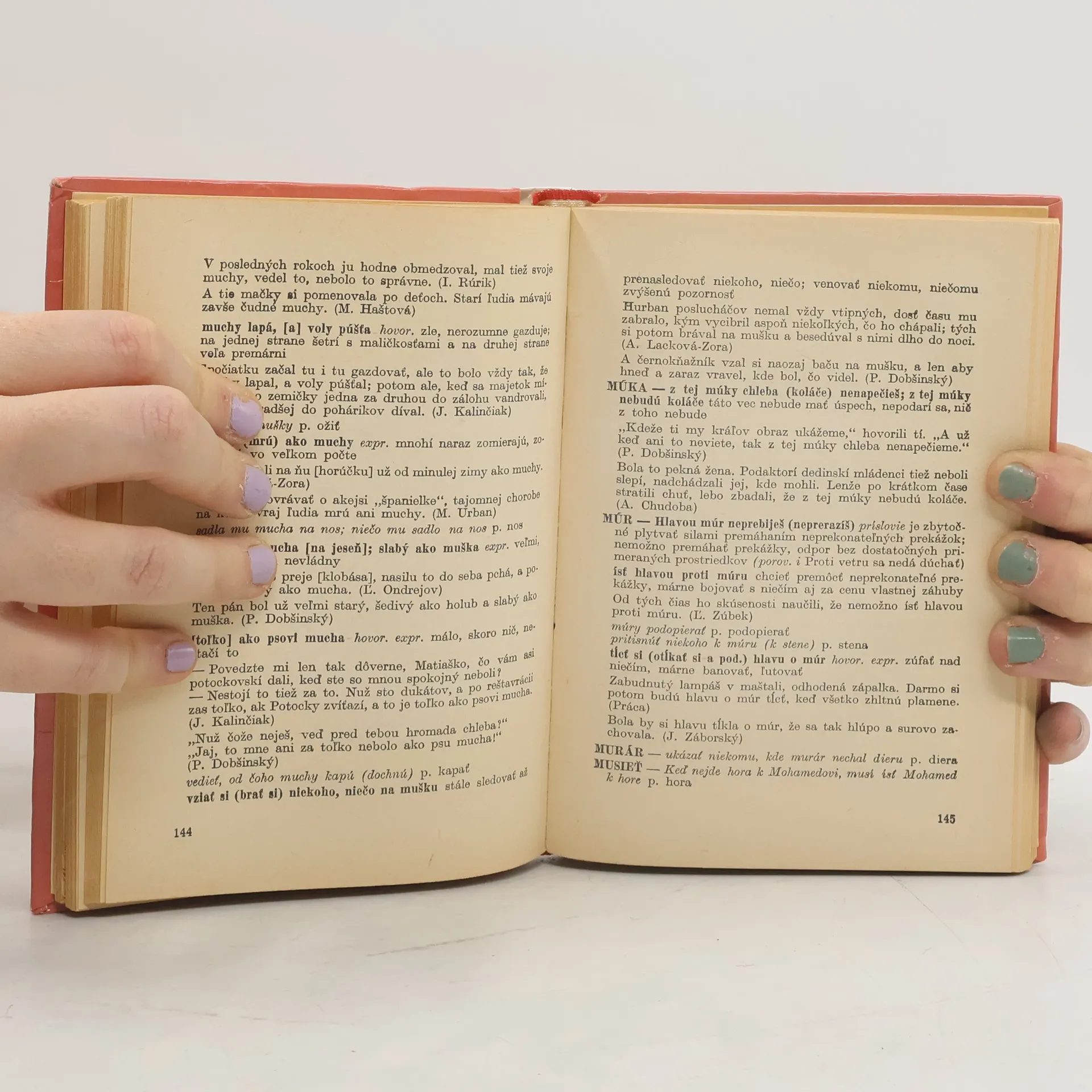 Slovník obsahuje výber slovenských frazeologických jednotiek usporiadaných podľa istých slovníkových zásad. Odlišuje sa tým, že heslami nie sú jednotlivé slová usporiadané podľa abecedy ale celé slovné spojenia-takzvané frazeologické jednotky. Do frazeológie zaraďujeme aj ustálené prirovnania alebo príslovia a porekadlá a im blízke útvary. Druhé vydanie. Cena knihy v čase vydania: 22.- Kčs.