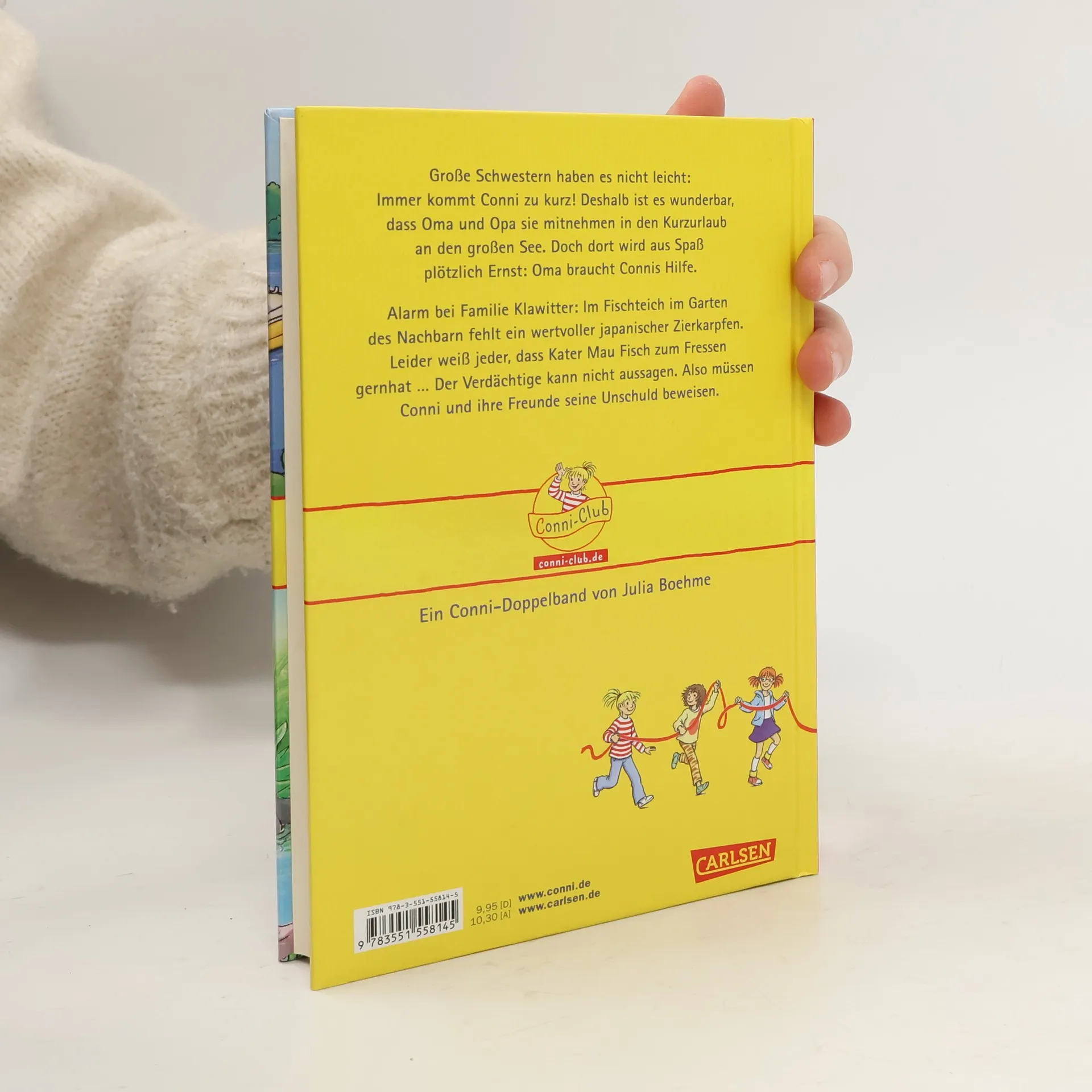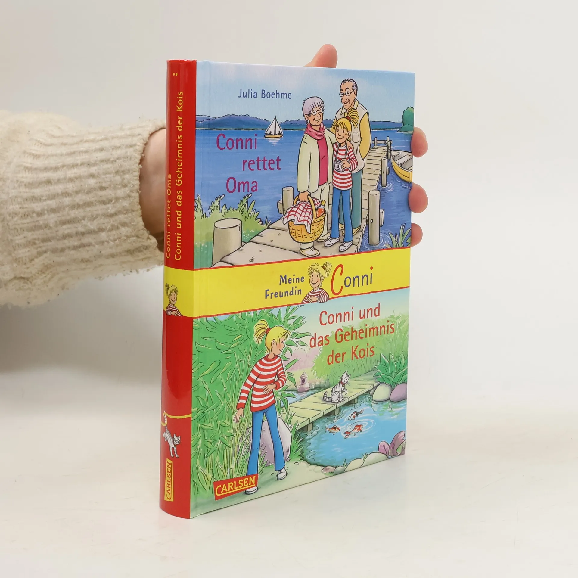 Große Schwestern haben es nicht leicht: Immer kommt Conni zu kurz! Deshalb ist es wunderbar, dass Oma und Opa sie mitnehmen in den Kurzurlaub an den großen See. Doch dort wird aus Spaß plötzlich Ernst: Oma braucht Connis Hilfe. Alarm bei Familie Klawitter: Im Fischteich im Garten des Nachbarn fehlt ein wertvoller japanischer Zierkarpfen. Leider weiß jeder, dass Kater Mau Fisch zum Fressen gernhat. Der Verdächtige kann nicht aussagen. Also müssen Conni und ihre Freunde seine Unschuld beweisen. Ein Conni-Doppelband von Julia Boehme