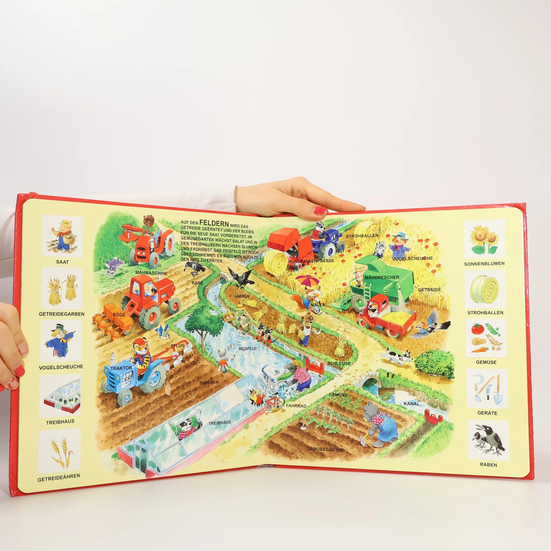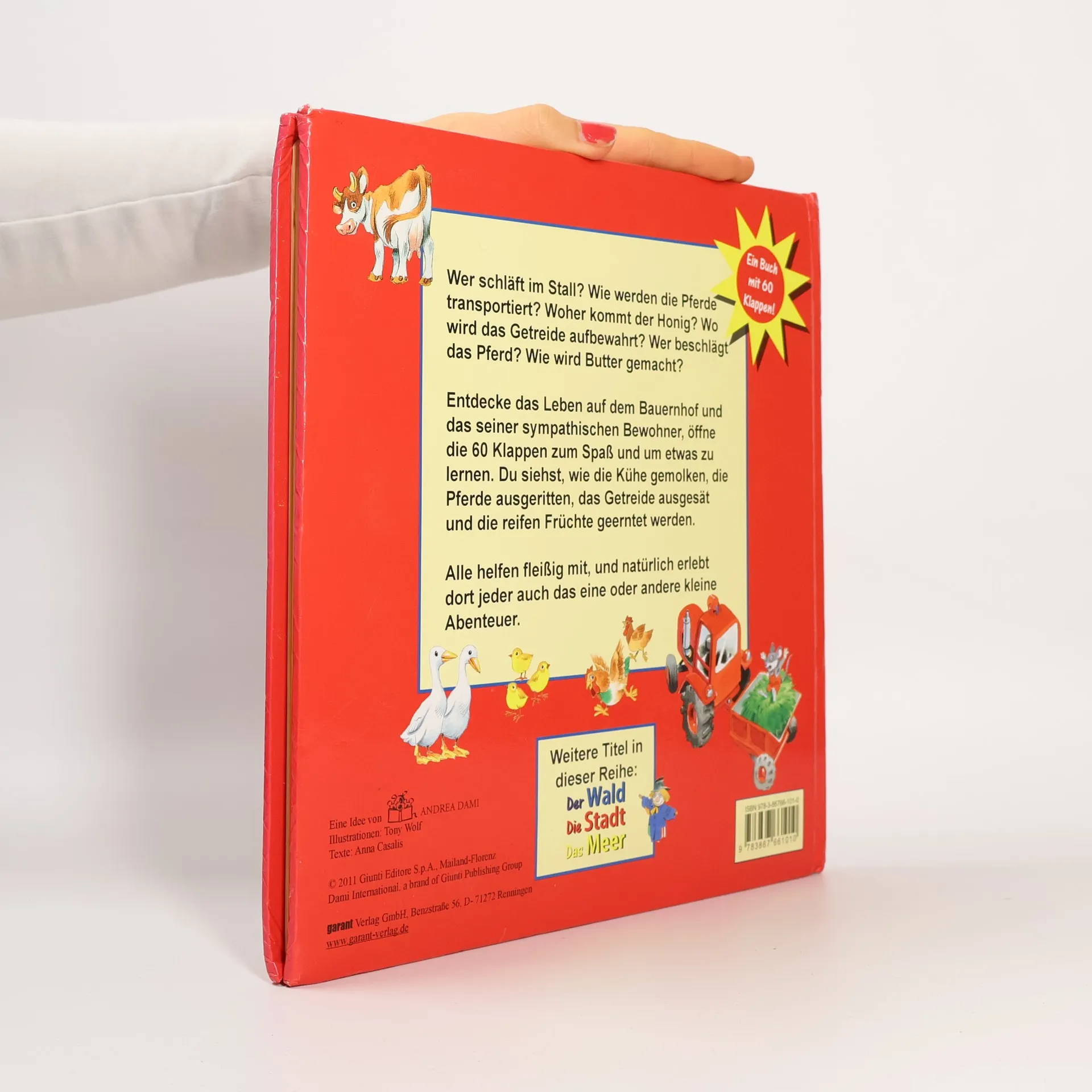 Wer schläft im Stall? Wie werden die Pferde transportiert? Woher kommt der Honig? Wo wird das Getreide aufbewahrt? Wer beschlägt das Pferd? Wie wird Butter gemacht? Entdecke das Leben auf dem Bauernhof und das seiner sympathischen Bewohner, öffne die 60 Klappen zum Spaß und um etwas zu lernen. Du siehst, wie die Kühe gemolken, die Pferde ausgeritten, das Getreide ausgesät und die reifen Früchte geerntet werden. Alle helfen fleißig mit, und natürlich erlebt dort jeder auch das eine oder andere kleine Abenteuer.