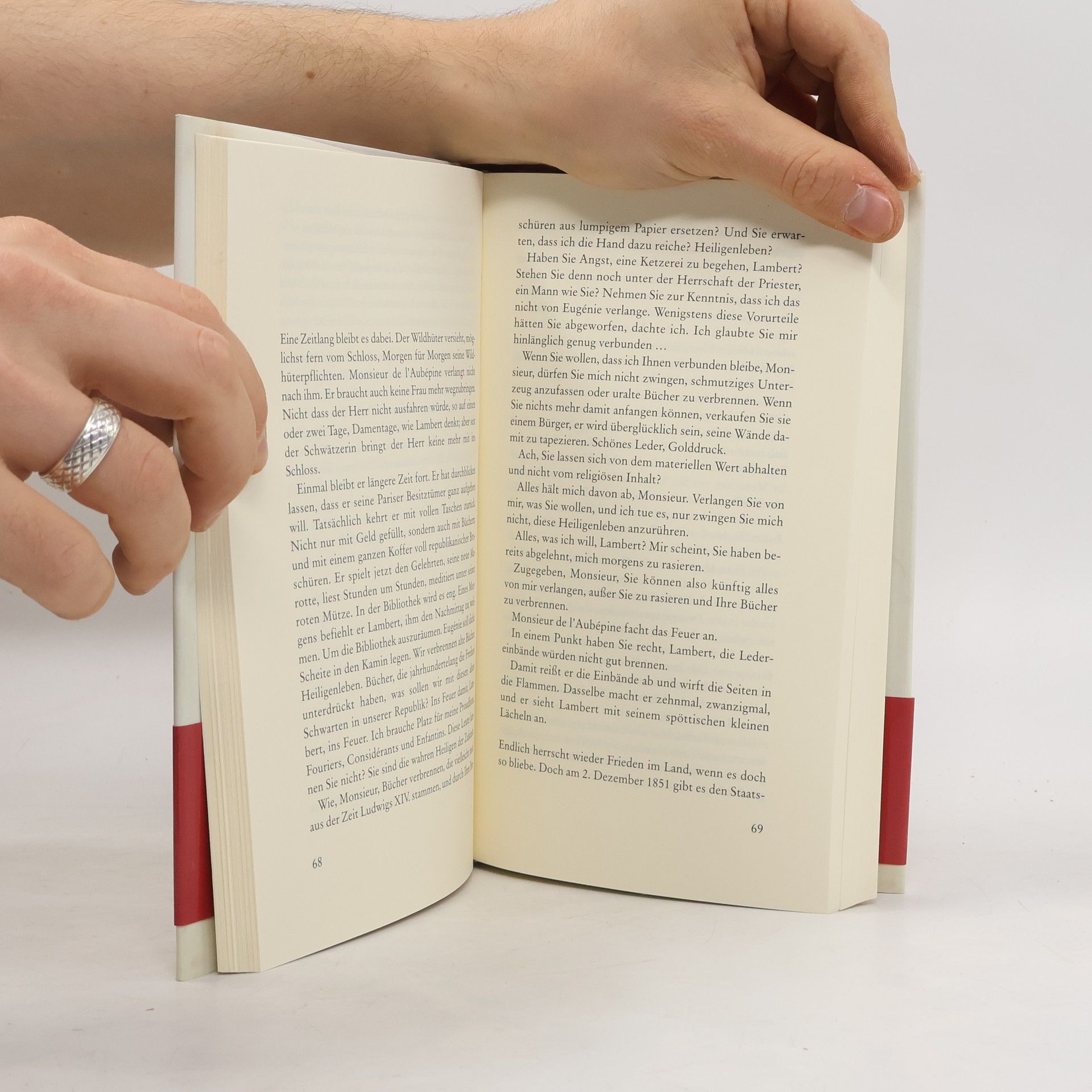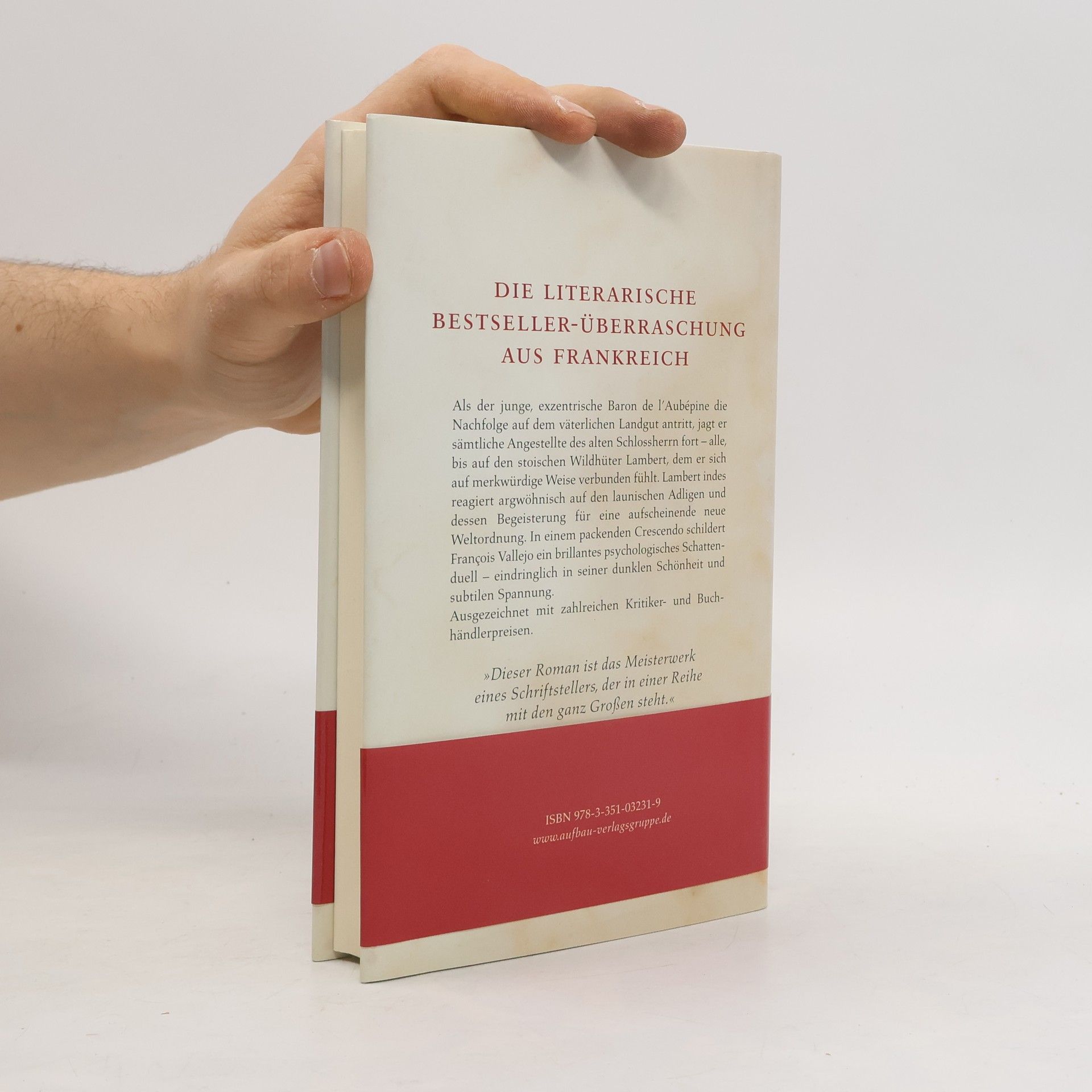 Rückseite: 'Dieser Roman ist eine Entdeckung.' NDR Als der junge Baron de l'Aubépine die Nachfolge auf dem väterlichen Gut antritt, jagt er die Angestellten des alten Schlossherrn fort - alle, bis auf den Wildhüter Lambert, dem er sich merkwürdig verbunden fühlt. Lambert indes reagiert argwöhnisch auf den exzentrischen Adligen und seine flammende Begeisterung für eine neue Weltordnung. Ein brillantes psychologisches Duell, ausgezeichnet mit zahlreichen Kritiker- und Buchhändlerpreisen. 'Ein Roman, der in einer Weise erschüttert, wie es nur die Literatur vermag.' Le Monde Innenklappe: Nach dem Tod seines Vaters kehrt der junge Baron de l'Aubépine auf das Gut Les Perrières zurück, um die Nachfolge des alten, tyrannischen Schlossherrn anzutreten. Die väterliche Gefolgschaft schickt er zum Teufel, bis auf den Wildhüter Lambert, dem er sich auf merkwürdige Weise verbunden fühlt. Lambert indes beobachtet seinen neuen Herrn mit Argwohn. Fremd und unheimlich ist ihm dieser launische Adlige mit seinen ungeheuerlichen Sehnsüchten und perversen Neigungen, mit seiner flammenden Begeisterung für eine aufscheinende neue Weltordnung, welche die Gewissheiten des Wildhüters, ja seine Existenz in Frage stellt. Doch Lamberts Tochter Magdeleine begegnet dem exzentrischen de l'Aubépine und seiner lebenslustigen Geliebten viel zu neugierig. Als der Baron in seiner Verstiegenheit Victor Hugo aus dem Exil auf Guernsey entführen will, sieht sich Lambert genötigt, die Ordnung seiner Welt verteidigen. Ein packender Roman, eindringlich in seiner psychologischen Spannung und modern in seiner Inszenierung einer gesellschaftlichen Umbruchsituation. Cover: „Ein großartiger Erzähler“ Saarländischer Rundfunk