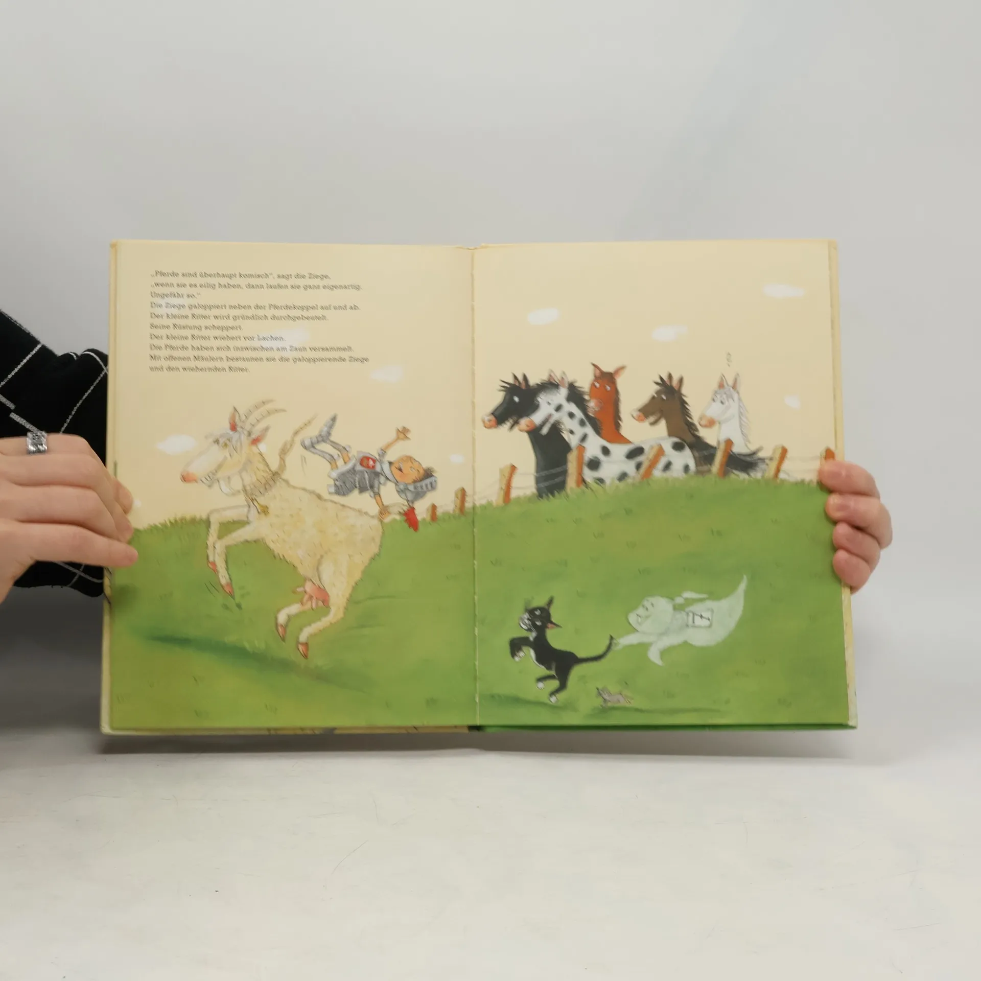 Ein kleiner Ritter, der sich vor Pferden fürchtet? Die Rittereltern sind ratlos. Der kleine Ritter nicht. Er reitet einfach auf der Burgziege. Und die weiß alle Tricks, sogar, wie man kleine Ritter auf große Pferde bringt. Ängste überwinden – mit der richtigen Unterstützung ein Kinderspiel! Der kleine Ritter wohnt mit seinen Eltern, der Ritterin und dem Ritter, in einer Burg mit Türmen und Zinnen. Nachts, wenn er nicht schlafen kann, spielt er mit den Burggespenstern Verstecken. Der kleine Ritter soll reiten lernen, aber er fürchtet sich vor Pferden. Darum möchte er lieber zu Fuß gehen. Das beunruhigt seine Eltern, weil klar ist, dass Ritter reiten können müssen. Also sucht sich der kleine Ritter ein anderes Reittier. Die Burgziege scheint genau richtig. Der Rittervater ist zwar ein wenig besorgt, aber er lässt den kleinen Ritter gewähren. Und am Ende erweist sich die Ziege als ausgezeichnete Reitlehrerin.
