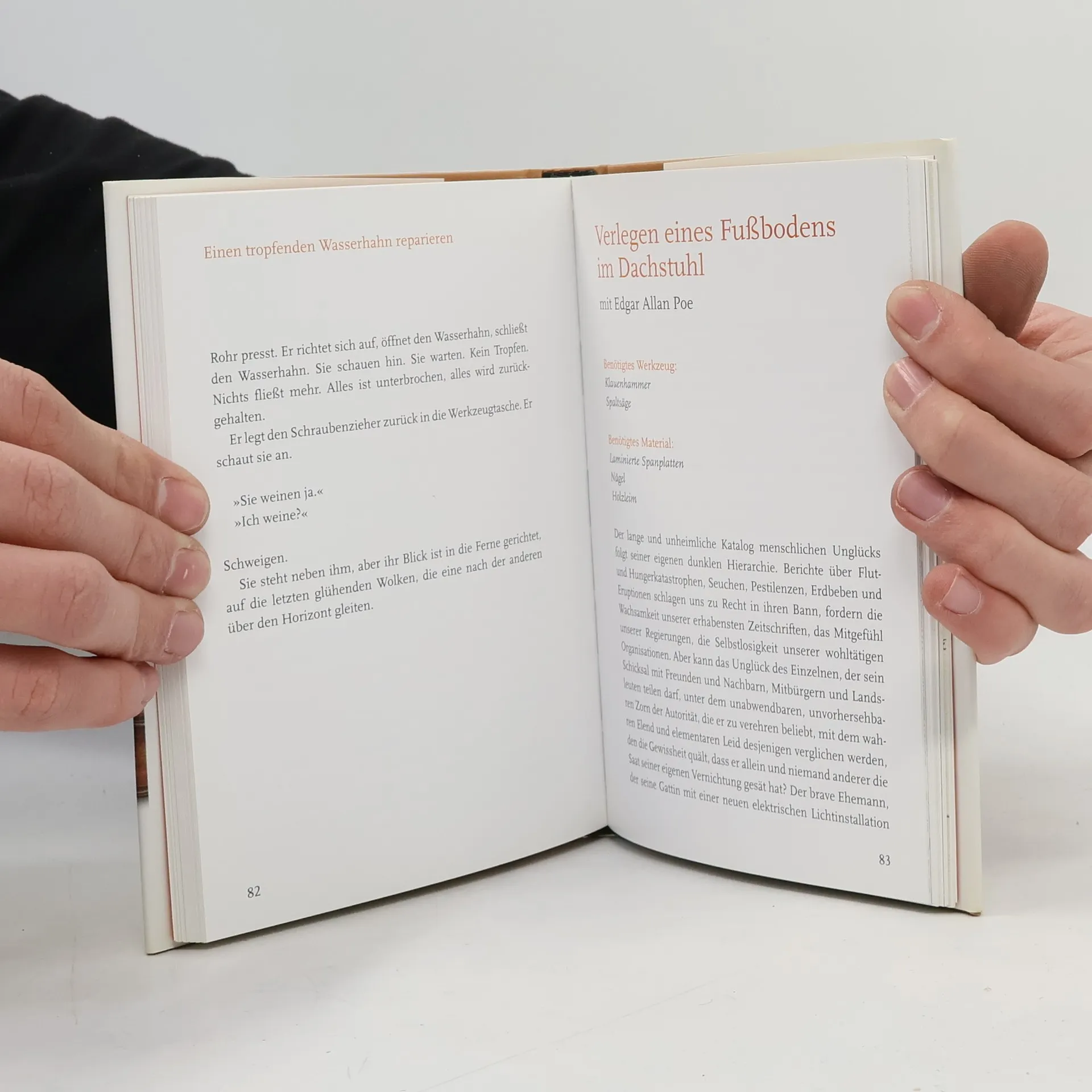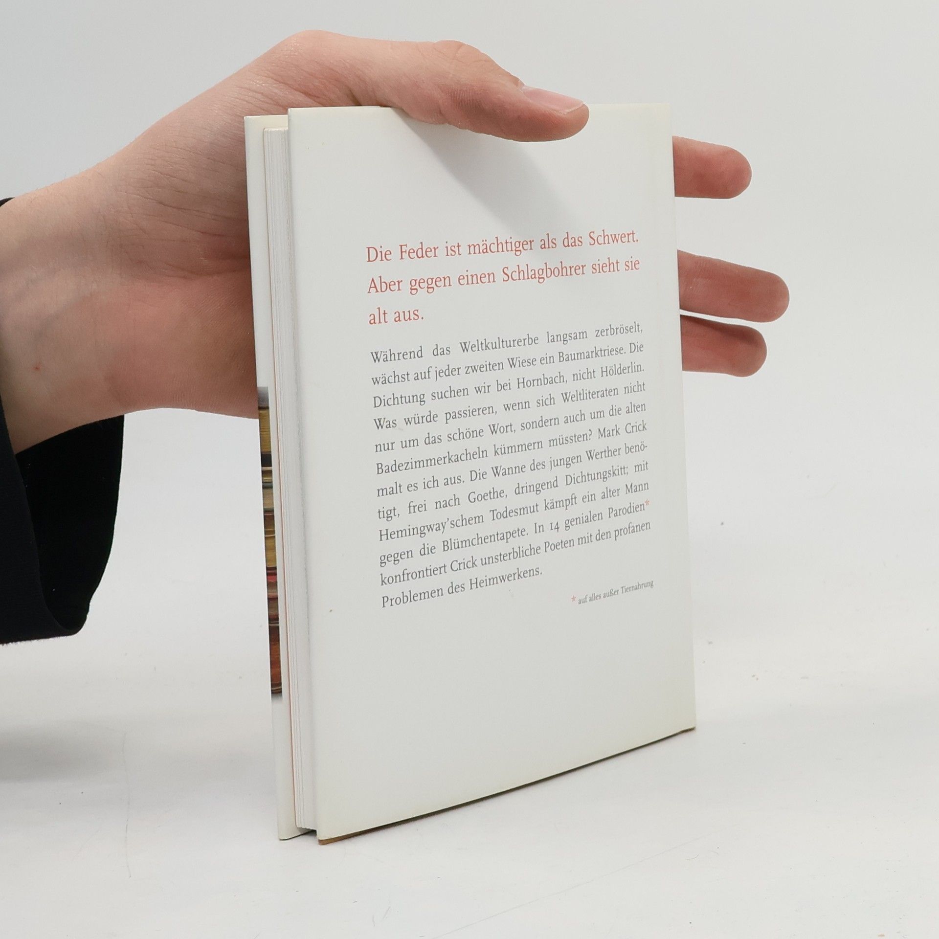 Die Feder ist mächtiger als das Schwert, doch gegen einen Schlagbohrer hat sie keine Chance. Während unser Weltkulturerbe zerfällt, sprießen Baumärkte wie Pilze aus dem Boden, und Heimrenovierungssendungen dominieren die Fernsehabende. Was wäre, wenn große Literaten sich nicht nur um Worte, sondern auch um alte Badezimmerkacheln kümmern müssten? Mark Crick entwirft in 14 Parodien Szenarien, in denen unsterbliche Poeten mit den Herausforderungen des Heimwerkens konfrontiert werden. So benötigt die Wanne des jungen Werther, inspiriert von Goethe, dringend Dichtungskitt, während ein alter Mann im Hemingway-Stil gegen die Blümchentapete ankämpft. Bei Sartre spüren wir die Verzweiflung eines Menschen ohne Abflussfrei, und das Montieren eines Lichtschalters wird bei Jelinek zum Protest gegen männliche Elektronikerhände. Diese Renovierungsrevue bietet praxisnahe Erläuterungen zu Werkzeug und Material und ist mit Cricks beeindruckenden Fälschungen großer Künstler illustriert. Alle Geschichten nutzen die humoristische Kluft zwischen dem Dichterolymp und dem Linoleumboden der Realität voll aus und sind selbst dann komisch, wenn bei manchen Meistern eine Bildungslücke sichtbar wird. Ein kreatives Geschenkbuch, das Lust auf Literatur und Mut im Do-It-Yourself-Zeitalter weckt.