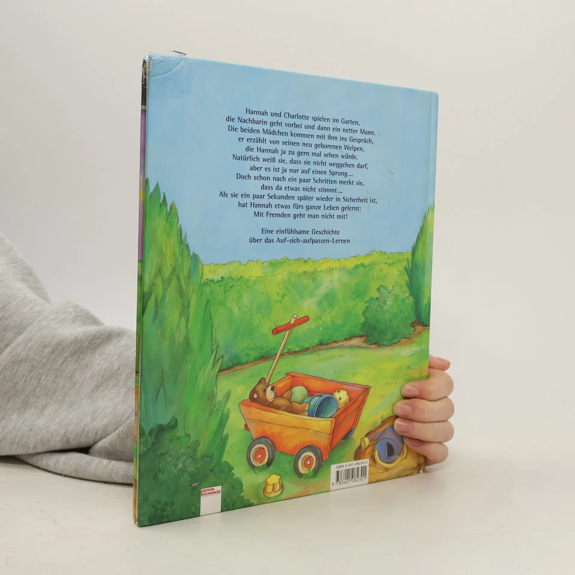 Hannah und Charlotte spielen im Garten, die Nachbarin geht vorbei und dann ein netter Mann. Die beiden Mädchen kommen mit ihm ins Gespräch, er erzählt von seinen neu geborenen Welpen, die Hannah ja zu gern mal sehen würde. Natürlich weiß sie, dass sie nicht weggehen darf, aber es ist ja nur auf einen Sprung. Doch schon nach ein paar Schritten merkt sie, dass da etwas nicht stimmt. Als sie ein paar Sekunden später wieder in Sicherheit ist, hat Hannah etwas fürs ganze Leben gelernt: Mit Fremden geht man nicht mit!