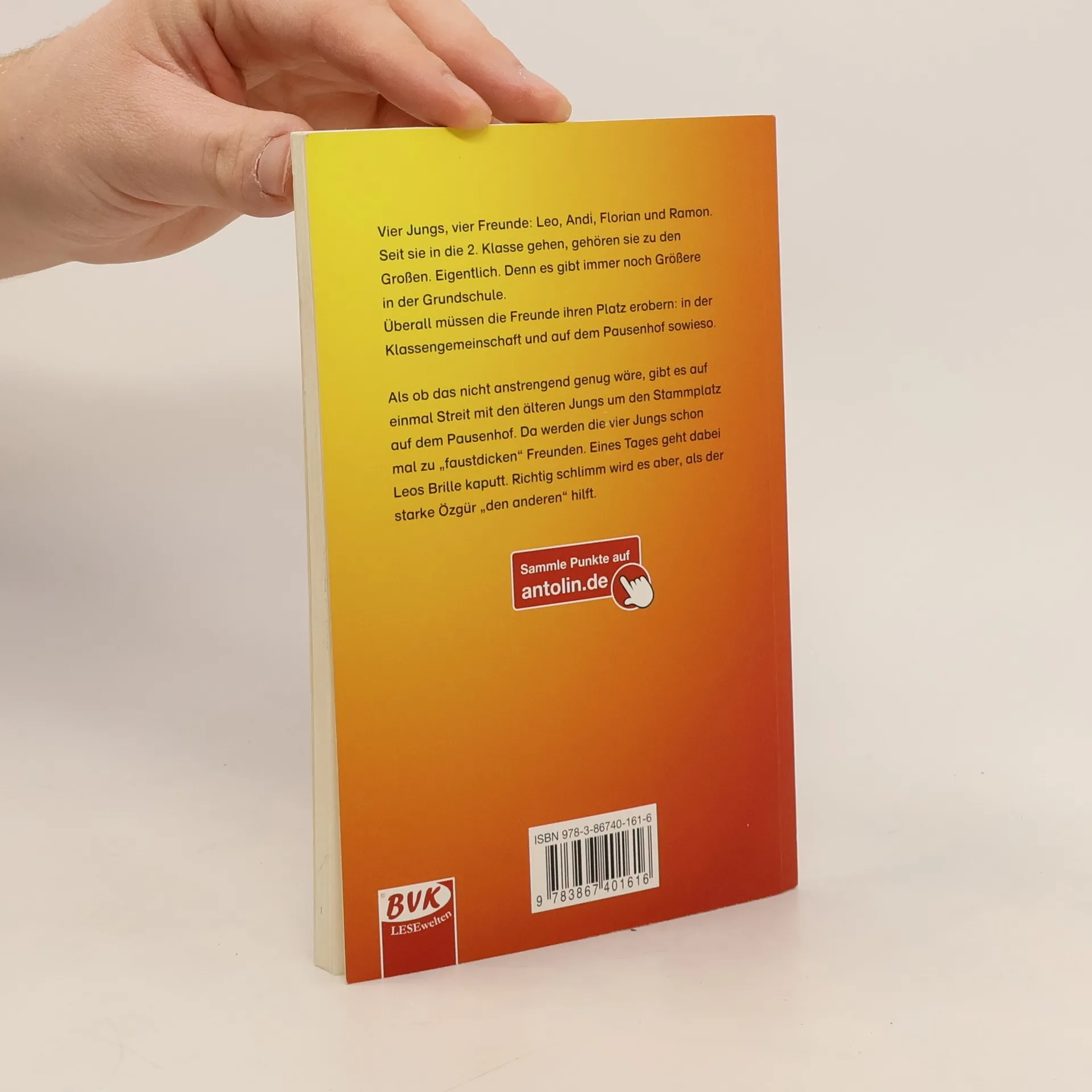 Vier Jungs, vier Freunde: Leo, Andi, Florian und Ramon. Seit sie in die 2. Klasse gehen, gehören sie zu den Großen. Eigentlich. Denn es gibt immer noch Größere in der Grundschule. Überall müssen die Freunde ihren Platz erobern: in der Klassengemeinschaft und auf dem Pausenhof sowieso. Als ob das nicht anstrengend genug wäre, gibt es auf einmal Streit mit den älteren Jungs um den Stammplatz auf dem Pausenhof. Da werden die vier Jungs schon mal zu „faustdicken“ Freunden. Eines Tages geht dabei Leos Brille kaputt. Richtig schlimm wird es aber, als der starke Özgür „den anderen“ hilft.<