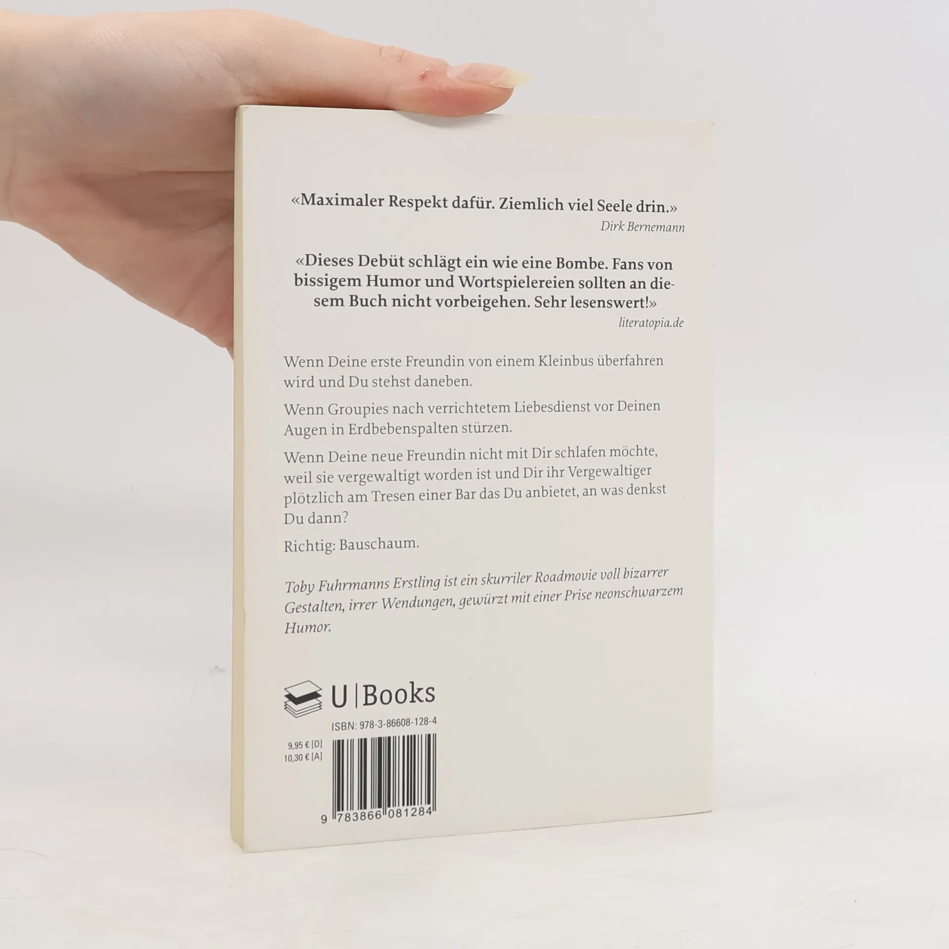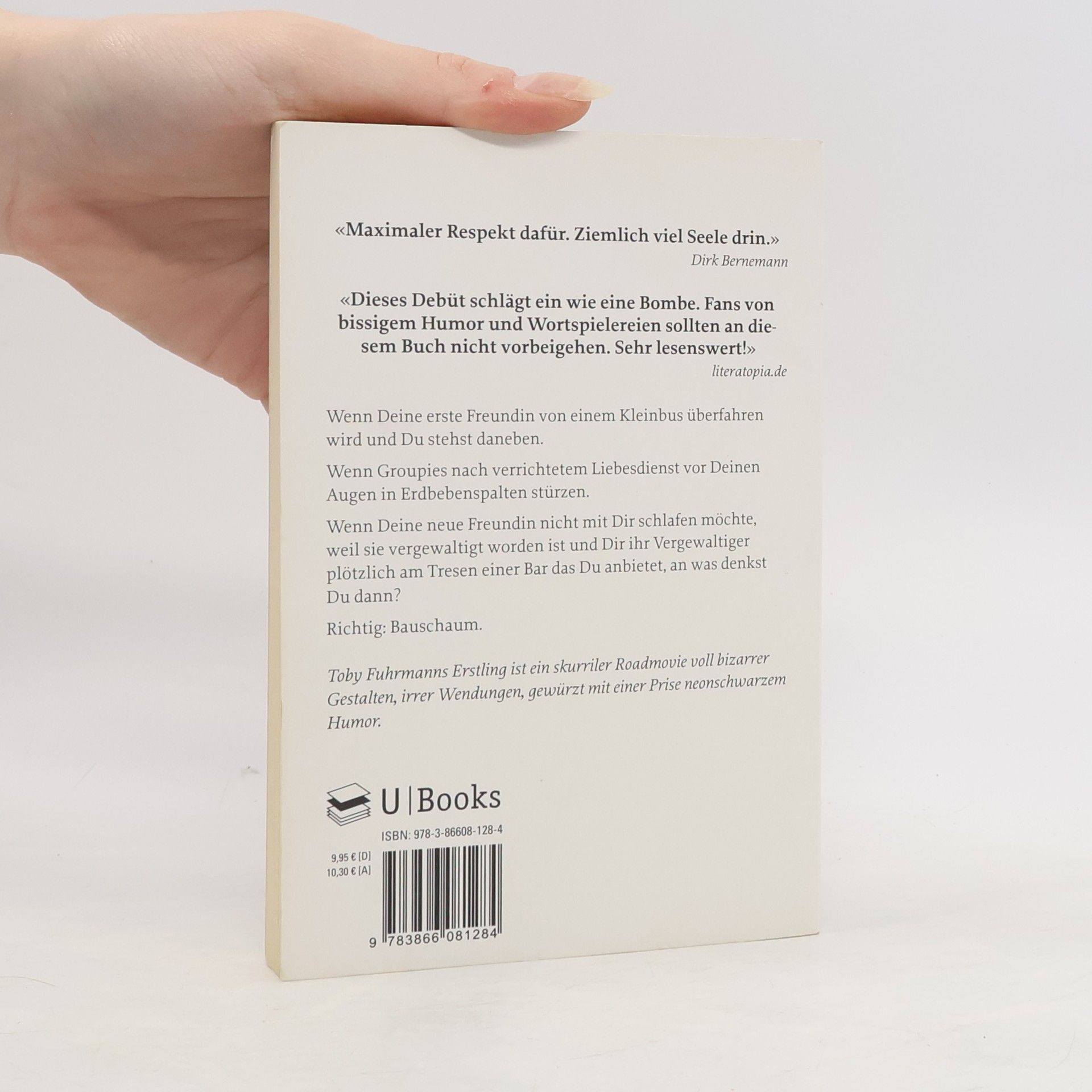 Wenn Deine erste Freundin von einem Kleinbus überfahren wird und du stehst daneben. Wenn Groupies nach verrichtetem Liebesdienst vor deinen Augen in Erdbebenspalten stürzen. Wenn deine neue Freundin nicht mir dir schlafen möchte, weil sie vergewaltigt worden ist und dir ihr Vergewaltiger plötzlich am Tresen einer Bar das Du anbietet, an was denkst du dann? Richtig: Bauschaum. Toby Fuhrmann erschuf mit seinem Erstling ein skuriles Roadmovie voll bizarrer Gestalten, irrer Wendungen, gewürzt mit einer Prise neonschwarzem Humor.