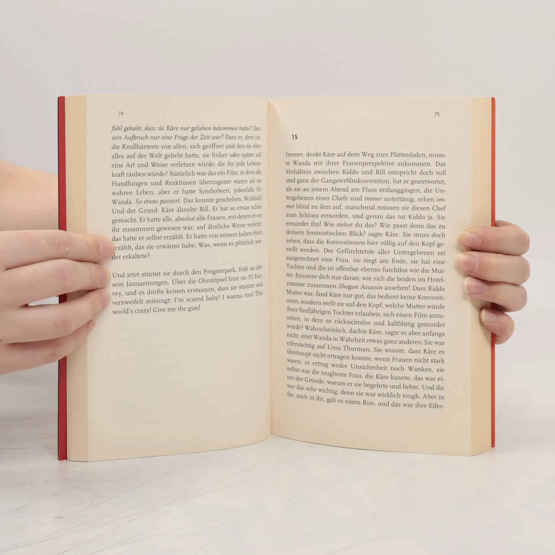 Sigrid liebt Magnus, der mit seiner neuen Liebe Linnea nach Prag gereist ist. Sigrids Idol, der Schriftsteller Kåre Tryvle, ist zu einem Vortrag nach Bergen gekommen und verliebt sich in Sigrid. Aber nach der ersten gemeinsamen Nacht stellt er fest, daß er Wanda zurückhaben will, die Bassistin in einer Frauenrockband, von der er sich nach einem Streit getrennt hat. Es ging um Tarantinos Kill Bill 2 und um Uma Thurman, die in Teil 1 viel tougher war. Tough wollen sie sein, weil es dann einfacher ist, das Leben zu meistern: Sigrid und Wanda, aber auch Linnea, die Regisseurin. Doch was passiert, wenn Stärke sich in Schwäche verwandelt? In eine Schwäche für Männer? Dürfen wir sein, wie wir sind, fragt sich Sigrid, oder müssen wir uns in zu großen Männerhemden verstecken, um verletzlich auszusehen und geliebt zu werden? Und warum greift selbst Sofia Coppolas Lost in Translation zu diesem Trick? „Du liebe Güte, was für ein Buch! Einfallsreich und lebendig, in Sprache wie Handlung. Der norwegische Roman des Jahres! Die Lektüre ein pures Fest.“ Aftenposten