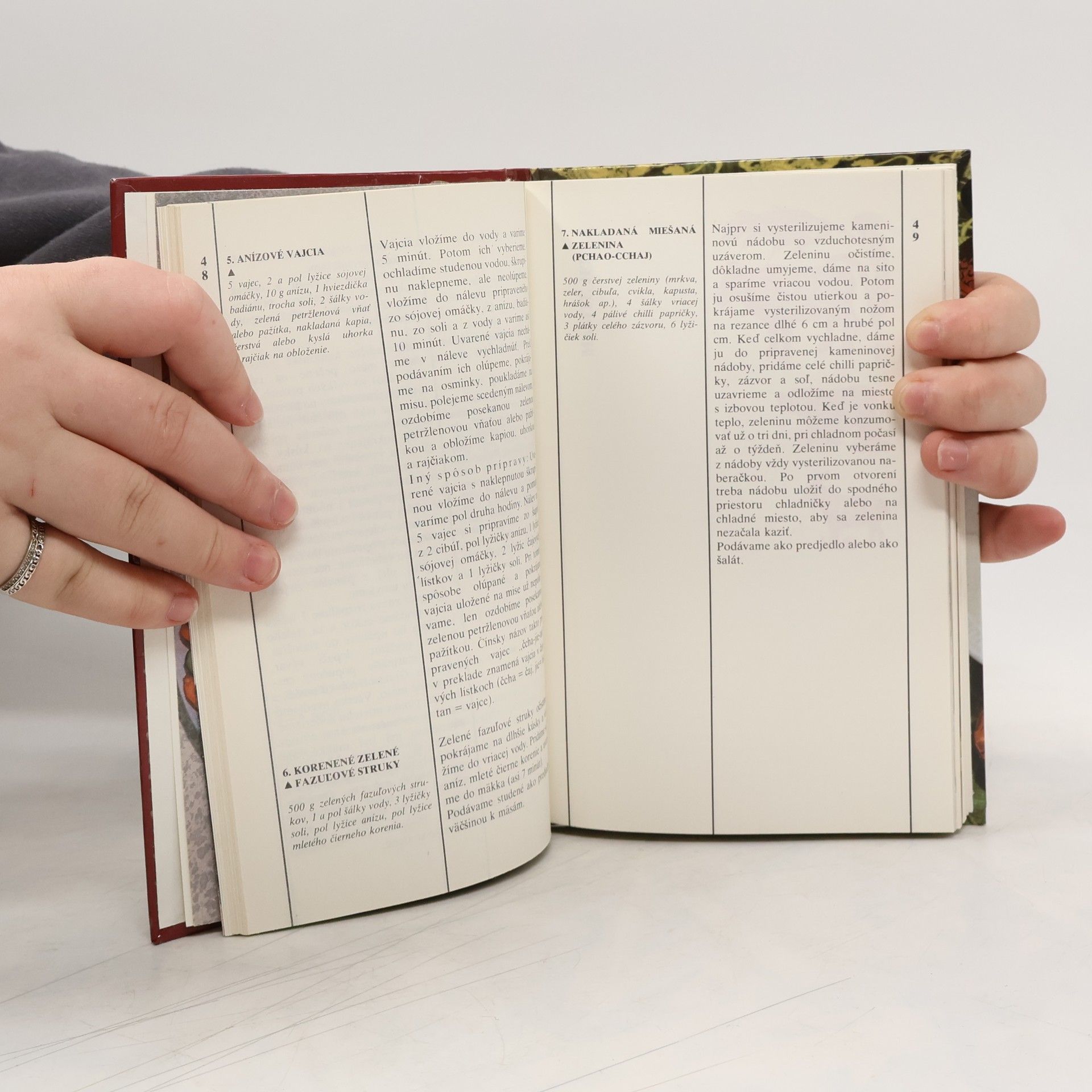 Obsah: O čínskej kuchyni všeobecne i zaujímavo, Najznámejšie čínske kuchyne, Názvy čínskych jedál, Z histórie i zo súčasnosti, Z čoho a ako sa varí v Číne a ako to budeme robiť u nás, Najdôležitejšie čínske suroviny, koreniny a prípravky, Krájanie mäsa, Kuchynský riad a tepelná úprava, Desatoro pred varením, Na začiatok-ako bez problémov a rýchlo uvariť ryžu. Predjedlá, Mäsité jedlá, Kurča a kačka, Ryby, Jedlá s menším množstvom mäsa, Bezmäsité jedlá, Polievky, Múčniky, Ako stolovať po čínsky, Pár slov o čaji.