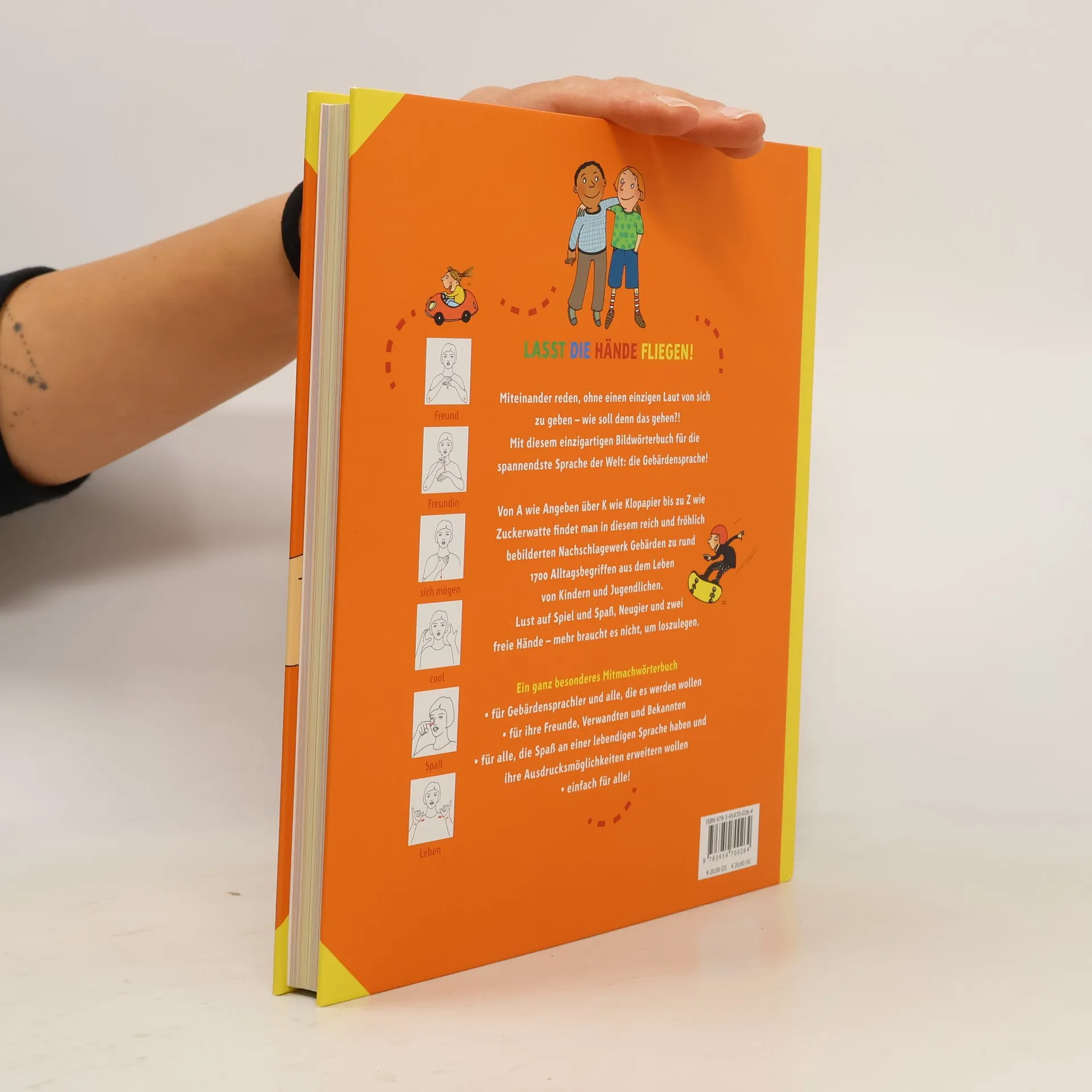 Lust auf Spaß und Spiel, Neugier und zwei freie Hände – mehr braucht es nicht für dieses einzigartige Mitmach-Wörterbuch der Gebärdensprache. Von A wie Angeben über K wie Klopapier bis Z wie Zuckerwatte sind hier rund 1700 Alltagsbegriffe versammelt. Sämtliche Themen, die Menschen ab etwa 7 Jahren umtreiben, werden hier in wunderbar quirligen Wimmelbildern dargestellt, umrahmt von den dazugehörenden Gebärden-Zeichnungen. Wer dieses Buch betrachtet, kann nicht still sitzen bleiben. Ein Bildwörterbuch der spannendsten Sprache der Welt – für alle! Preise & Auszeichnungen: Leselotse der Zeitschrift Buchjournal im Oktober 2010