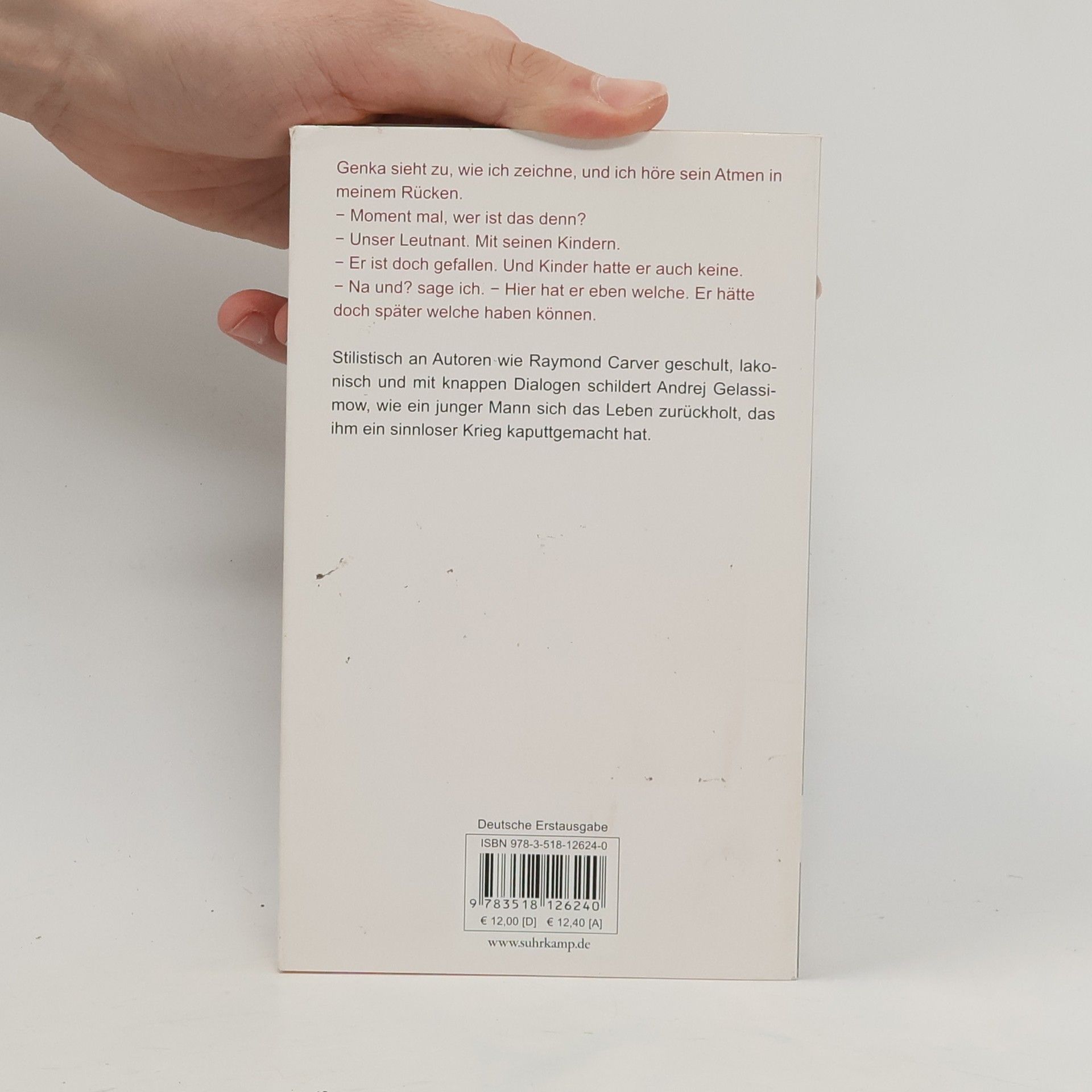 Kostja kommt entstellt aus Tschetschenien zurück, bei einem Raketenangriff wurde sein Gesicht bis zur Unkenntlichkeit verbrannt. In Moskau vergräbt er sich, säuft Wodka und zeichnet. Nur seine Nachbarin holt ihn gelegentlich aus seinem Kokon: Er soll ihrem Sohn Angst einjagen, wenn der mal wieder nicht ins Bett will. Eines Tages tauchen zwei ehemalige Kameraden bei ihm auf, sie suchen Sergej, der sie aus dem brennenden Panzer gezogen hat. Gemeinsam begeben sie sich auf eine Odyssee durch ein Land, dessen Menschen vom vergessenen Krieg im Kaukasus traumatisiert sind. Der lakonisch erzählte, stilistisch an Autoren wie Raymond Carver geschulte Kurzroman gilt als Schlüsseltext der russischen Gegenwartsliteratur.
