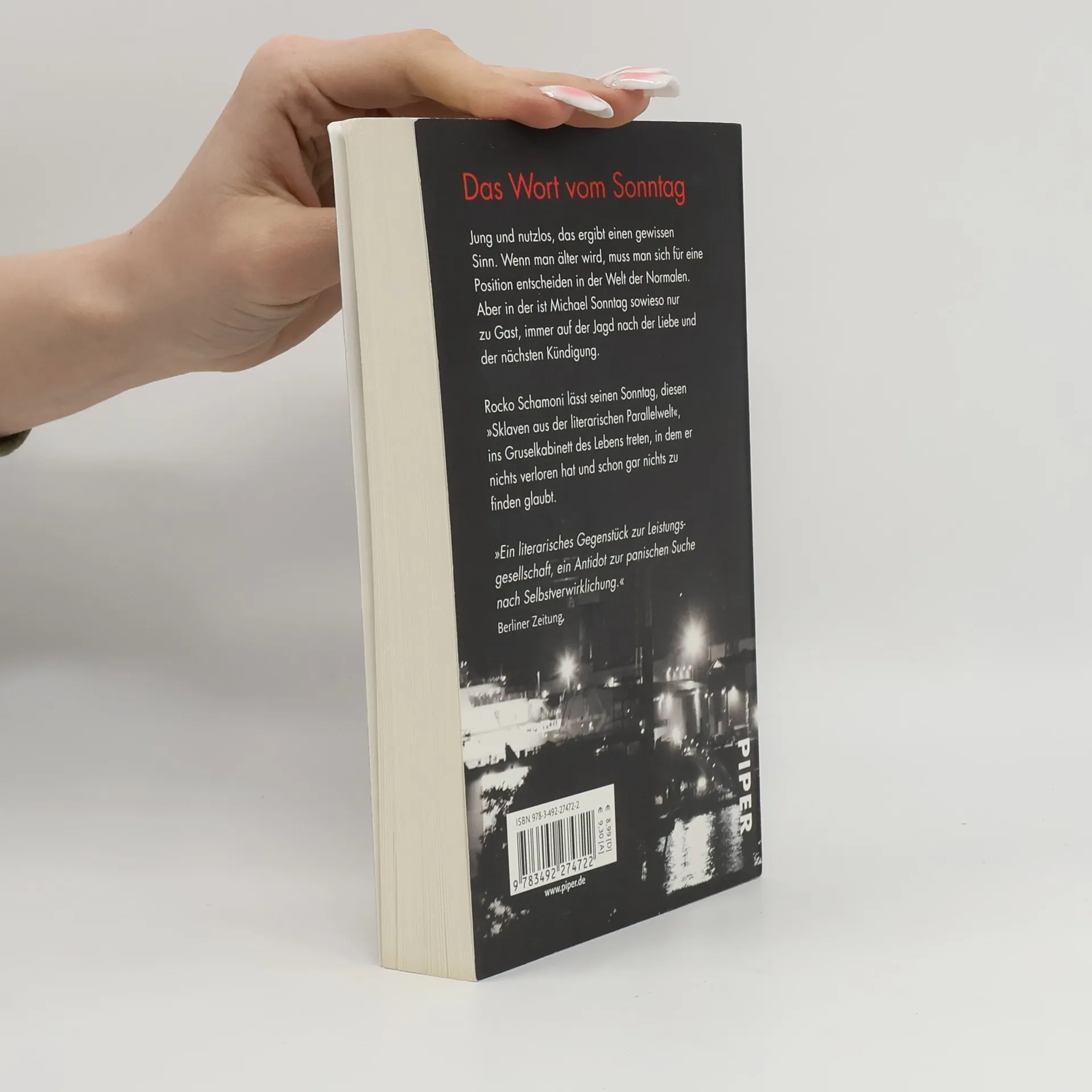 Unbeirrt treibt Michael Sonntag durch seine Tage, sein Körper zeigt erste Gebrauchsspuren, und die großen Gedanken machen gewöhnlich einen Bogen um ihn. Entgegen den Erwartungen, die seine Umwelt an ihn stellt, verweigert Sonntag gern jede daseinserhaltende Tätigkeit. Nur seinem Freund Novak gelingt es hin und wieder, ihn mit hirnrissigen Geschäftsideen aus der Reserve zu locken. Und natürlich Marion Vossreuther, der Servicekraft aus dem Handyladen, die einen ganz eigenen Reiz auf ihn ausübt. Entschlossen geht Rocko Schamonis Held Sonntag den Erfordernissen des Lebens aus dem Weg. Und dabei fordert der Irrsinn unserer Existenz seine Unerschrockenheit und seinen Witz öfter heraus, als ihm lieb sein kann.