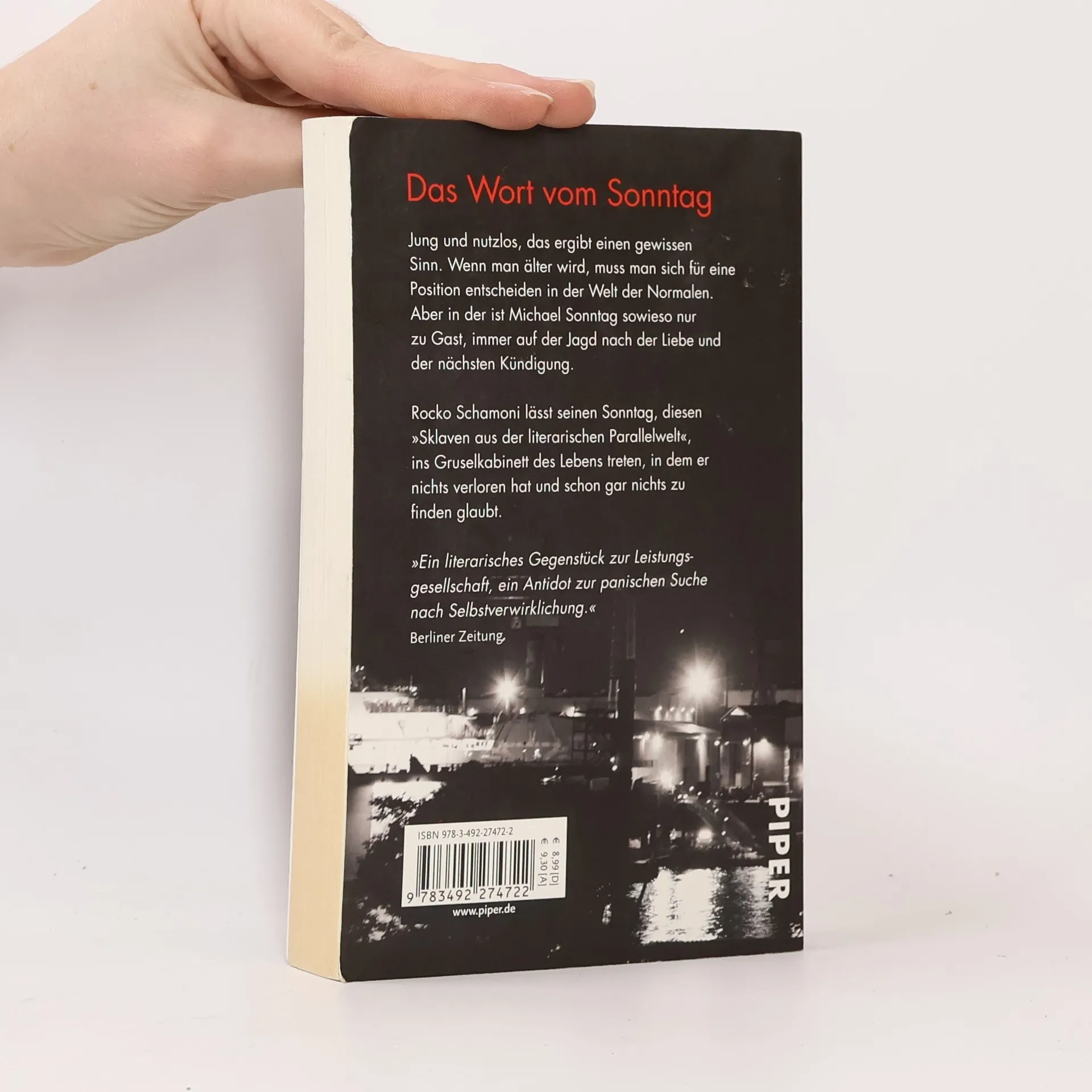 Unbeirrt treibt Michael Sonntag durch seine Tage, sein Körper zeigt erste Gebrauchsspuren, und die großen Gedanken machen gewöhnlich einen Bogen um ihn. Entgegen den Erwartungen, die seine Umwelt an ihn stellt, verweigert Sonntag gern jede daseinserhaltende Tätigkeit. Nur seinem Freund Novak gelingt es hin und wieder, ihn mit hirnrissigen Geschäftsideen aus der Reserve zu locken. Und natürlich Marion Vossreuther, der Servicekraft aus dem Handyladen, die einen ganz eigenen Reiz auf ihn ausübt. Entschlossen geht Rocko Schamonis Held Sonntag den Erfordernissen des Lebens aus dem Weg. Und dabei fordert der Irrsinn unserer Existenz seine Unerschrockenheit und seinen Witz öfter heraus, als ihm lieb sein kann.