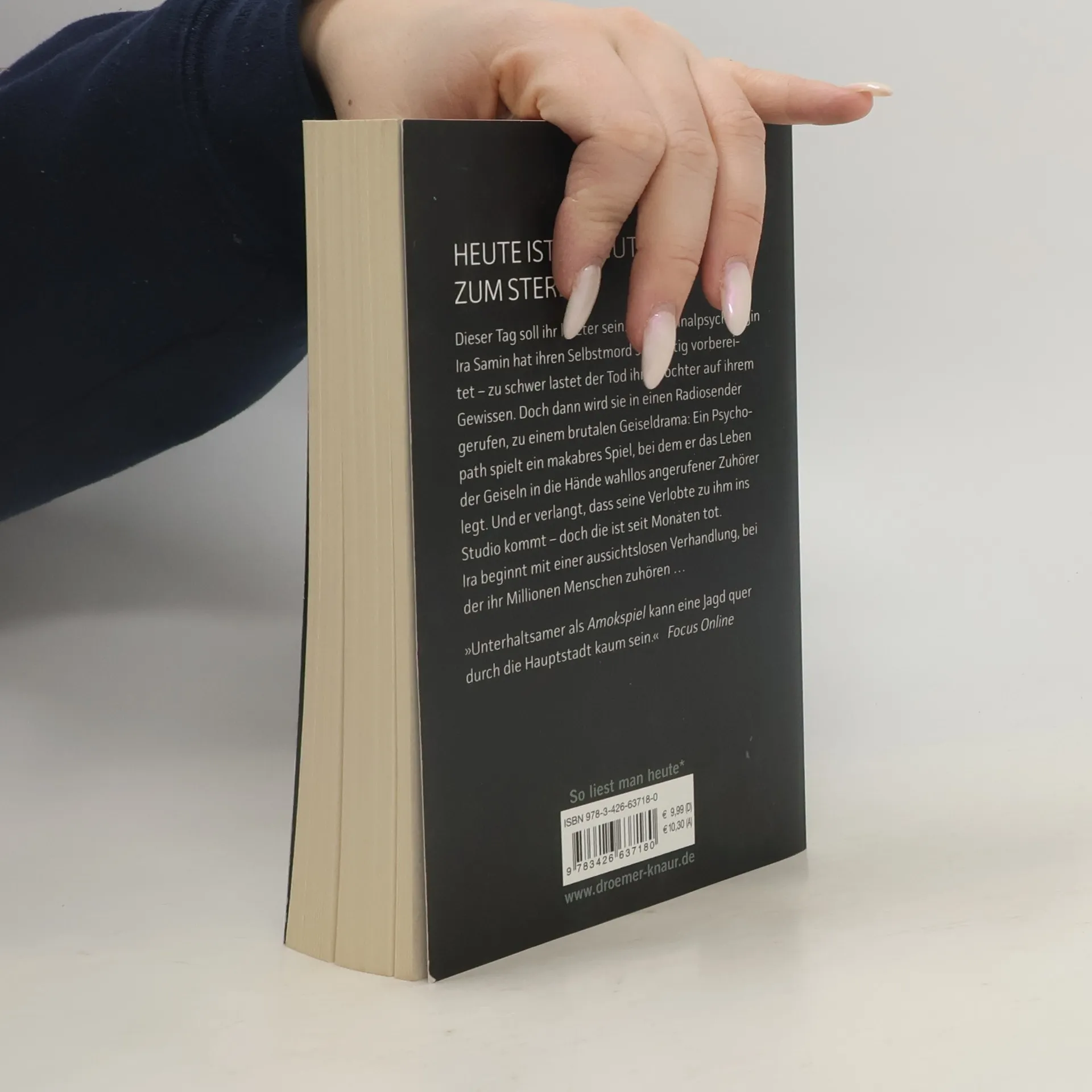 Heute ist ein guter Tag zum Sterben Dieser Tag soll ihr letzter sein. Die renommierte Kriminalpsychologin Ira Samin hat ihren Selbstmord sorgfältig vorbereitet. Zu schwer lastet der Tod ihrer ältesten Tochter auf ihrem Gewissen. Doch dann wird sie zu einem brutalen Geiseldrama in einem Radiosender gerufen. Ein Psychopath spielt ein makaberes Spiel: Bei laufender Sendung ruft er wahllos Menschen an. Melden die sich am Telefon mit einer bestimmten Parole, wird eine Geisel freigelassen. Wenn nicht, wird eine erschossen. Der Mann droht, so lange weiterzuspielen, bis seine Verlobte zu ihm ins Studio kommt. Doch die ist seit Monaten tot. Ira beginnt mit einer aussichtslosen Verhandlung, bei der ihr Millionen Menschen zuhören …