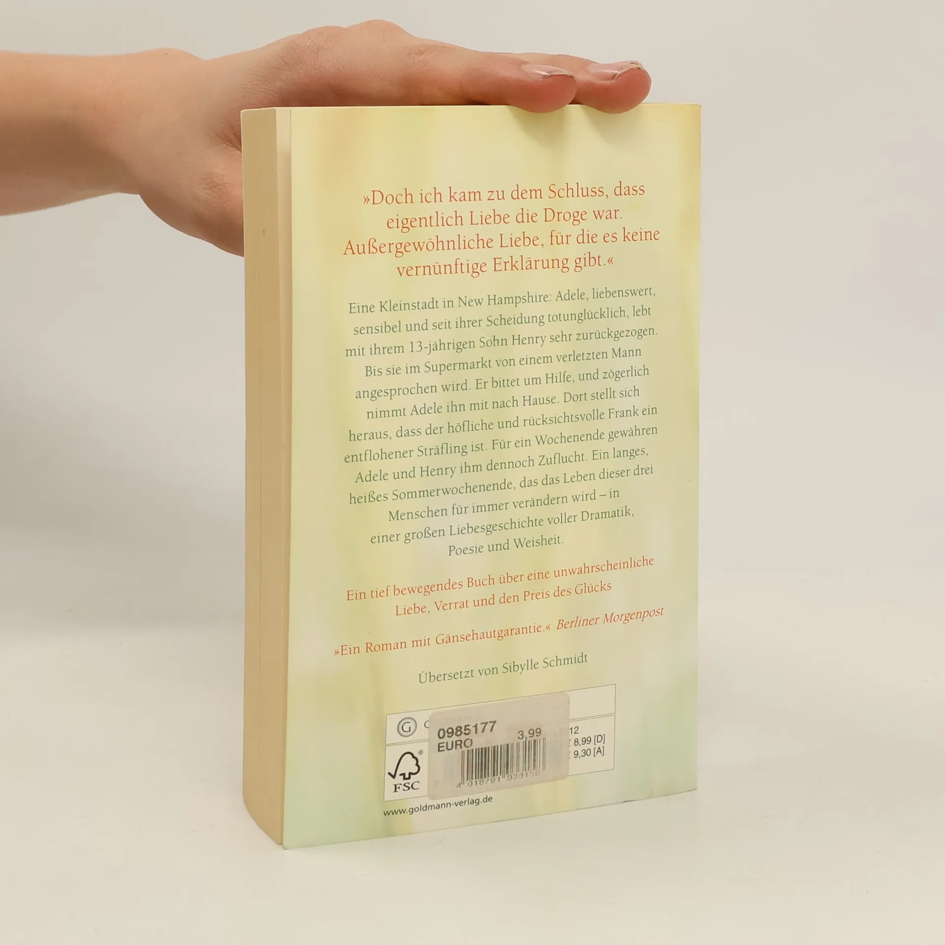 Ein tief bewegendes Buch über eine unwahrscheinliche Liebe, Verrat und den Preis des Glücks. Eine Kleinstadt in New Hampshire: Adele, liebenswert, sensibel und seit ihrer Scheidung todunglücklich, lebt mit ihrem 13-jährigen Sohn Henry sehr zurückgezogen in einem kleinen Haus. Bis Henry sie zu einem Einkaufstrip überredet, der ihrer beider Leben für immer verändern wird. Denn im Supermarkt wird Henry von einem verletzten Mann angesprochen. Er bittet um Hilfe, und Adele nimmt ihn mit nach Hause. Dort stellt sich heraus, dass der höfliche und rücksichtsvolle Frank ein entflohener Sträfling ist. Für ein Wochenende gewähren die beiden ihm Zuflucht. Und während Henry in Frank den lange vermissten Vaterersatz findet, entwickelt sich zwischen Frank und Adele eine zarte, innige Liebe. Eine Liebe, für die sie einen hohen Preis zahlen werden.