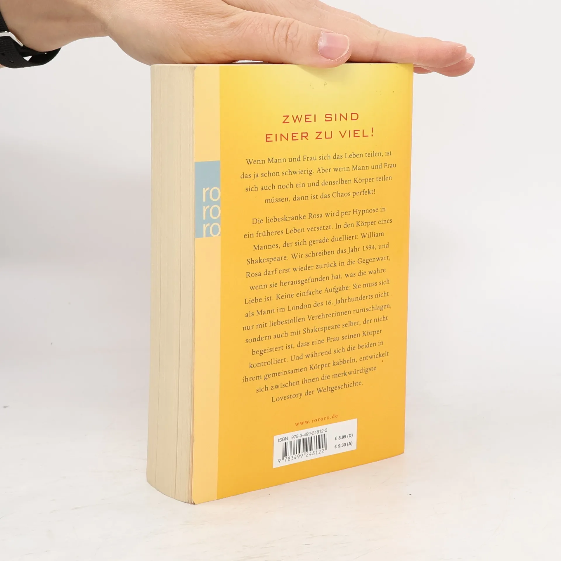 ZWEI SIND EINER ZU VIEL! Wenn Mann und Frau sich das Leben teilen, ist das ja schon schwierig. Aber wenn Mann und Frau sich auch noch ein und denselben Körper teilen müssen, dann ist das Chaos perfekt! Die liebeskranke Rosa wird per Hypnose in ein früheres Leben versetzt. In den Körper eines Mannes, der sich gerade duelliert: William Shakespeare. Wir schreiben das Jahr 1594, und Rosa darf erst wieder zurück in die Gegenwart, wenn sie herausgefunden hat, was die wahre Liebe ist. Keine einfache Aufgabe: Sie muss sich als Mann im London des 16. Jahrhunderts nicht nur mit liebestollen Verehrerinnen rumschlagen, sondern auch mit Shakespeare selber, der nicht begeistert ist, dass eine Frau seinen Körper kontrolliert. Und während sich die beiden in ihrem gemeinsamen Körper kabbeln, entwickelt sich zwischen ihnen die merkwürdigste Lovestory der Weltgeschichte.
