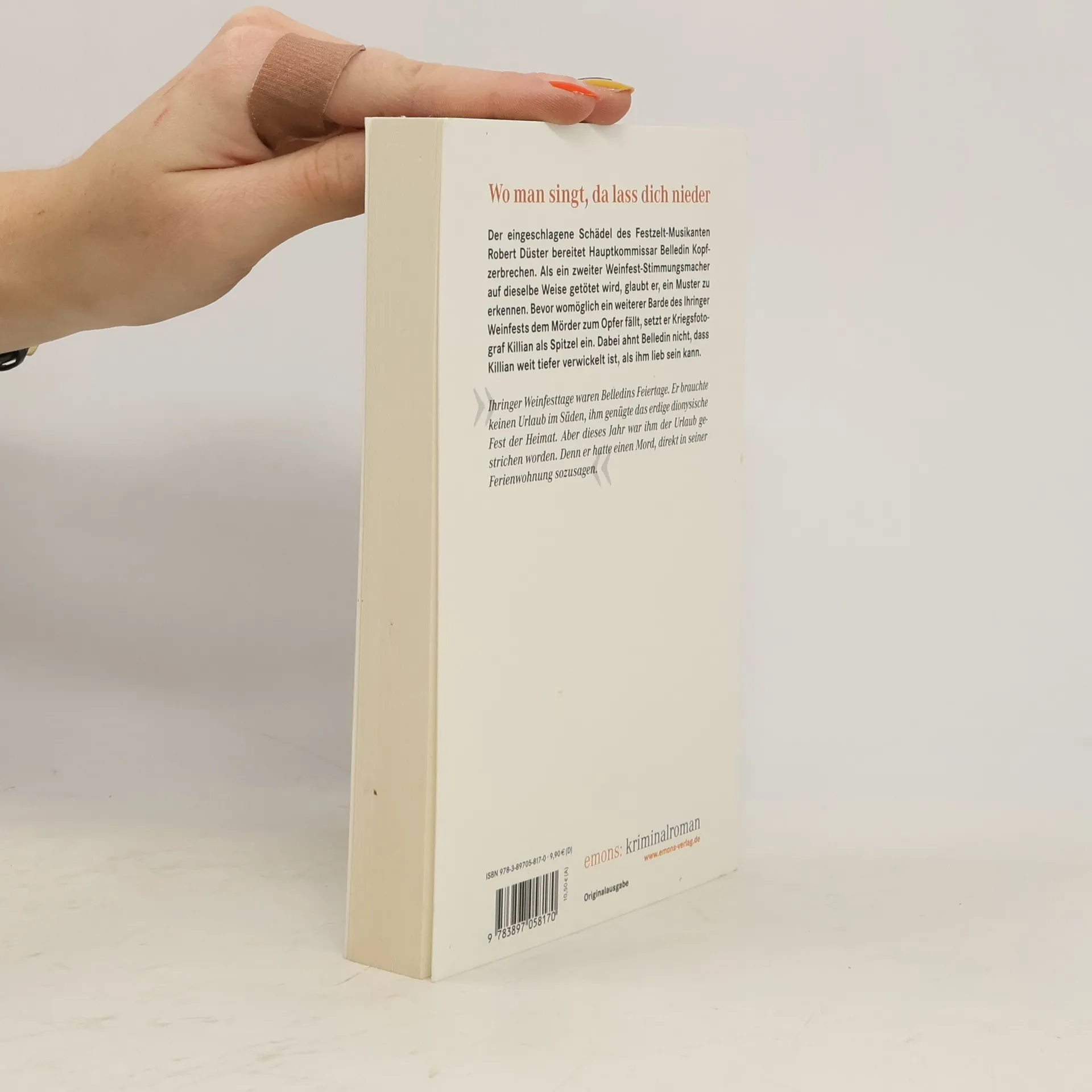 Der eingeschlagene Schädel des Alleinunterhalters Robert Düster bereitet Hauptkommissar Belledin Kopfzerbrechen. Als ein zweiter Weinfest-Stimmungsmacher auf dieselbe Weise getötet wird, glaubt er, ein Muster zu erkennen. Bevor womöglich ein weiterer Barde des Ihringer weinfestes dem Mörder zum Opfer fällt, setzt er Kriegsfotograf Killian als Spitzel ein. Dabei ahnt Belledin nicht, dass Killian weit tiefer verwickelt ist, als ihm lieb ist.