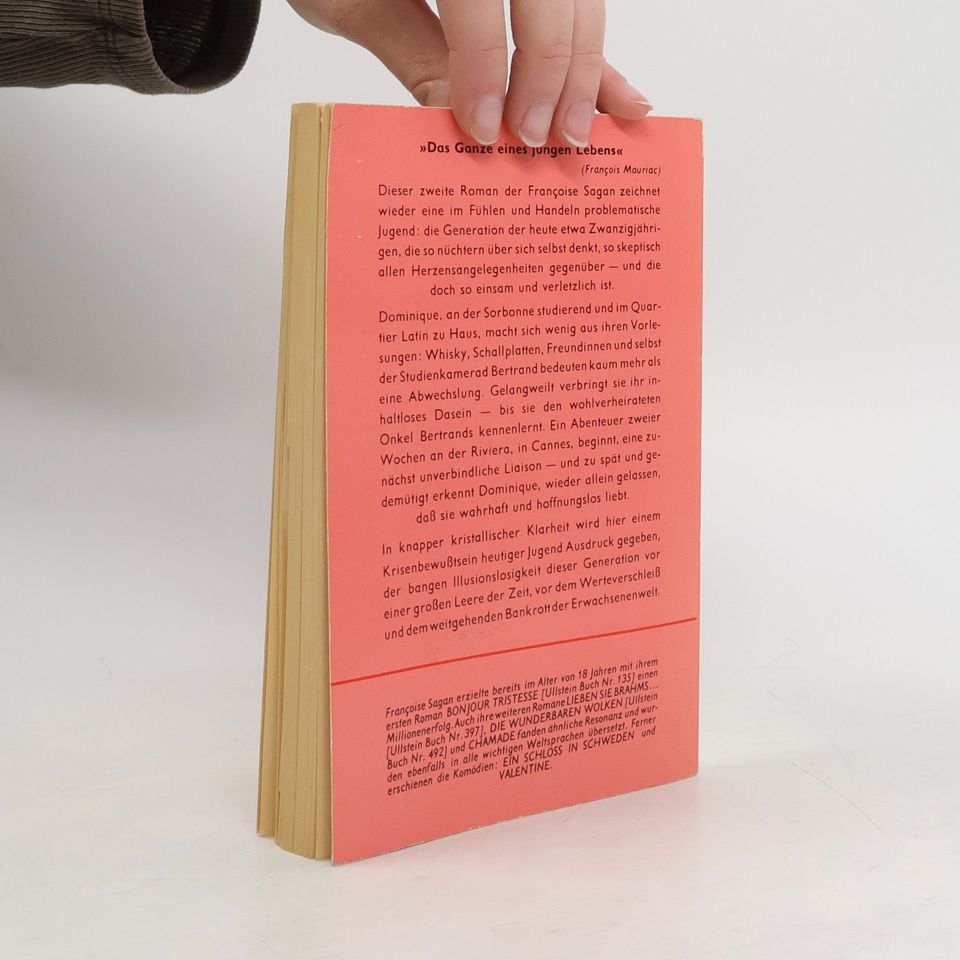 Die junge Dominique studiert ohne rechte Überzeugung an der Sorbonne in Paris und ist ebenso wenig enthusiastisch mit ihrem Kommilitonen Bertrand liiert. Das Studentenleben fließt träge und angenehm ziellos dahin, bis Dominique Bertrands Onkel Luc kennenlernt. Der ist zwar glücklich verheiratet, aber dennoch einem kleinen Abenteuer nicht abgeneigt, und nach einigem skrupulösen Zögern verbringt Dominique zwei sommerlich heiße Liebeswochen mit ihm an der Riviera. Als sie bemerkt, dass sie sich wirklich verliebt hat, ist es bereits zu spät. Natürlich kehrt Luc zu seiner Frau zurück und natürlich hat die Beziehung zu Bertrand keine Zukunft … Ein schöner, junger, zeitloser Liebeskummerroman mit der sinnlichen Melancholie des französischen Existentialismus.