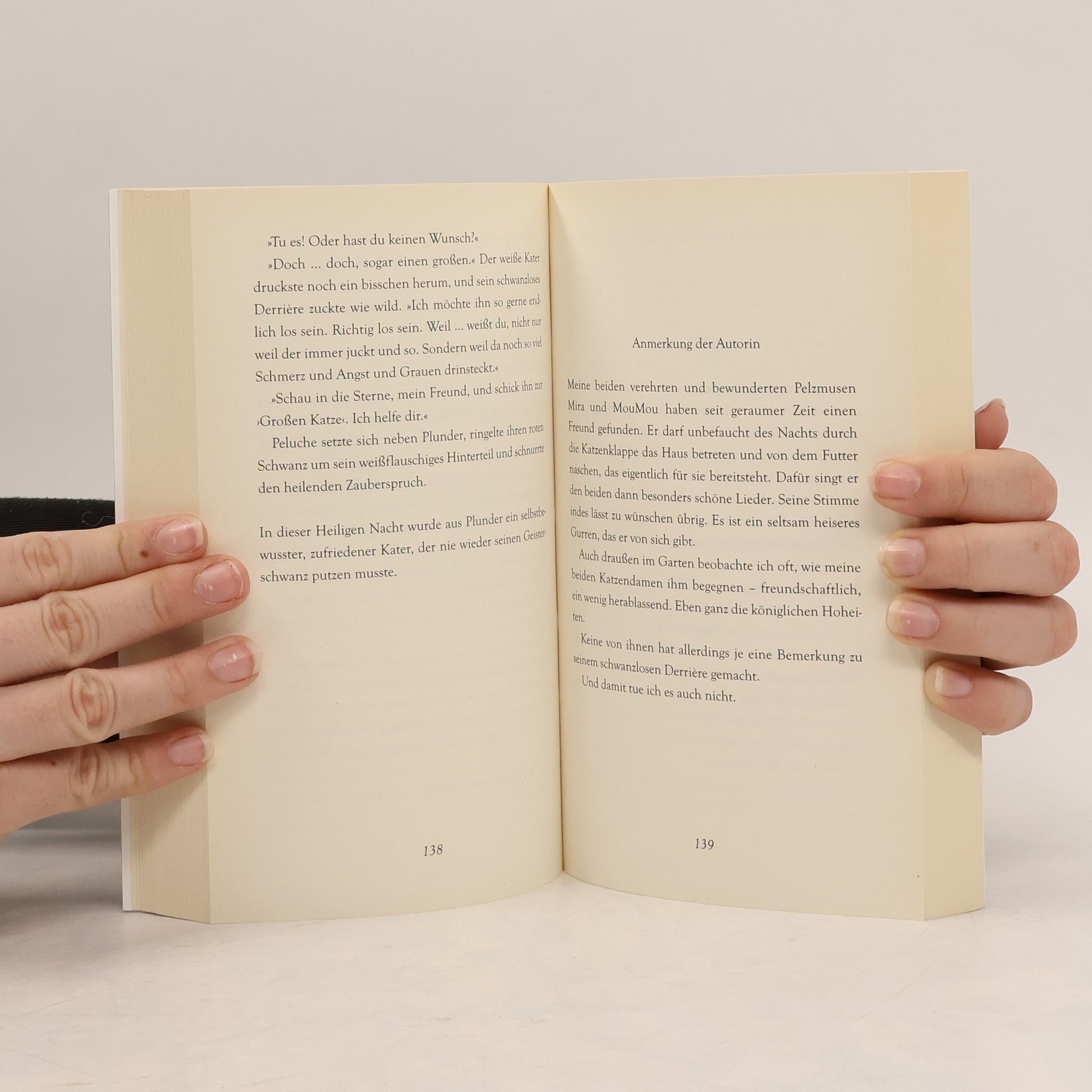 Weihnachten ist das Fest der Liebe – und der Katzen. So bringt Raufer, ein ausgewiesener Straßenkater, Kris, seinem neuen Herrn, bei, was Weihnachten ist. Und die Katzen Plüsch und Plunder behalten in dem Antiquitätenladen, den sie hüten, selbst im größten Weihnachtsstress die Übersicht. Weihnachten mit Plüsch und Plunder - Ginger, eine junge rothaarige Frau, erbt von ihrer Patentante einen Antiquitätenladen – und eine Menge Probleme. Doch zum Glück hat sie ihre Katzen Plüsch und Plunder, die auch im größten Weihnachtsstress die Übersicht behalten. Und dann taucht kurz vor dem Fest auch noch ein Mann im Laden auf, der nicht nur die beiden Katzen hinreißend findet. Weihnachtskatz und Mäusespeck - Als Kris sich kurz vor Weihnachten auf einen handfesten Streit einlässt, hat der junge Mann plötzlich ein Problem: Bei der Schlägerei wird Raufer, ein Straßenkater, verletzt, und er muss sich um das Tier kümmern. Was soll Kris mit einer Katze anfangen? Doch bald erkennt er, dass Raufer kein gewöhnlicher Kater ist.