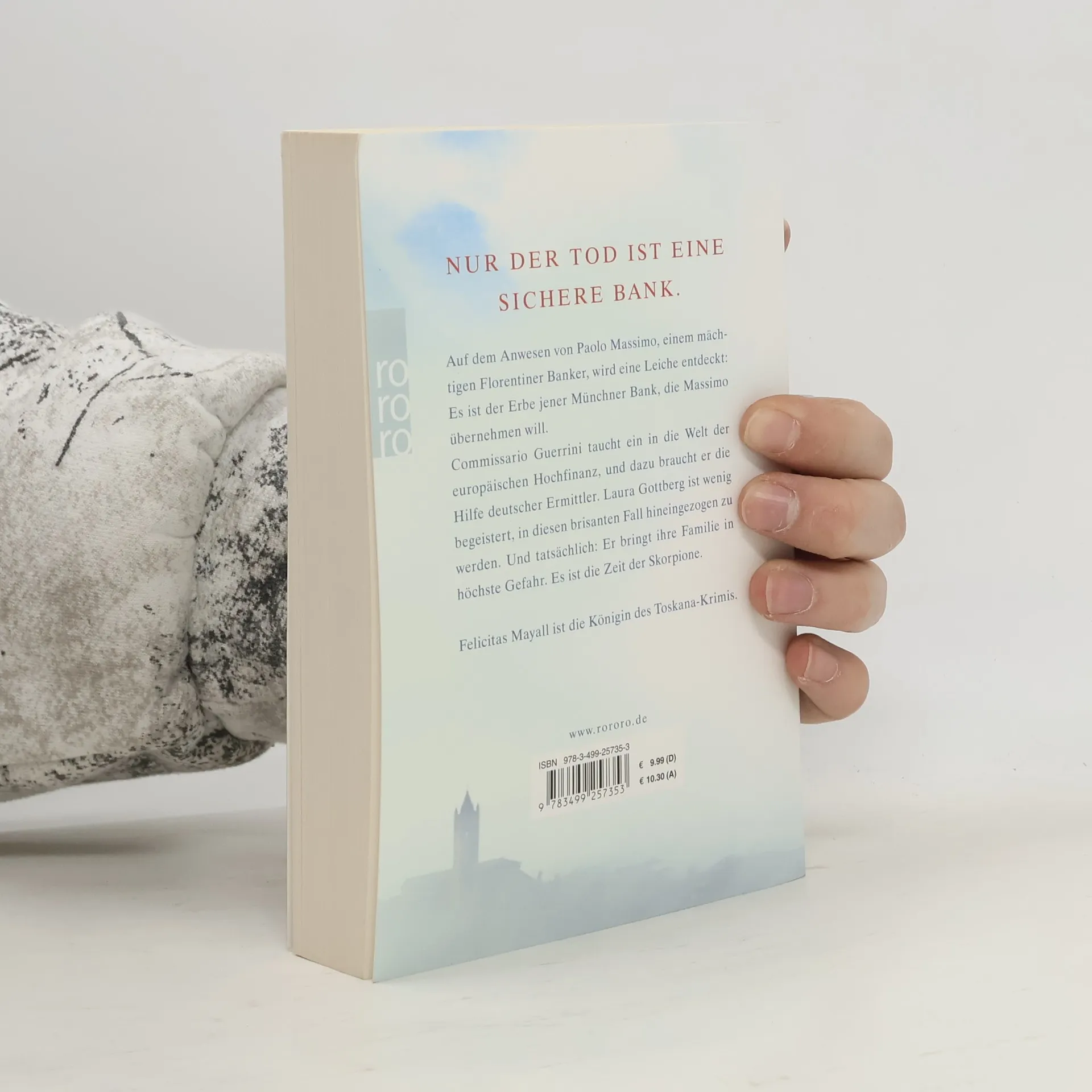 Nur der Tod ist eine sichere Bank Auf dem Anwesen von Paolo Massimo, einem mächtigen Florentiner Banker, wird eine Leiche entdeckt: Es ist der Erbe jener Münchner Bank, die Massimo übernehmen will. Commissario Guerrini taucht ein in die Welt der europäischen Hochfinanz, und dazu braucht er die Hilfe deutscher Ermittler. Laura Gottberg ist wenig begeistert, in diesen brisanten Fall hineingezogen zu werden. Und tatsächlich: Er bringt ihre Familie in höchste Gefahr. Es ist die Zeit der Skorpione. Felicitas Mayall ist die Königin des Toskana-Krimis.