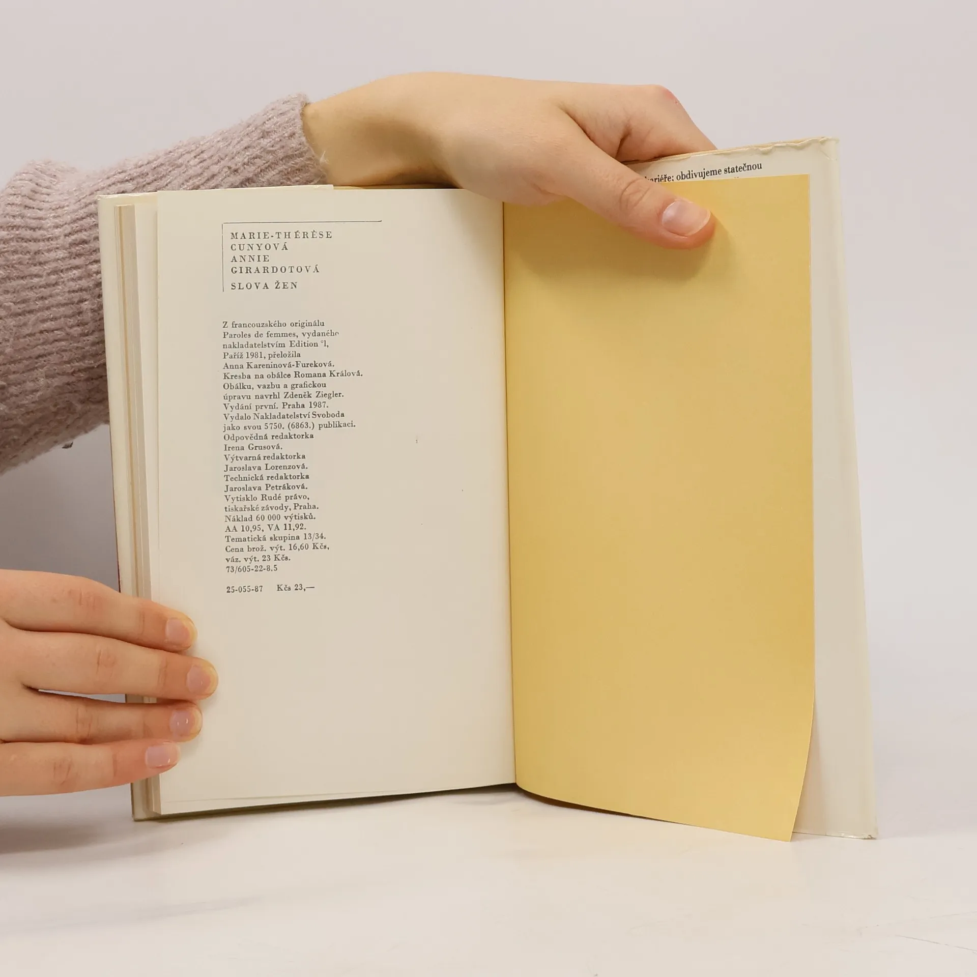 U nás dobře známá francouzská herečka Annie Girardotová četla svého času v rozhlase na stanici Europe 1 ráno co ráno po jednom příběhu žen své doby. Žen mladých, starých, svobodných i dlouhá léta vdaných, žen moderních i tradičních, které však mají jedno společné: ani jedna z nichnežije na úkor ostatních, ani jedna z nich není bohatě zajištěnou, znuděnou paničkou, jejíž jedinou činností je vymýšlet si problémy. Tyto ženy se musí potýkat s problémy skutečnými, ať už uvnitř rodiny, nebo spoločenskými, a každá z nich je řeší svým osobitým způsobem. Čtyřicet těchto příběhů pak Annie Girardotová za pomoci Marie Thérése Cunyové shromáždila v souboru Slova žen. Povídky mají čapkovské ladění, nelamentují, nedramatizují, snaží se porozumět lidem a v prostých věcech najít malá hrdinství i velké oběti.
